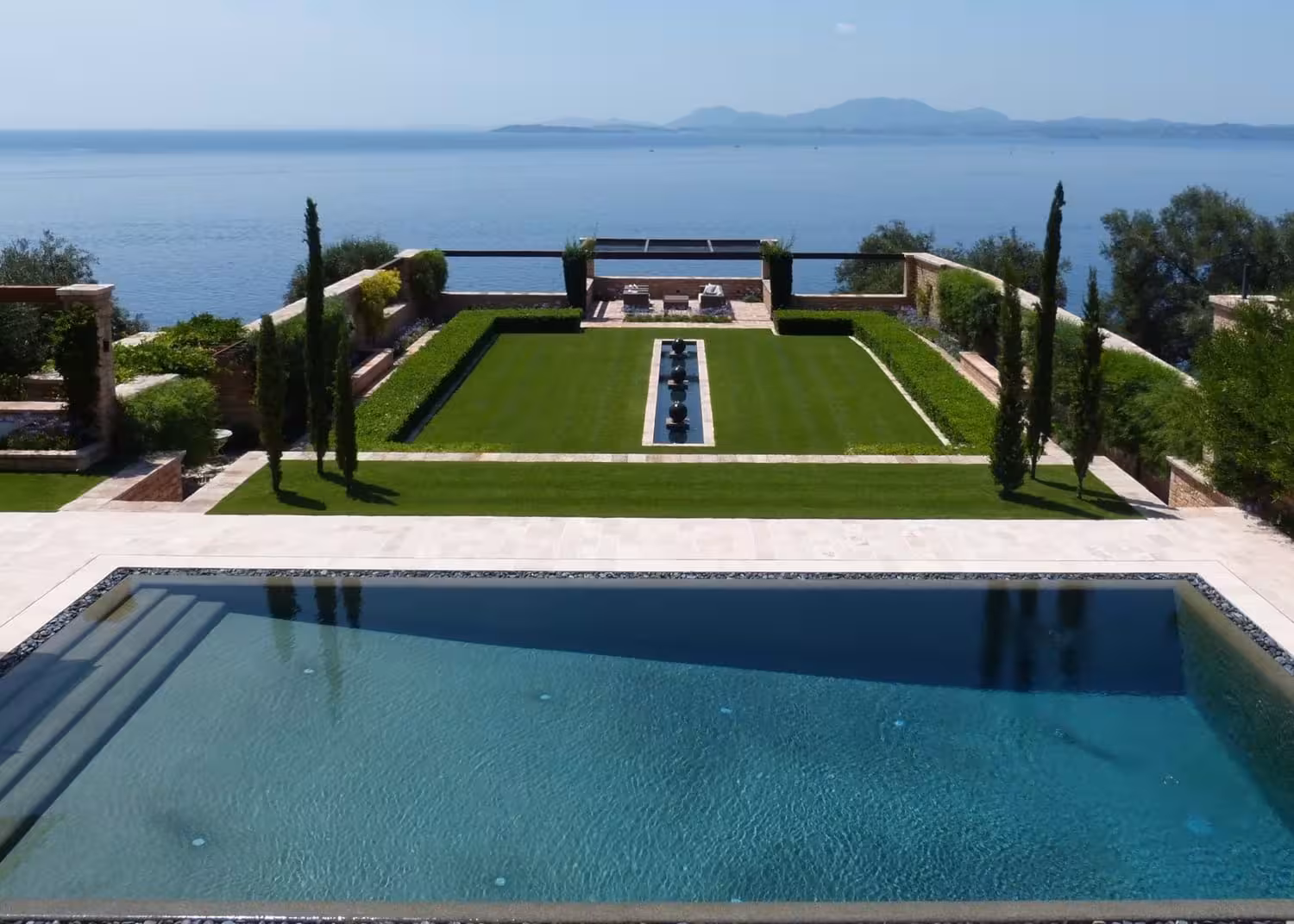 There are two en-suite double bedrooms and one master suite with dressing room. The second master suite occupies the first floor with a private balcony. Outdoors, guests enjoy a pristine pool, bar, and outdoor kitchen, as well as a private bathing platform and boat landing. Landscaped gardens and sea views complete the setting, just a short drive from San Stephano and Kassiopi.