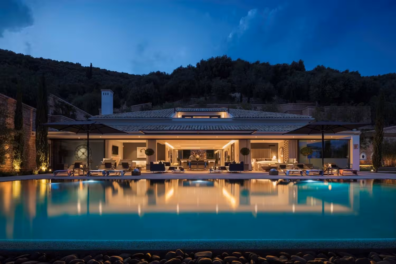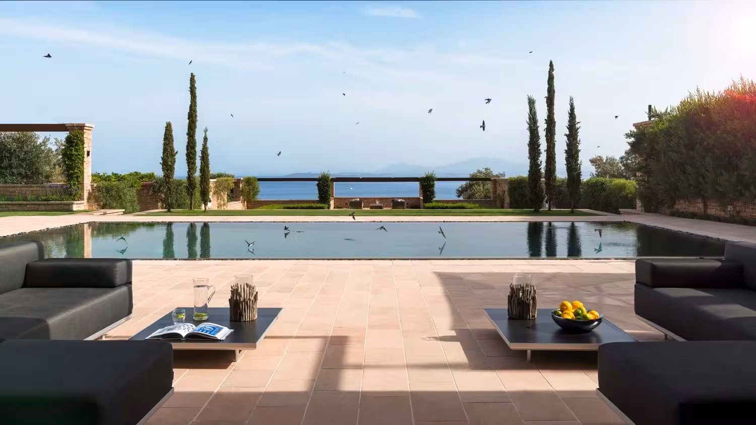 The beautiful Bay Estate, paired with the discreet and attentive house team, offers a truly luxurious and relaxing escape. The ground floor features a light-filled open-plan living/dining area, a fully equipped kitchen, and access to a pool terrace and shaded courtyard.