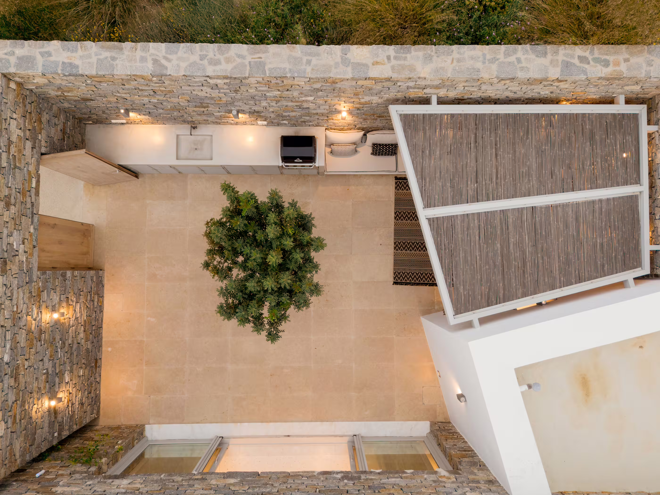 Upon entering, the stone walls and high-end glazed doors captivate immediately. A charming patio with a BBQ and lounge area seamlessly connects to the bright living room. The open-plan kitchen, with marble countertops and modern amenities, completes the space. Indoor and outdoor dining areas provide ideal settings for meals under the sun or stars. Soft curves and soothing tones in the living room perfectly frame the sea views.