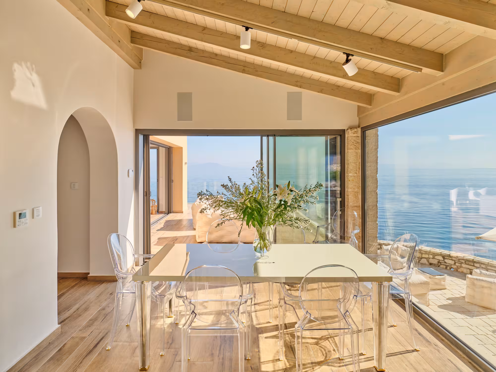 The estate sits on a hill, offering unobstructed views of the Ionian Sea. The peaceful surroundings are secluded yet not far from the nearest town. A contemporary villa blending traditional style with modern touches, featuring smart living controls for temperature, lighting, alarm, and music, all managed via a tablet by the poolside.