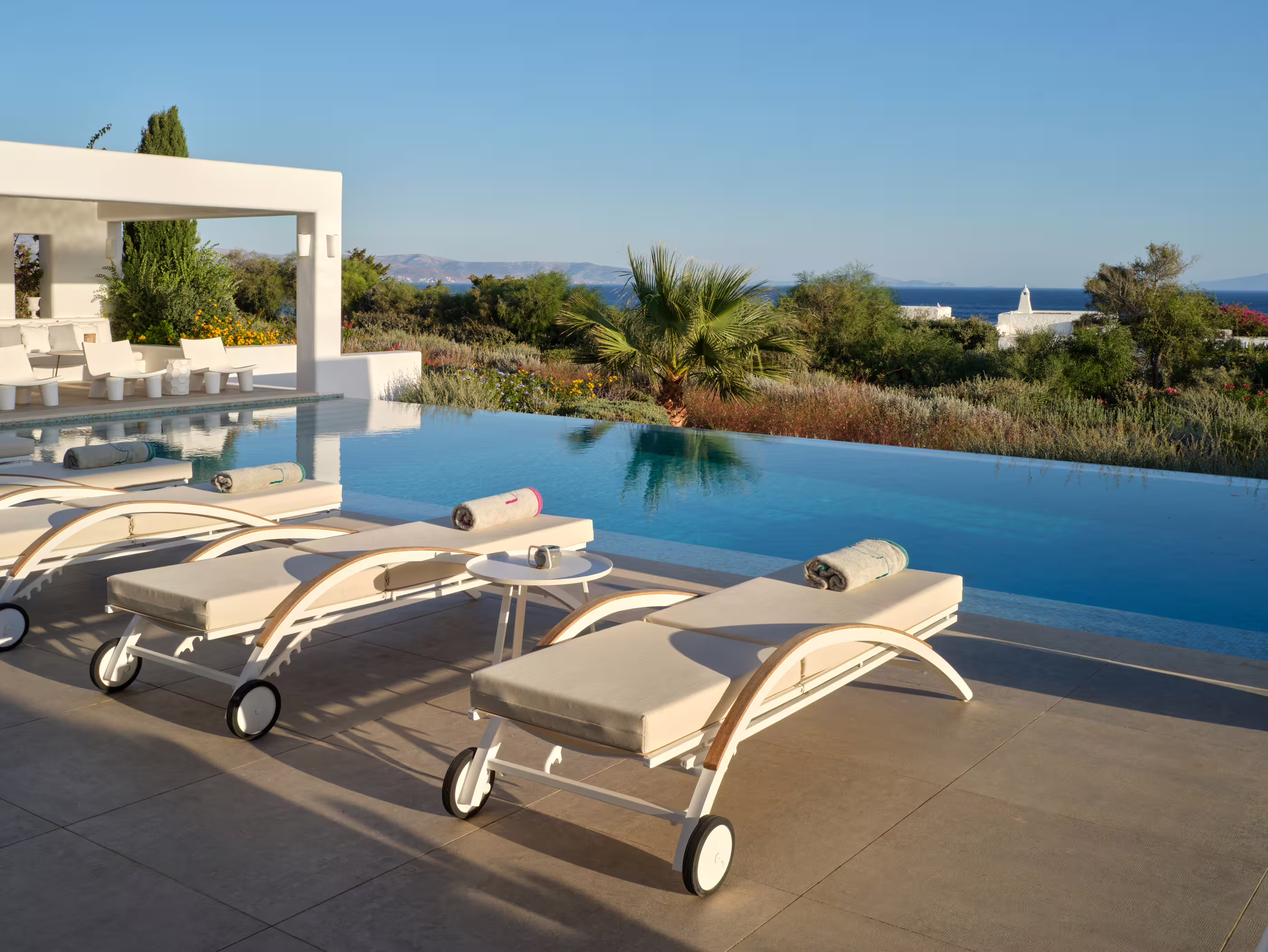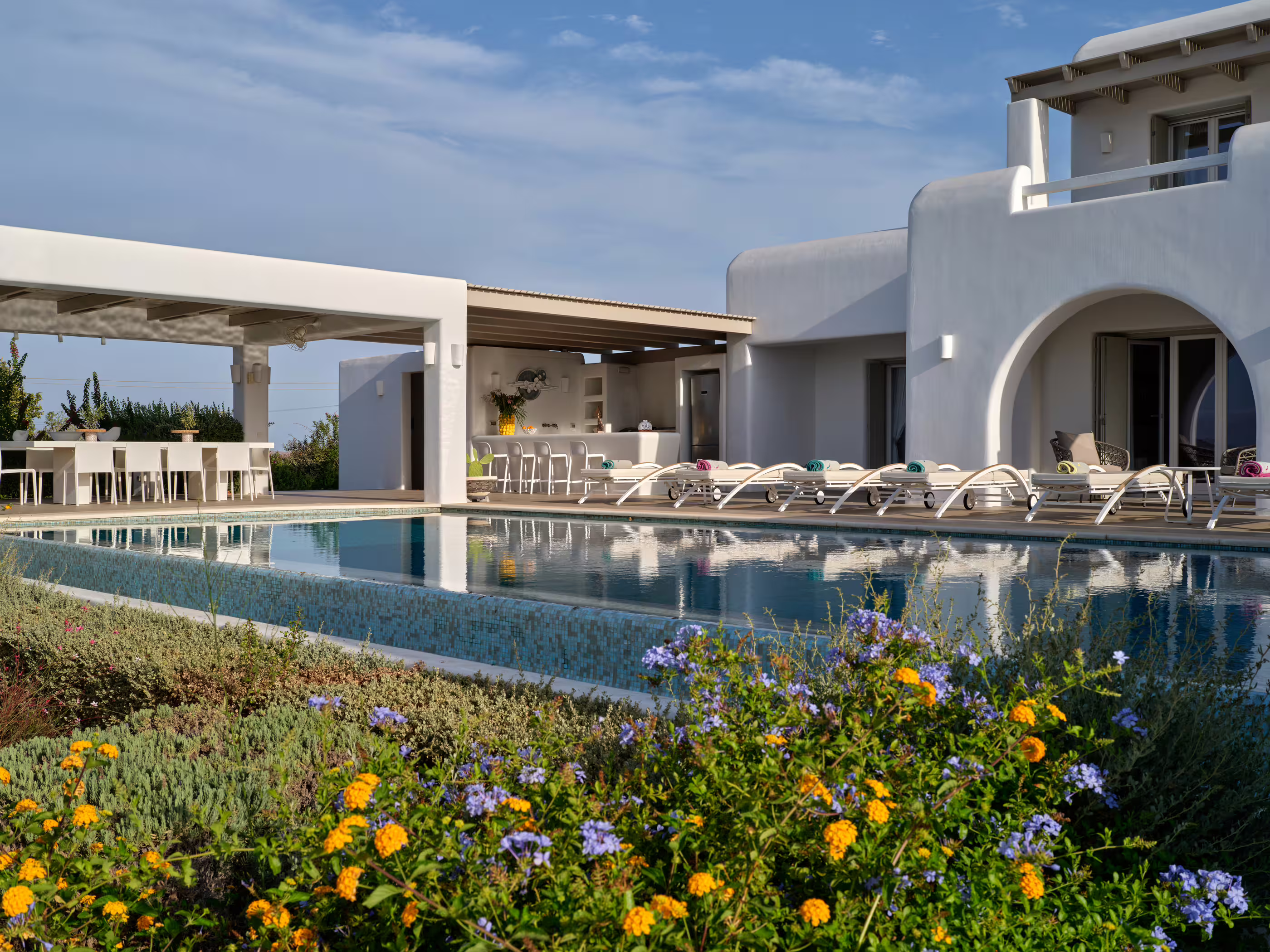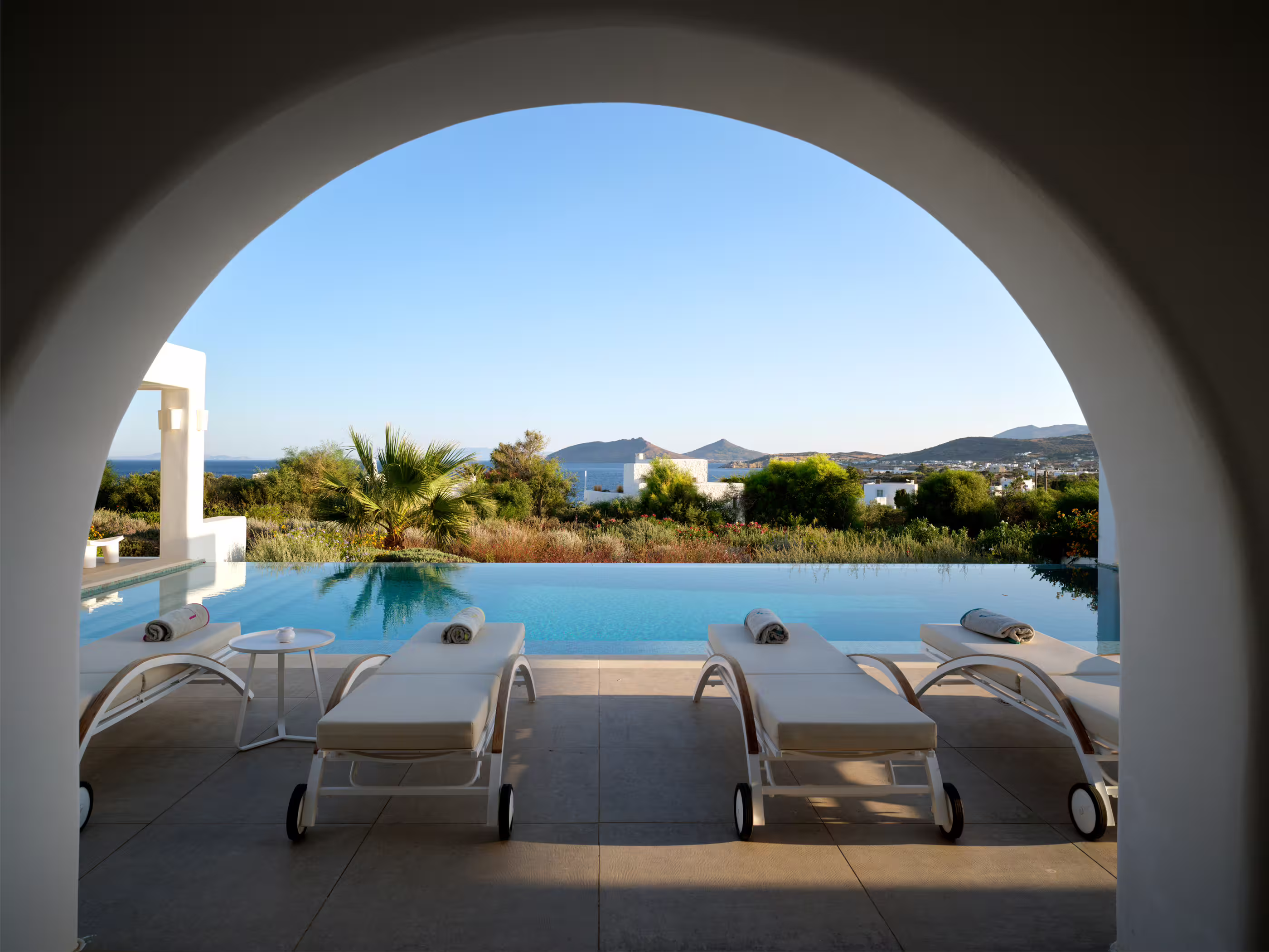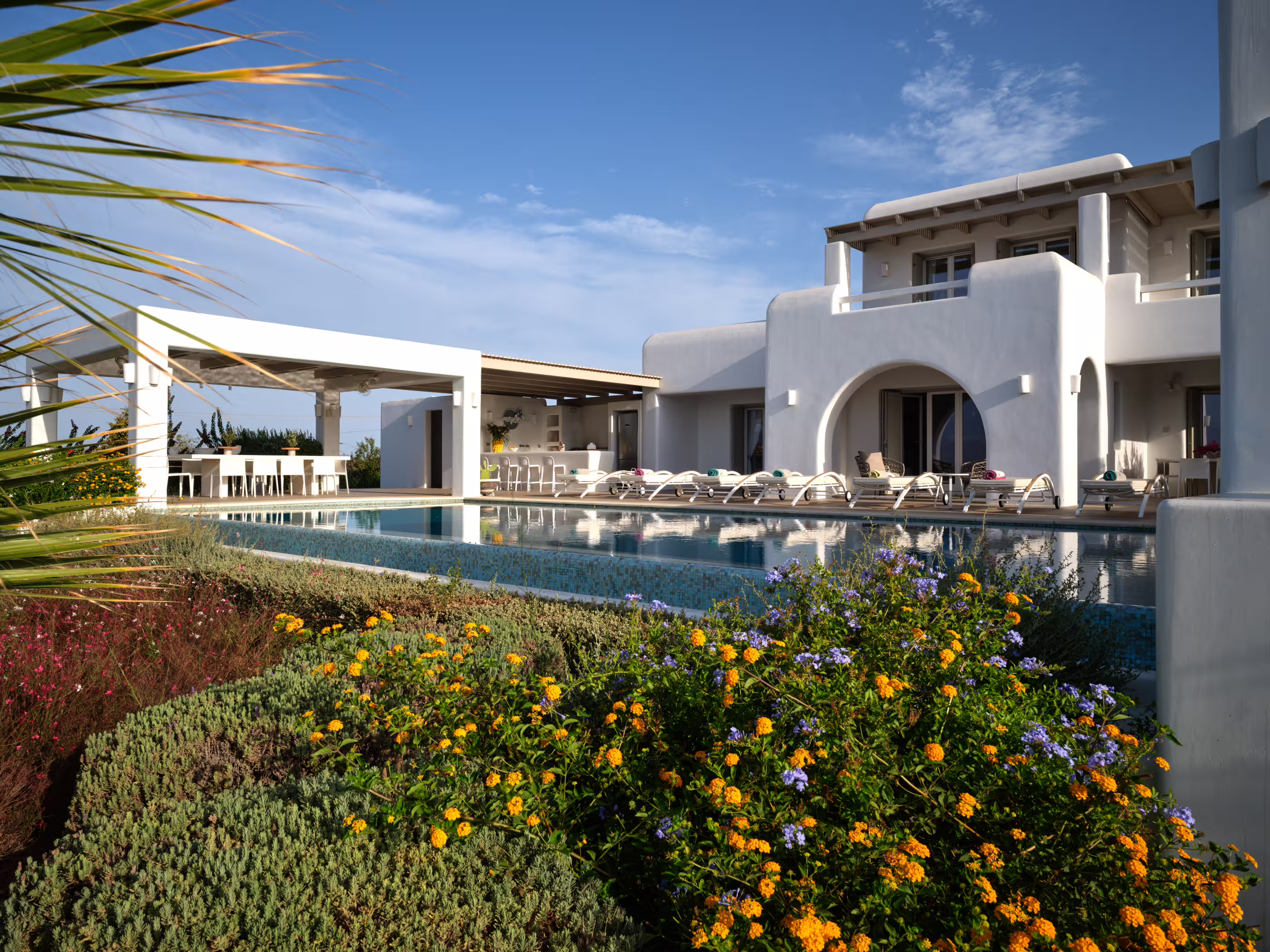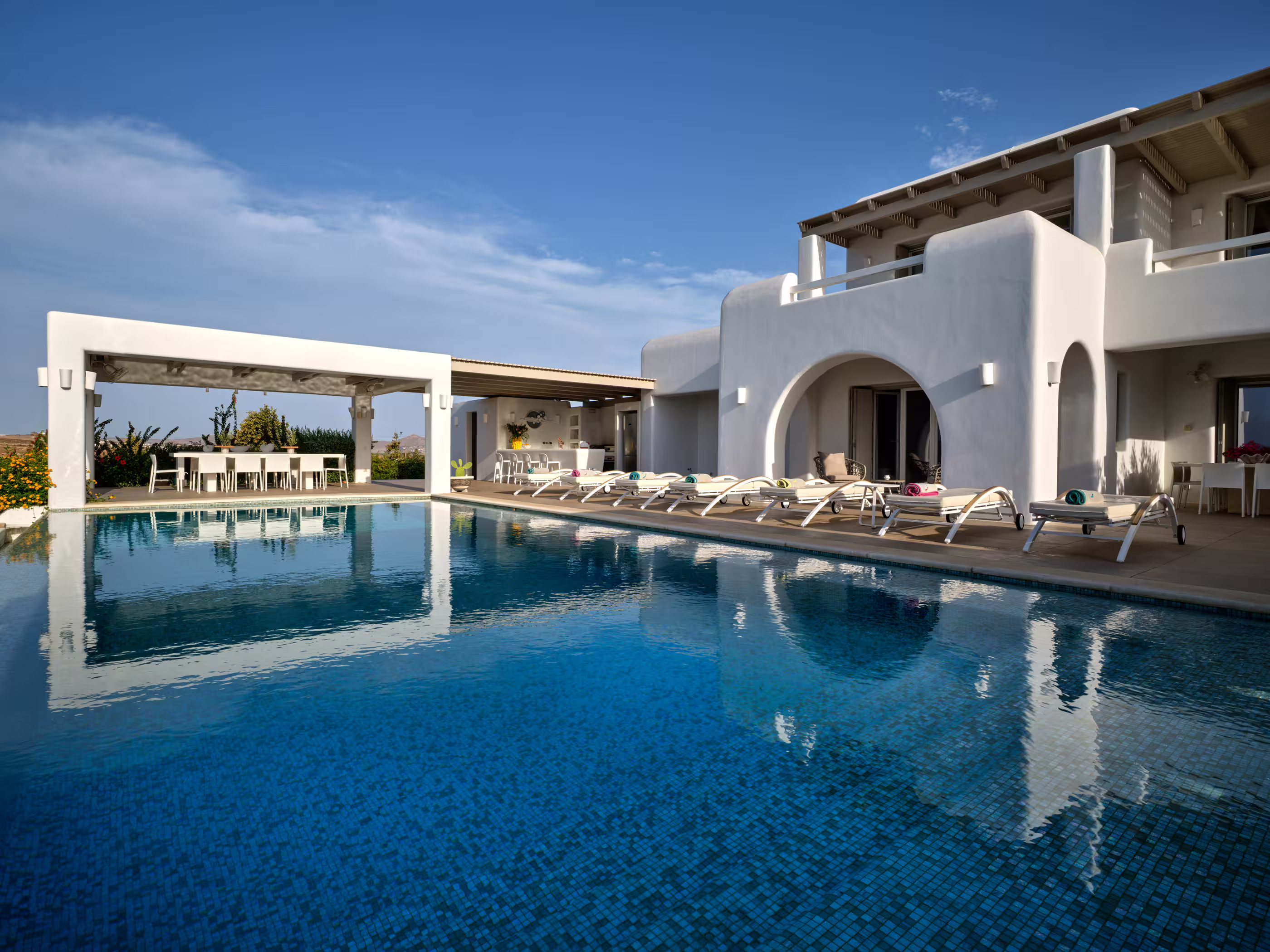 True to Cycladic aesthetics, this property offers bright lounge spaces, styled with meticulous design, conveying a graceful island flair in white and turquoise tones. The outdoor area features a spacious terrace, large infinity pool, dining table, seating areas, and a Mediterranean garden. The Concerto Estate shares the property with sister Villa Melody (5 bedrooms), which can be rented together for larger groups.