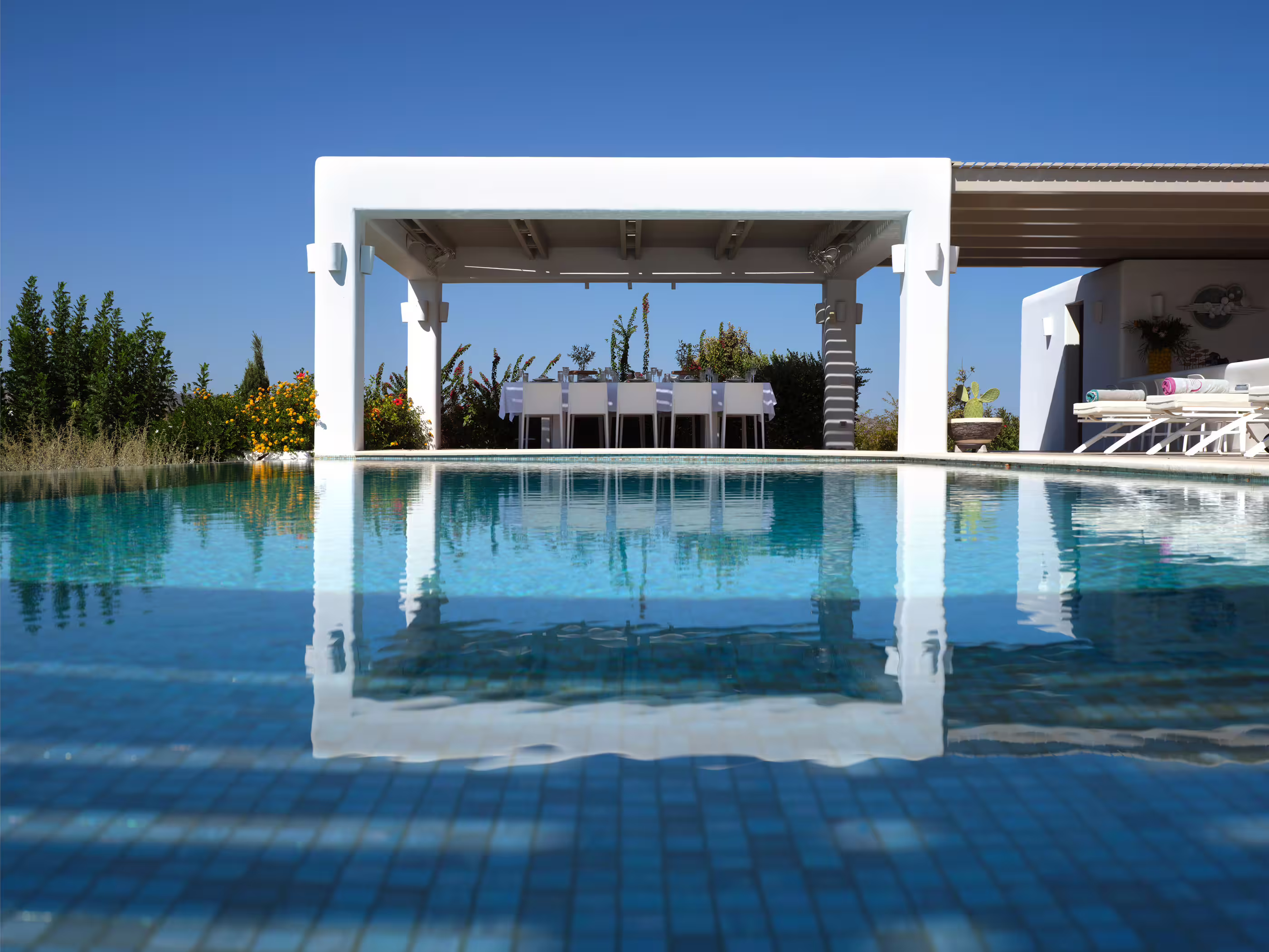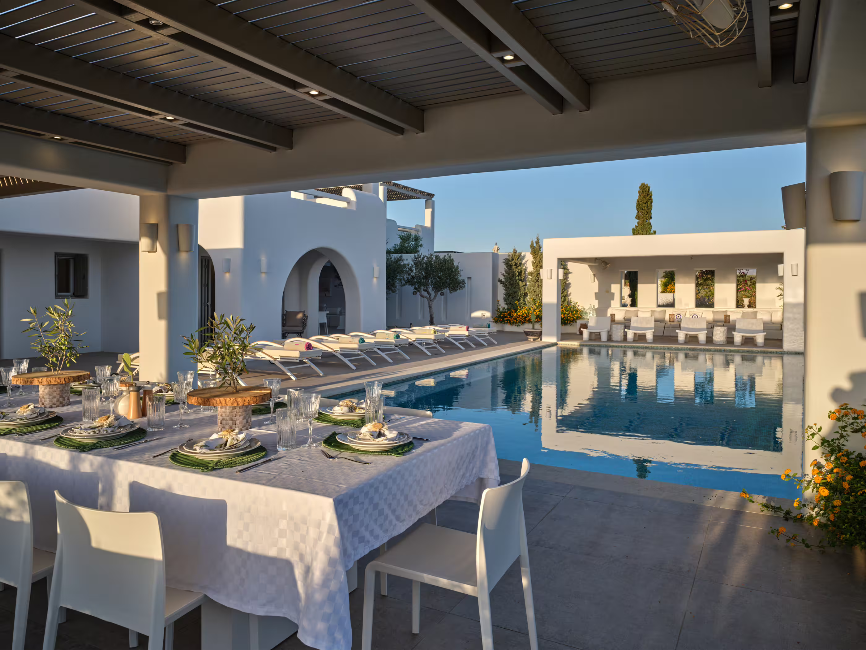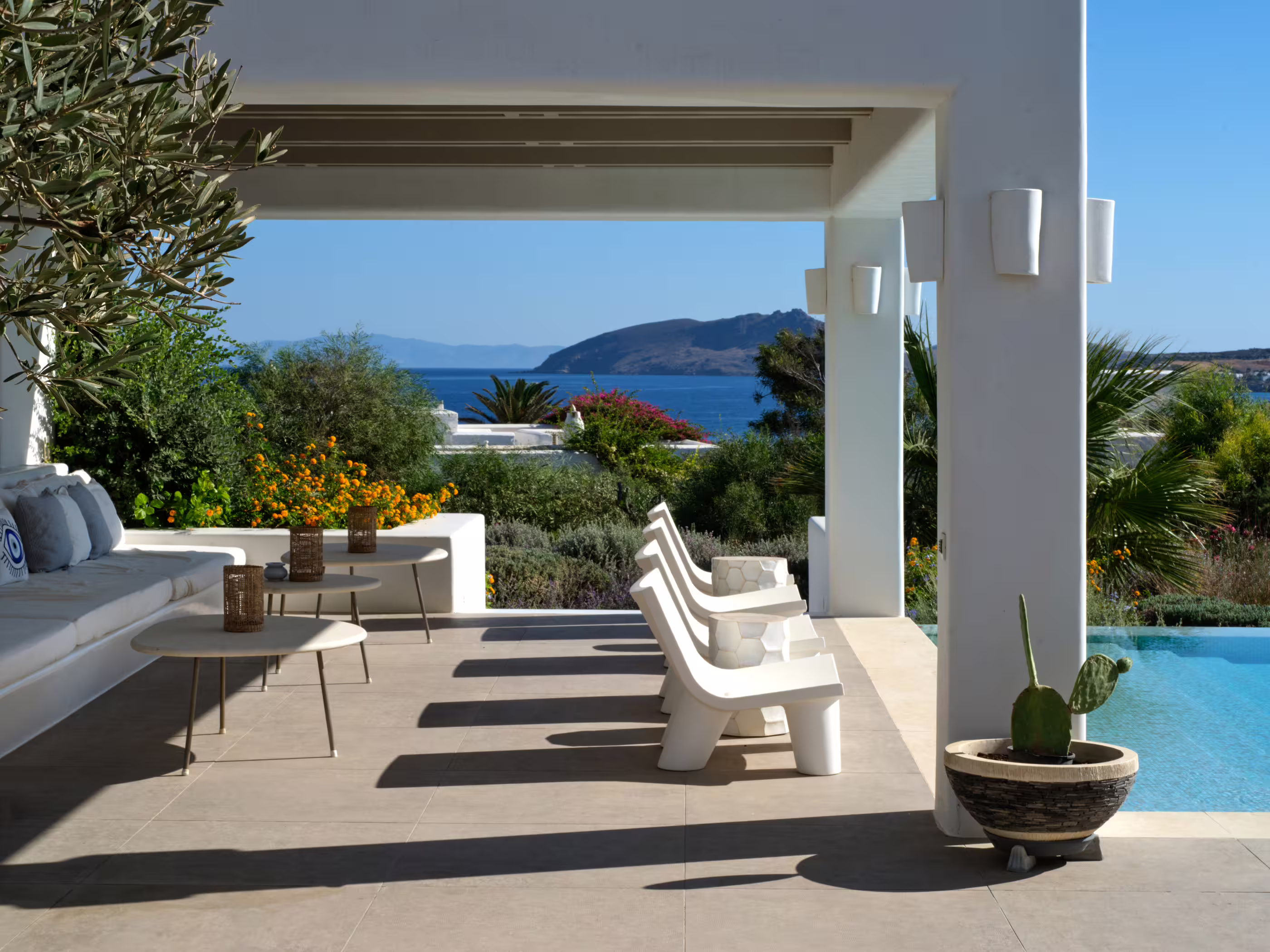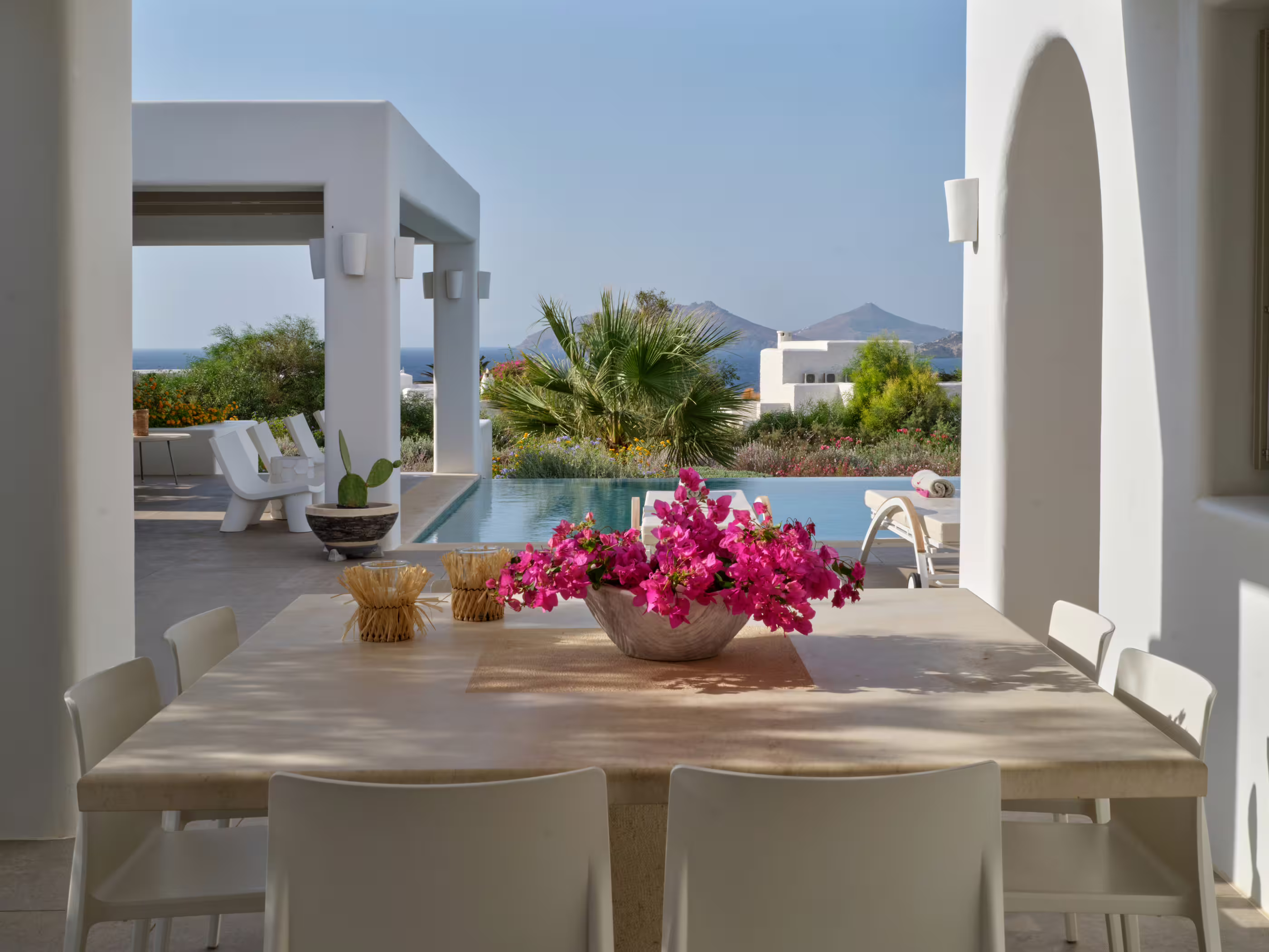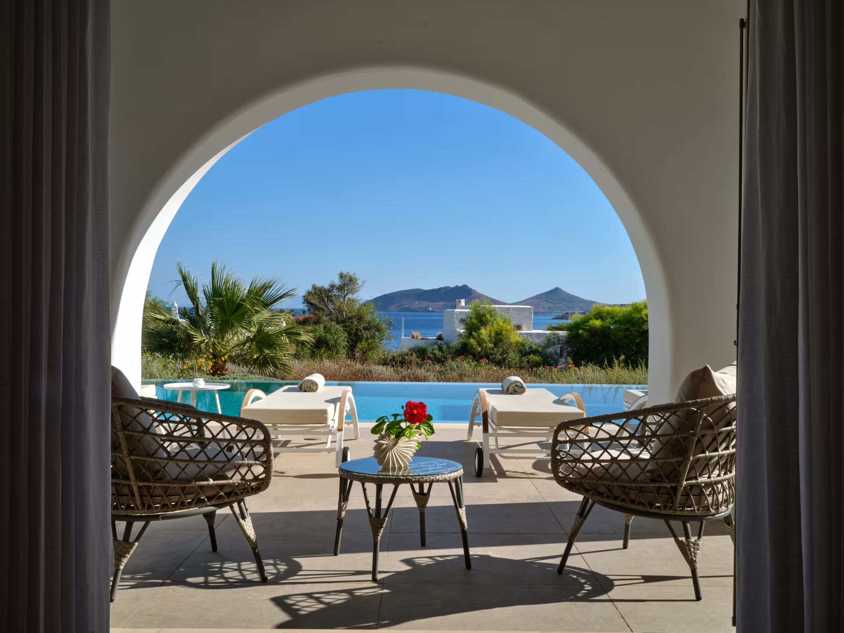 True to Cycladic aesthetics, this property offers bright lounge spaces, styled with meticulous design, conveying a graceful island flair in white and turquoise tones. The outdoor area features a spacious terrace, large infinity pool, dining table, seating areas, and a Mediterranean garden. The Concerto Estate shares the property with sister Villa Melody (5 bedrooms), which can be rented together for larger groups.