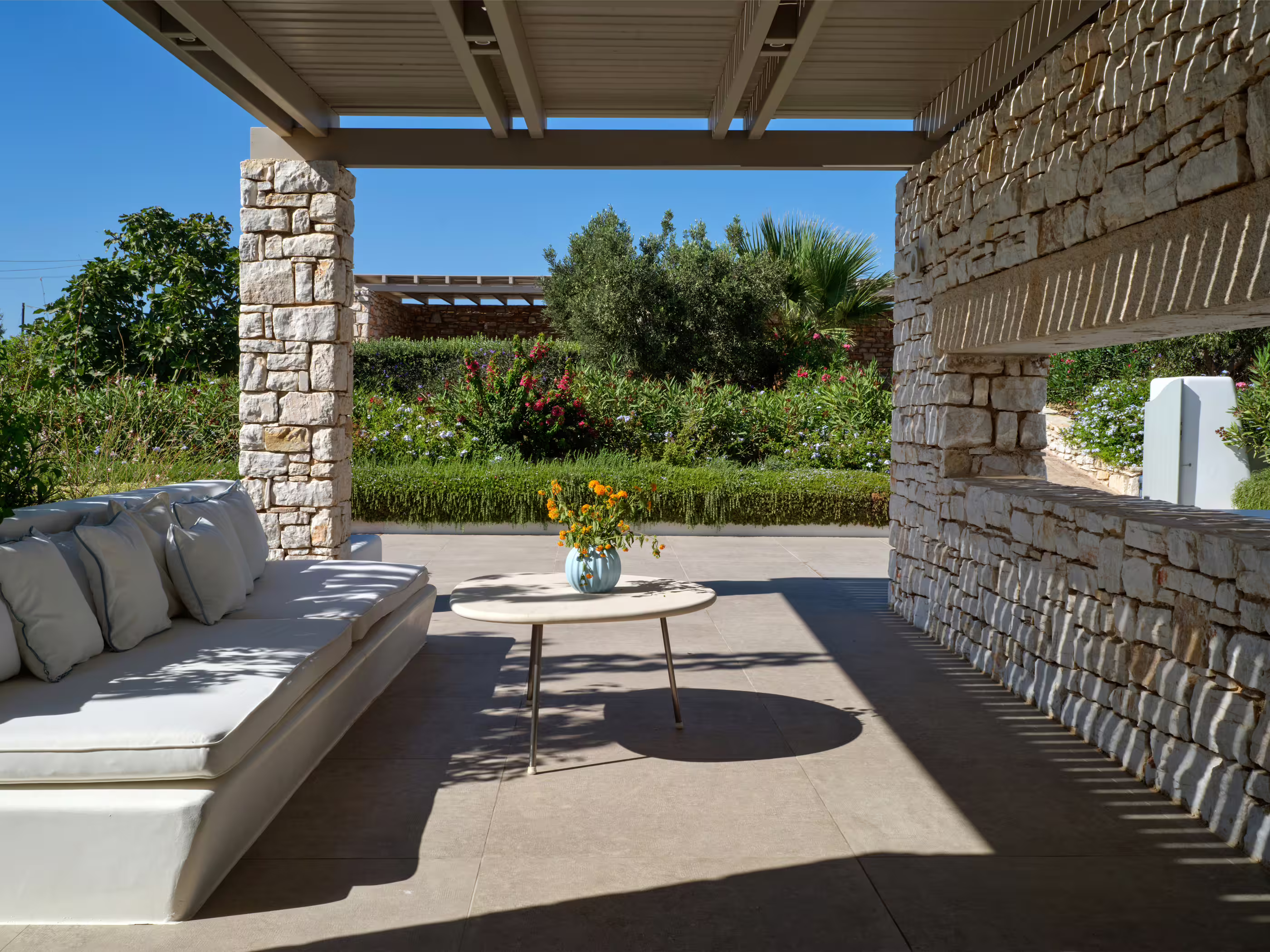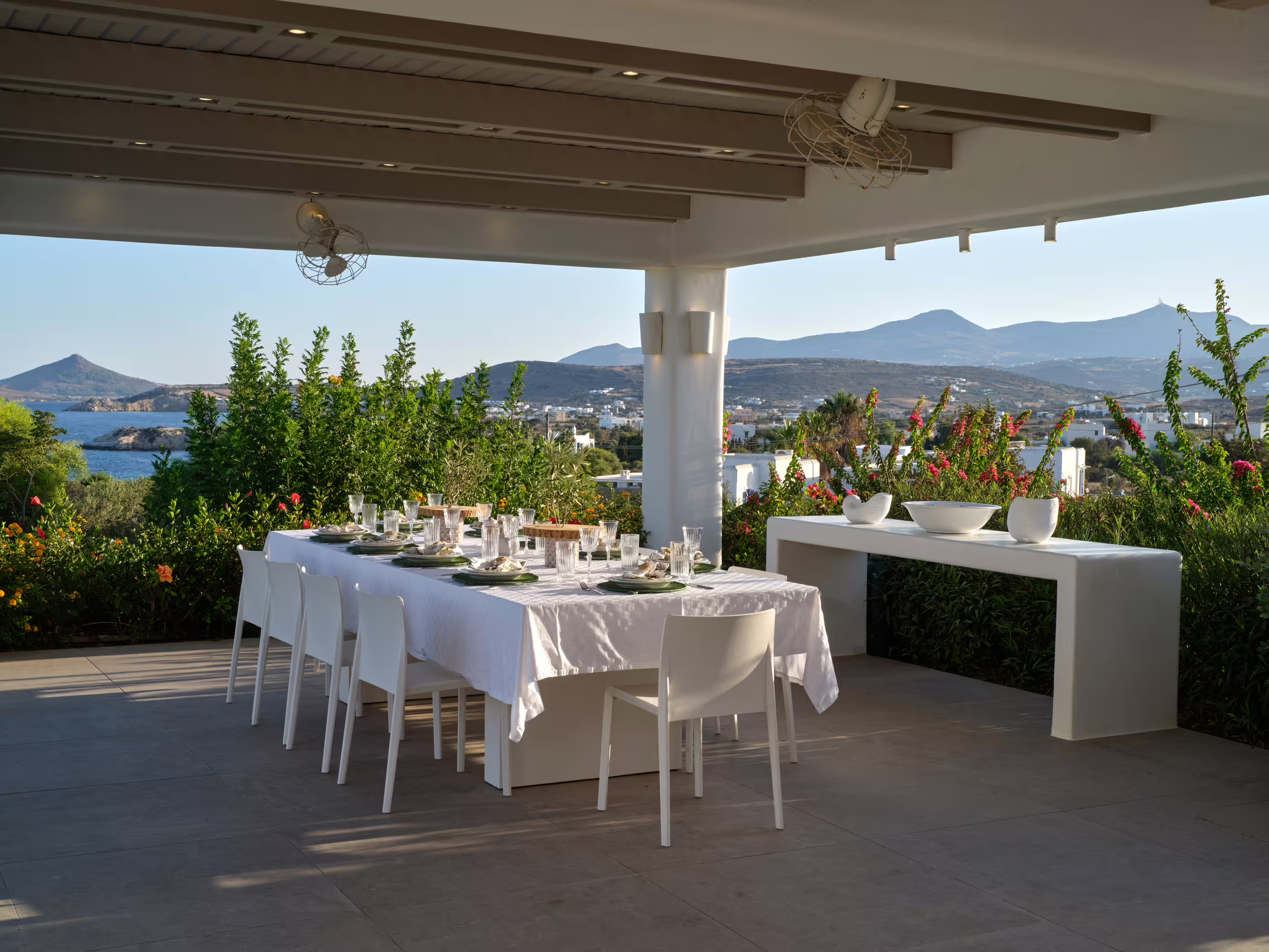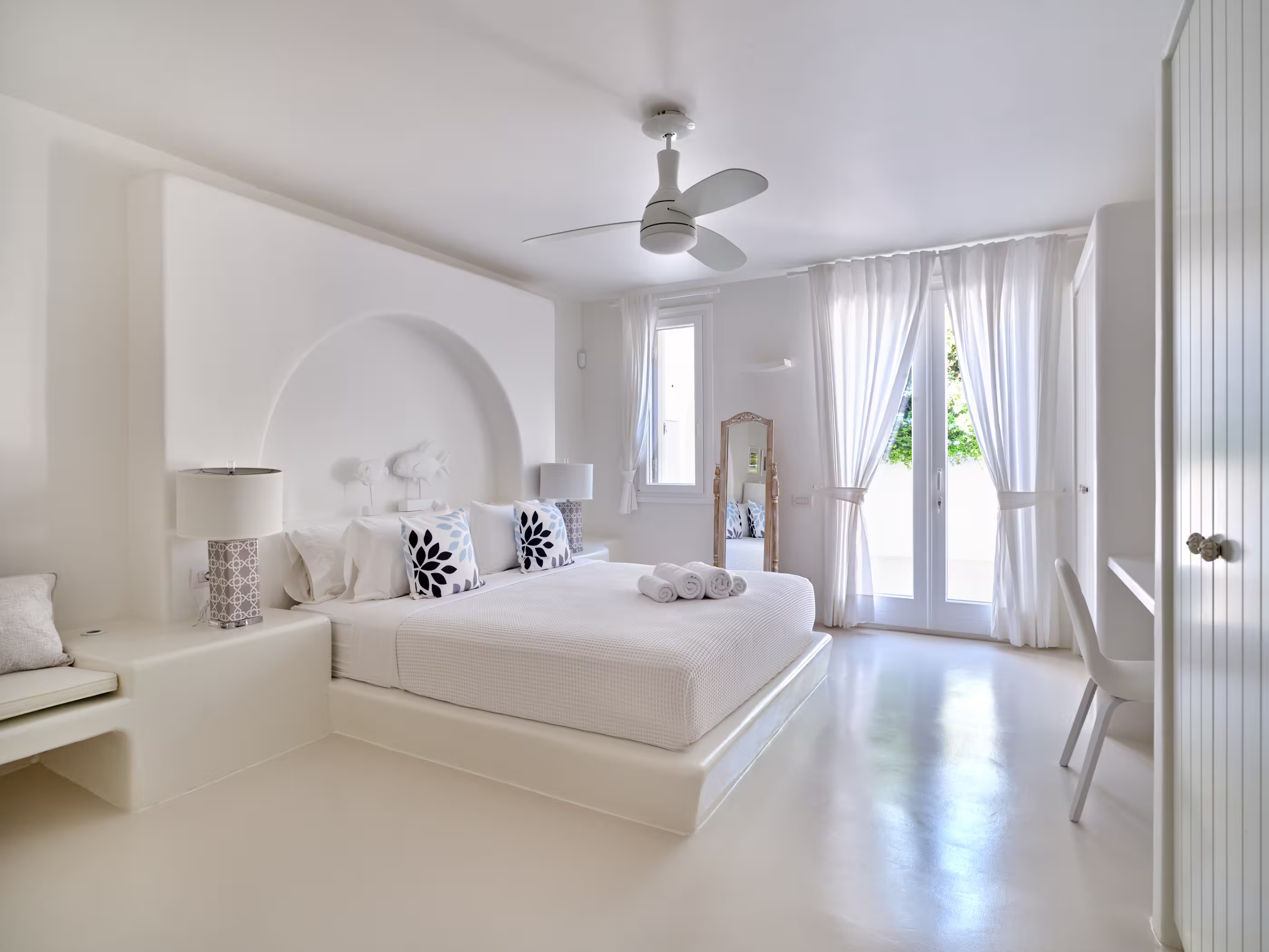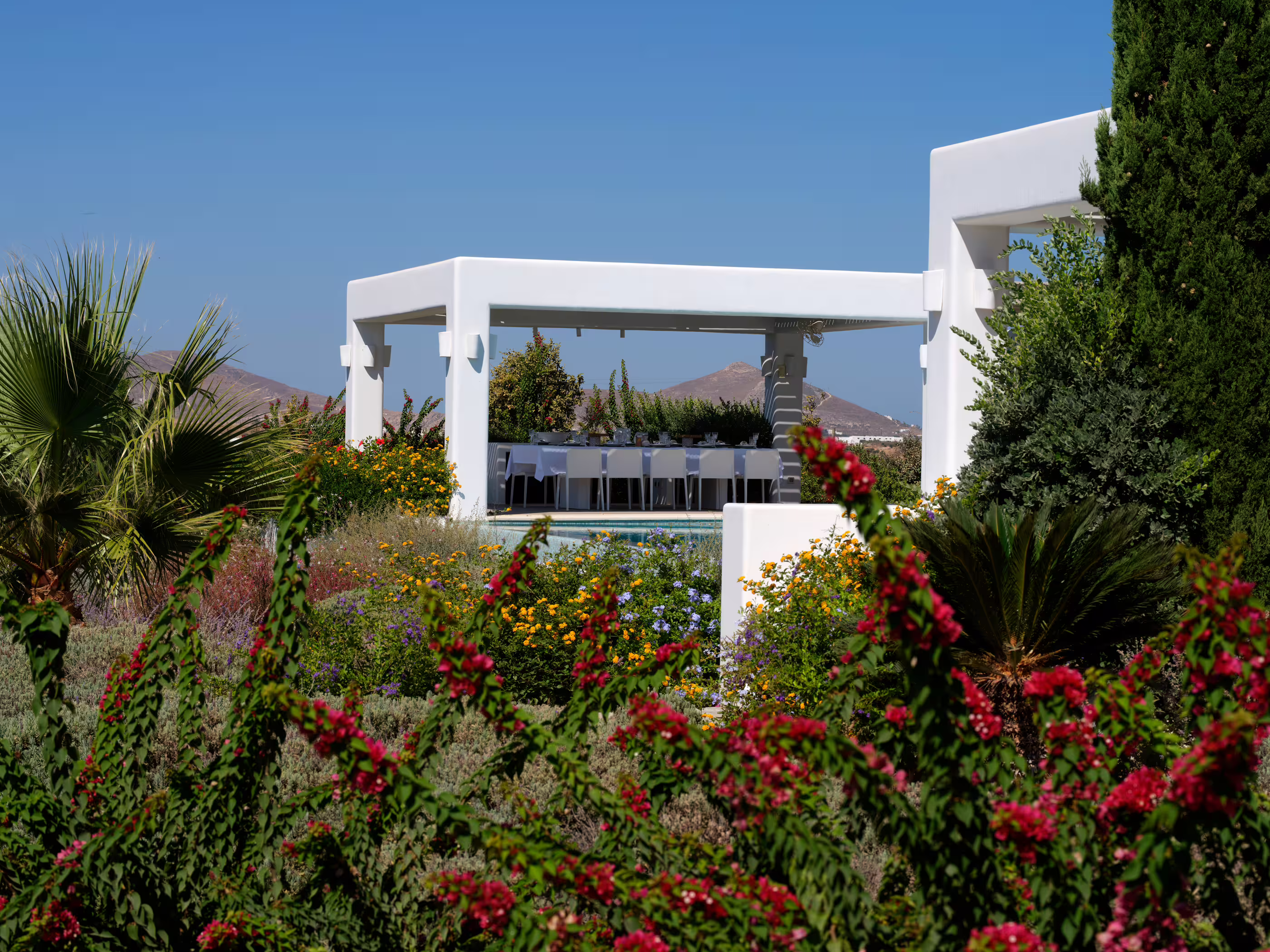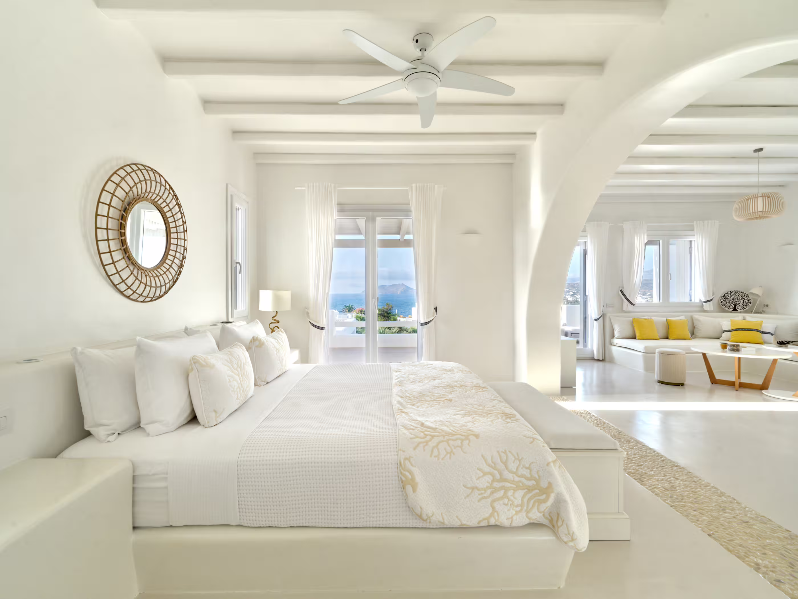 True to Cycladic aesthetics, this property offers bright lounge spaces, styled with meticulous design, conveying a graceful island flair in white and turquoise tones. The outdoor area features a spacious terrace, large infinity pool, dining table, seating areas, and a Mediterranean garden. The Concerto Estate shares the property with sister Villa Melody (5 bedrooms), which can be rented together for larger groups.