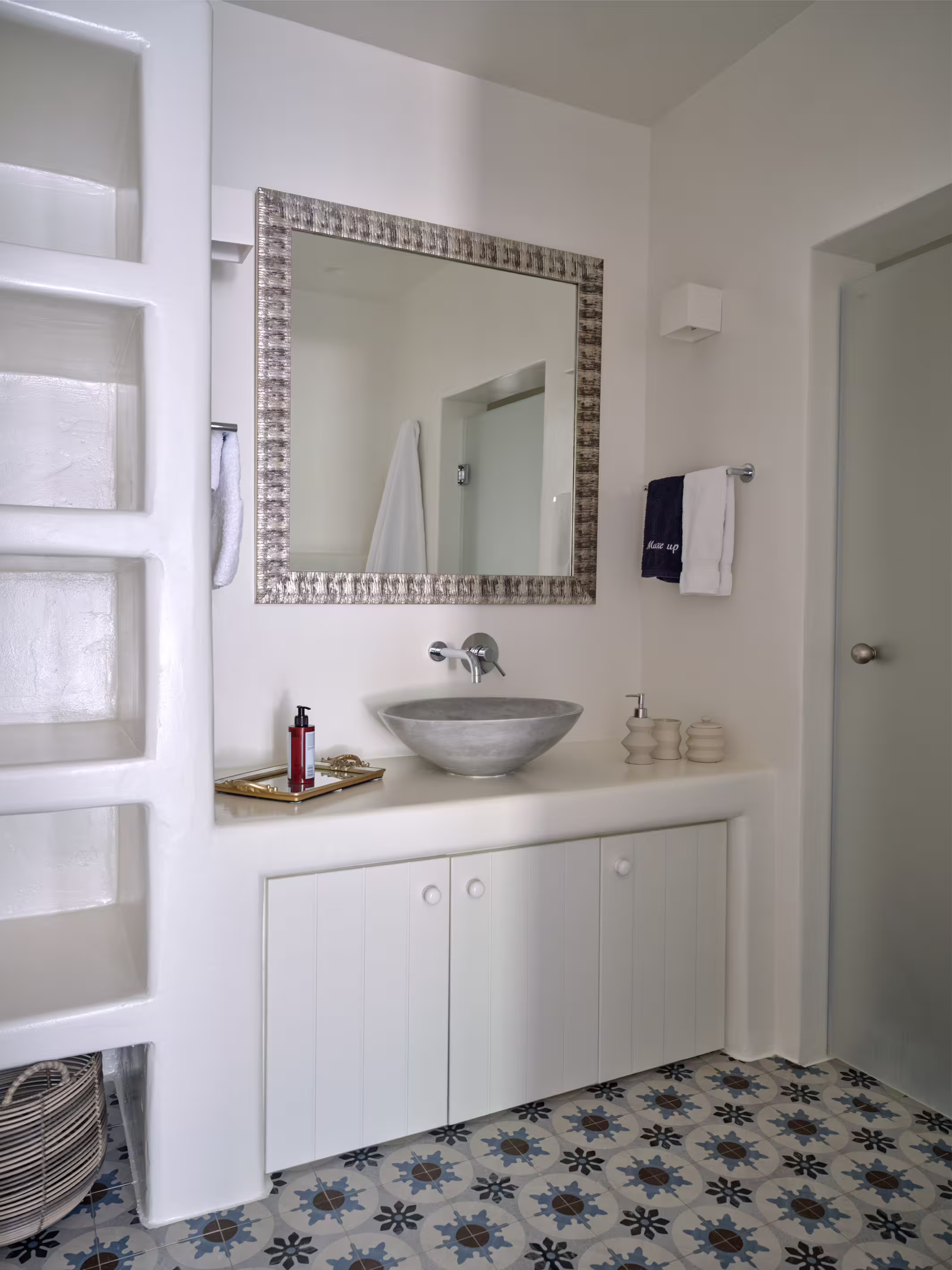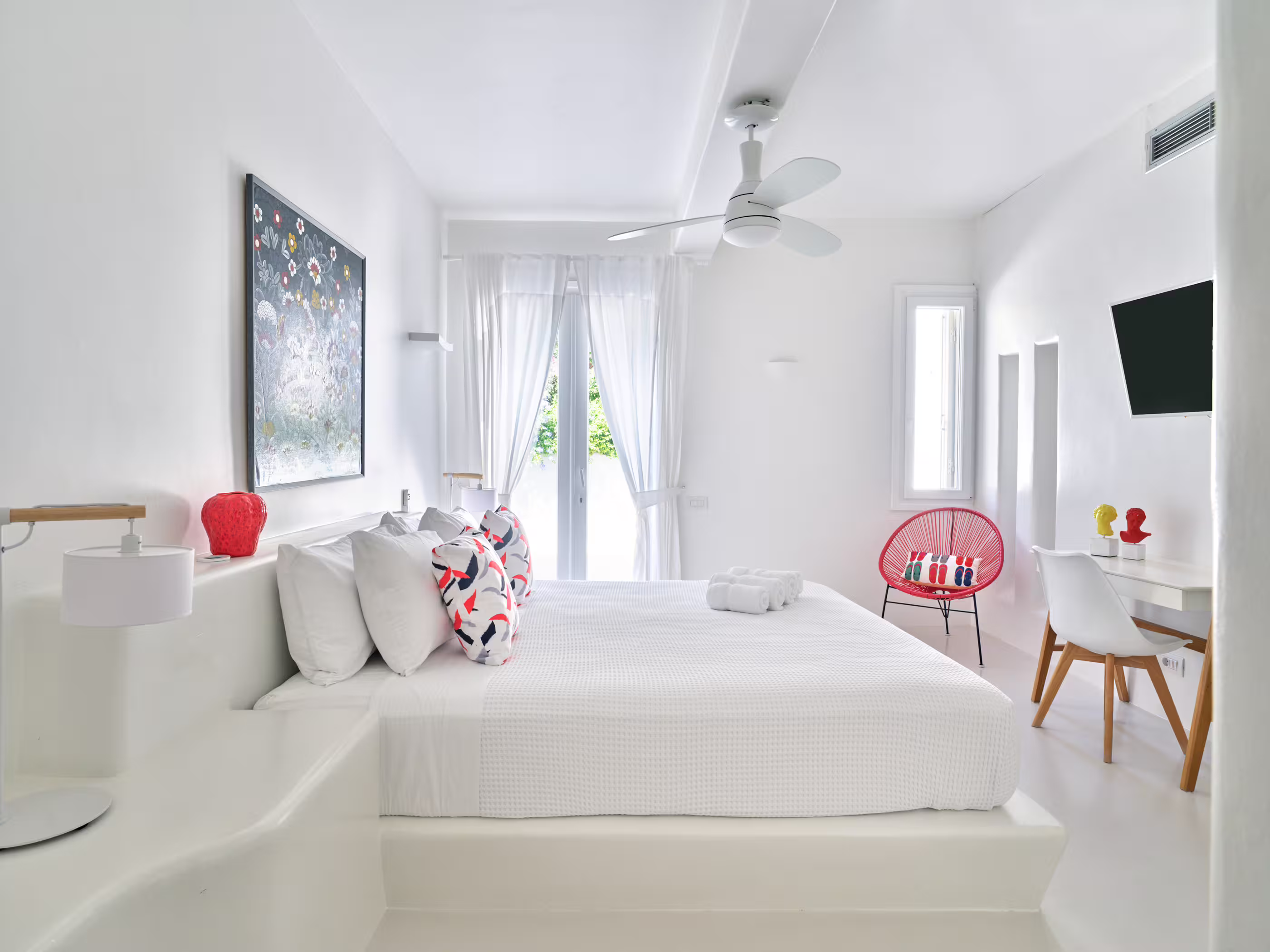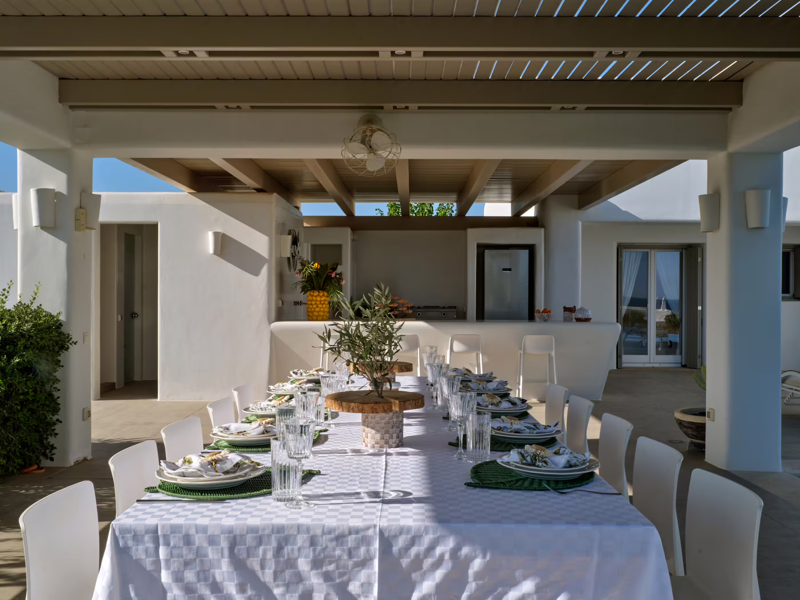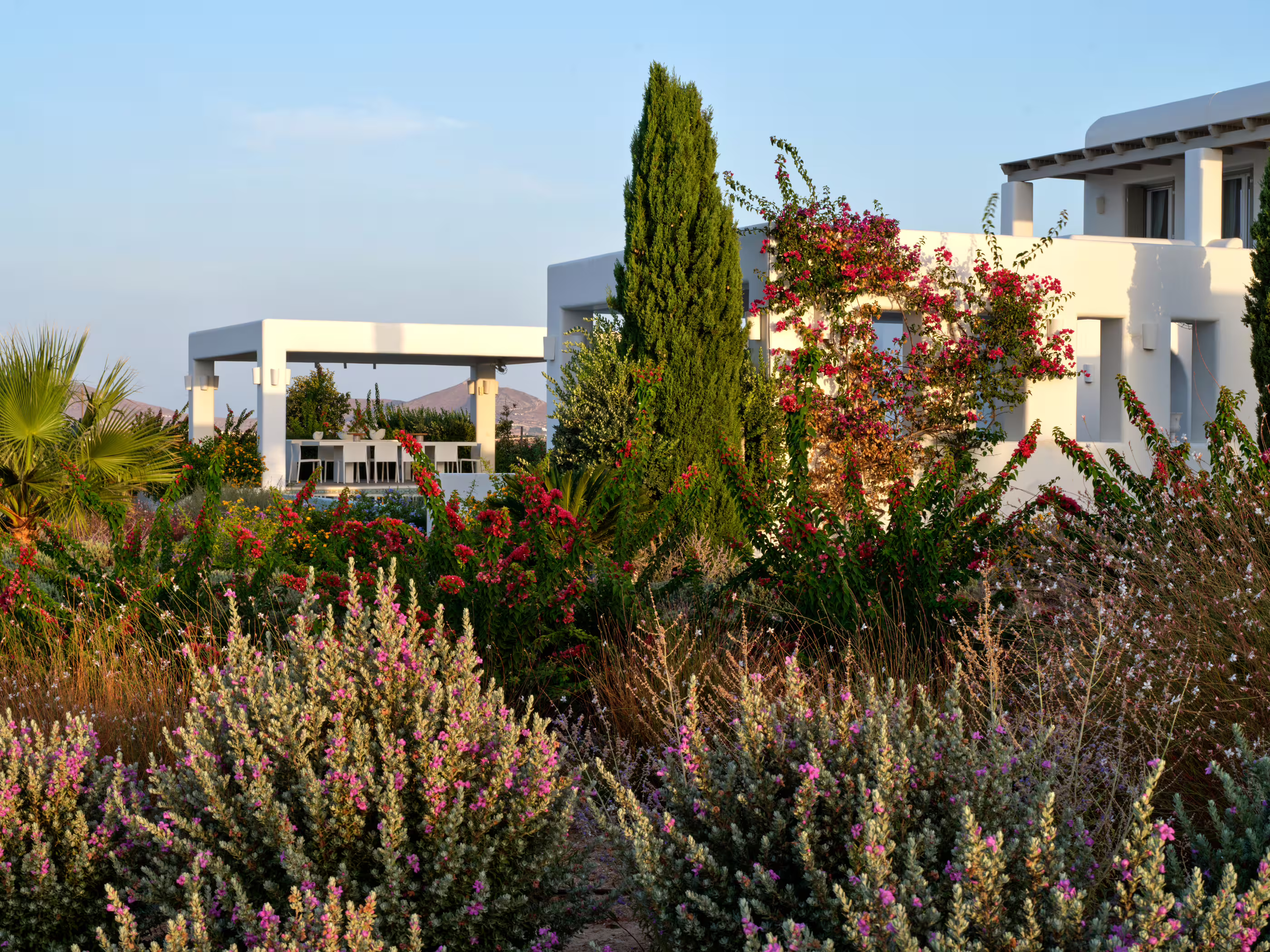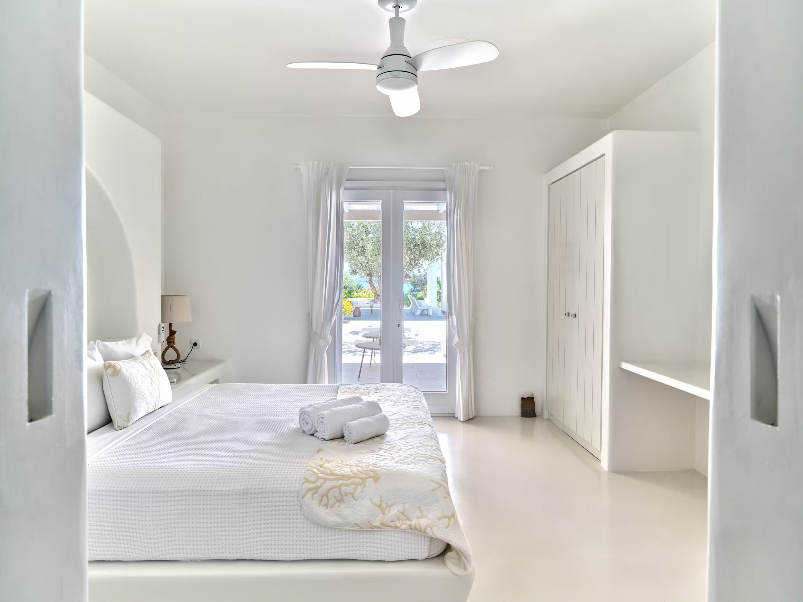 True to Cycladic aesthetics, this property offers bright lounge spaces, styled with meticulous design, conveying a graceful island flair in white and turquoise tones. The outdoor area features a spacious terrace, large infinity pool, dining table, seating areas, and a Mediterranean garden. The Concerto Estate shares the property with sister Villa Melody (5 bedrooms), which can be rented together for larger groups.