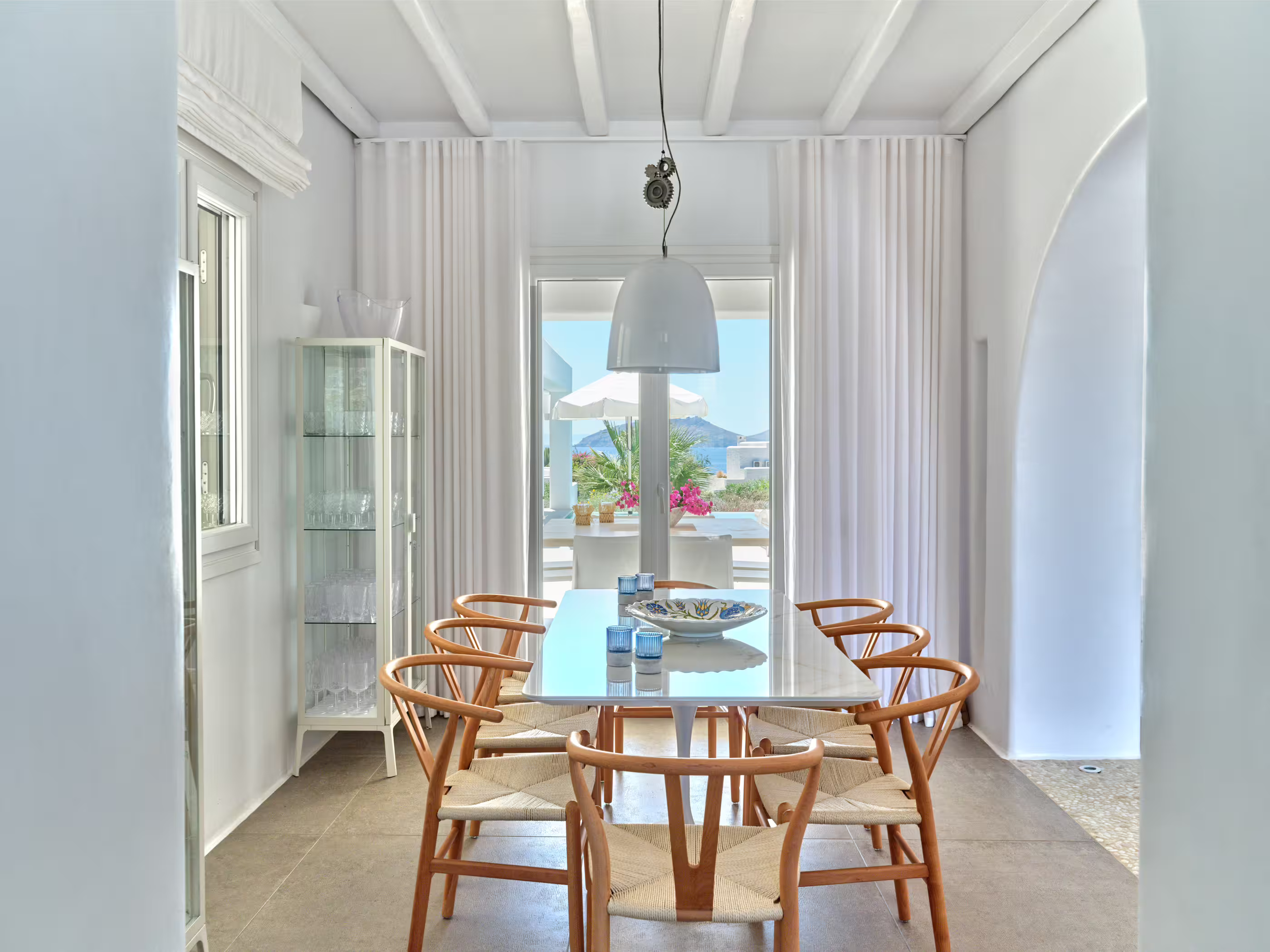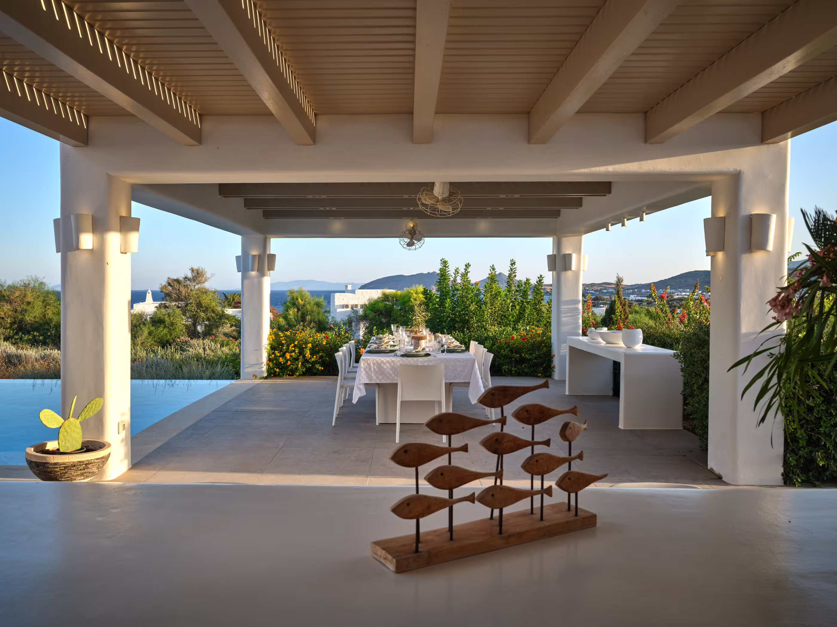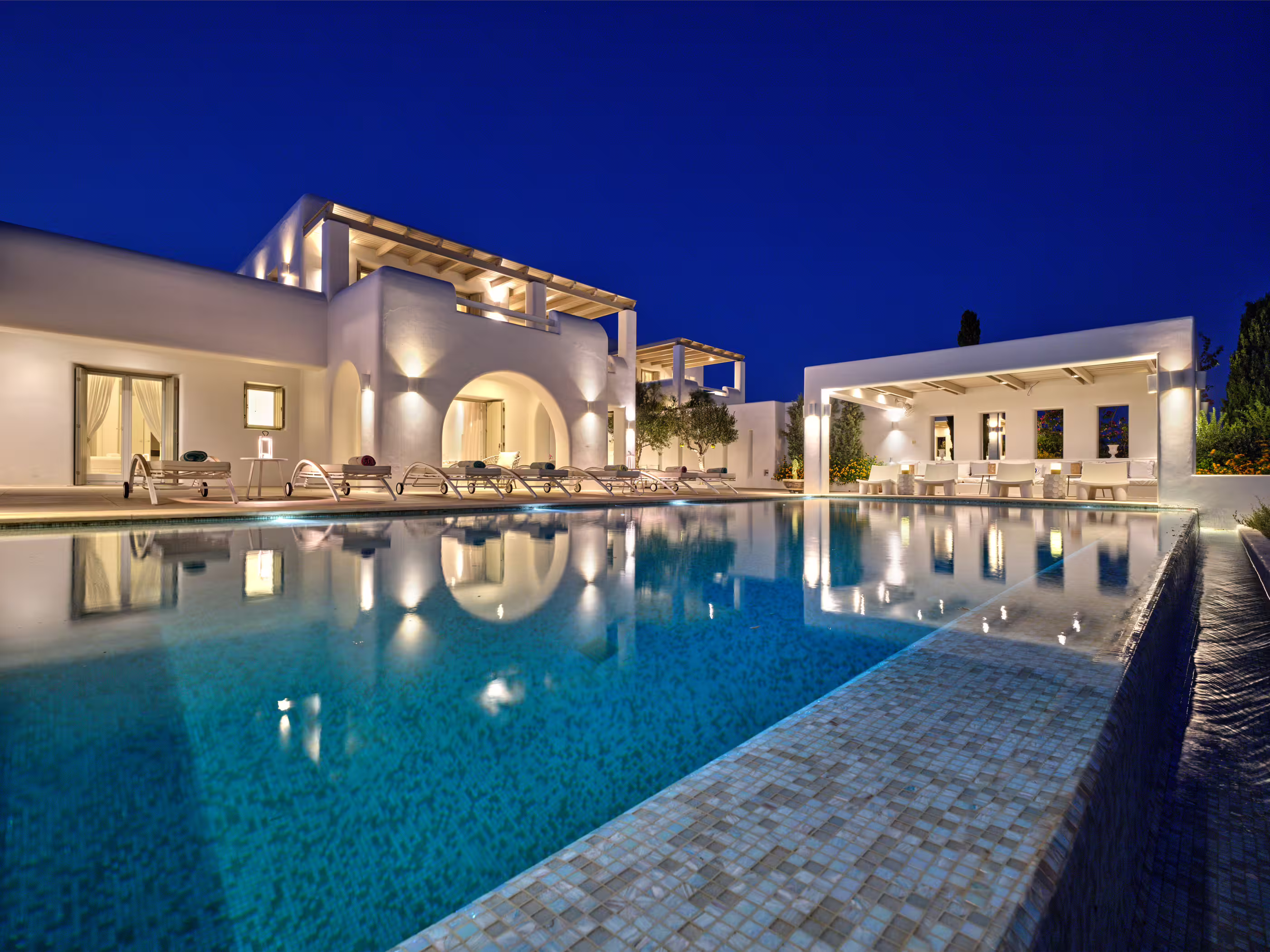 This 8-bedroom villa is located in Ampelas, overlooking the Aegean Sea and the island of Naxos. It boasts a fine fusion of Greek architectural integrity and modern finishes, with all the luxuries of a five-star hotel. Just a stone’s throw or six-minute drive from the cosmopolitan town of Naousa, it is the perfect property for a lavish, private stay on fabulous Paros.