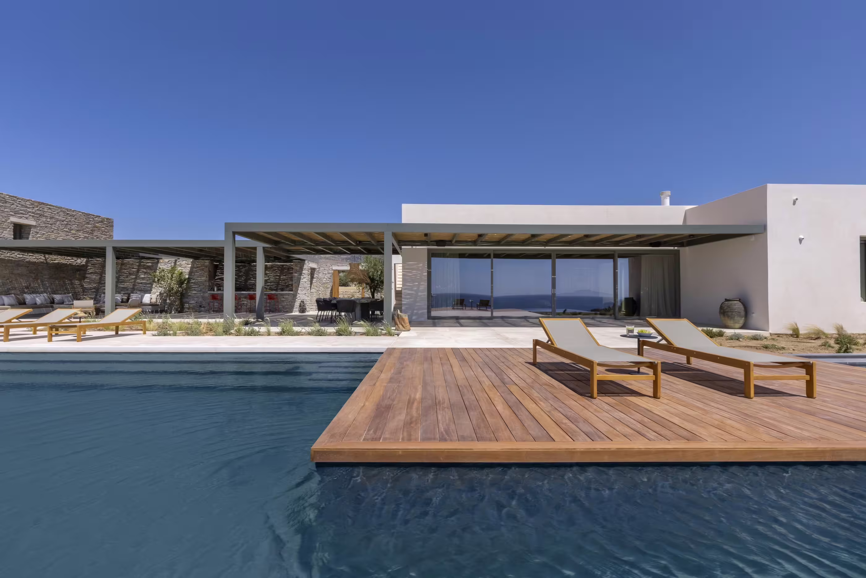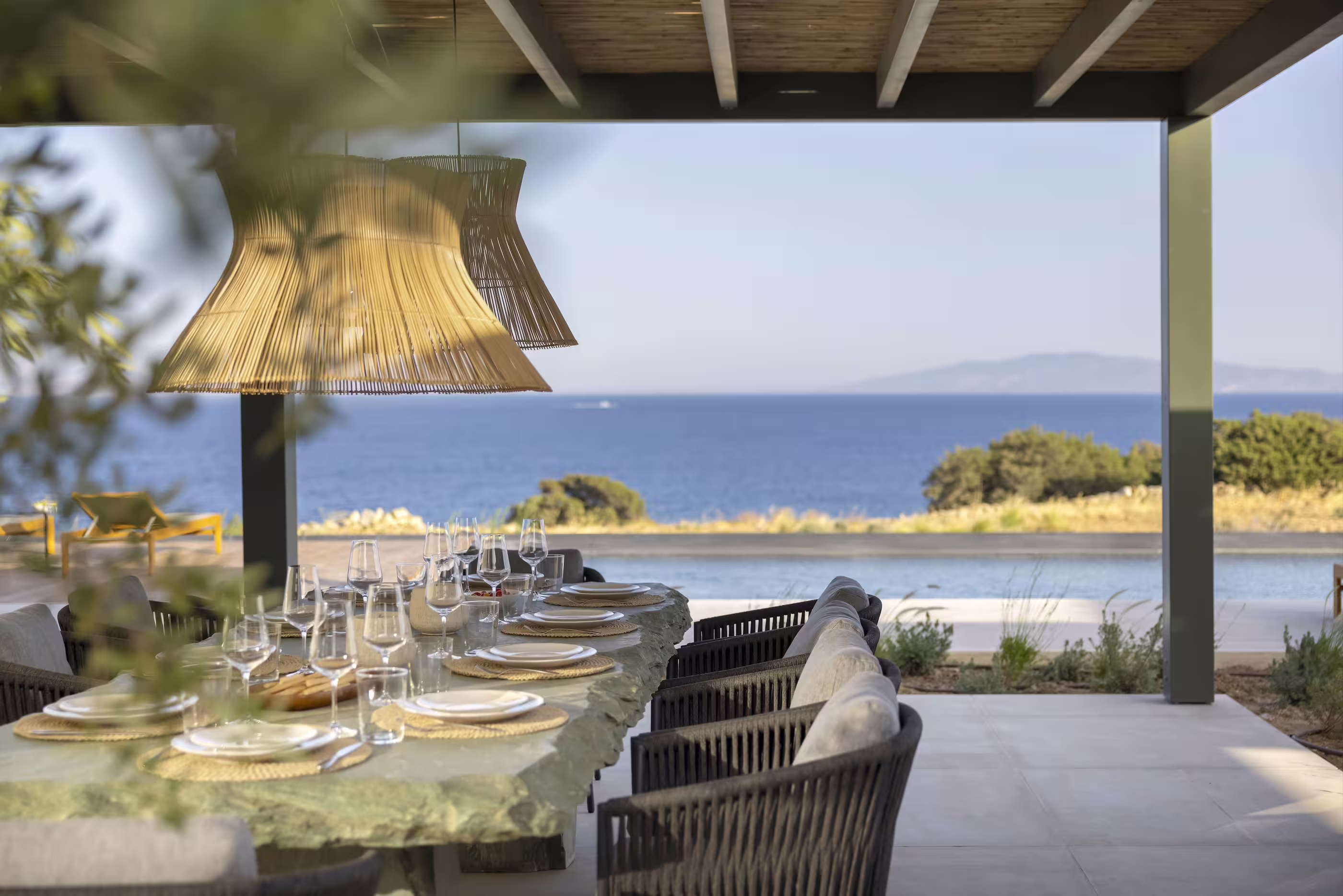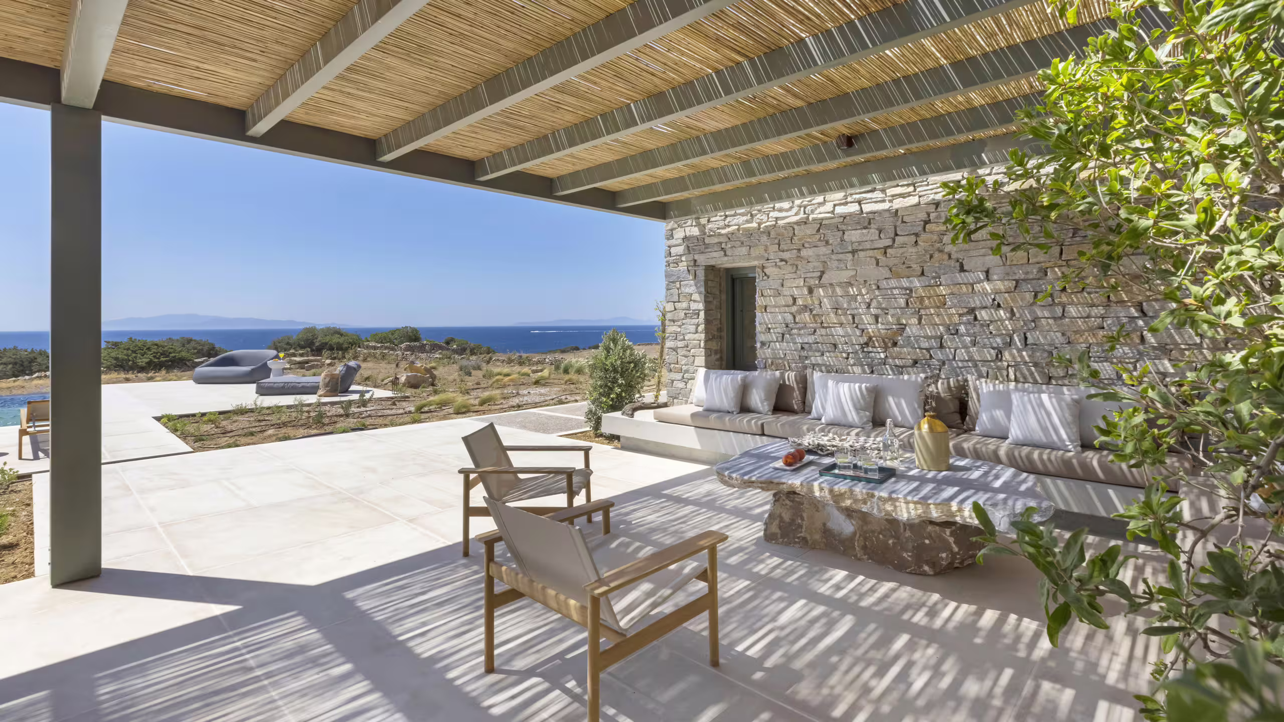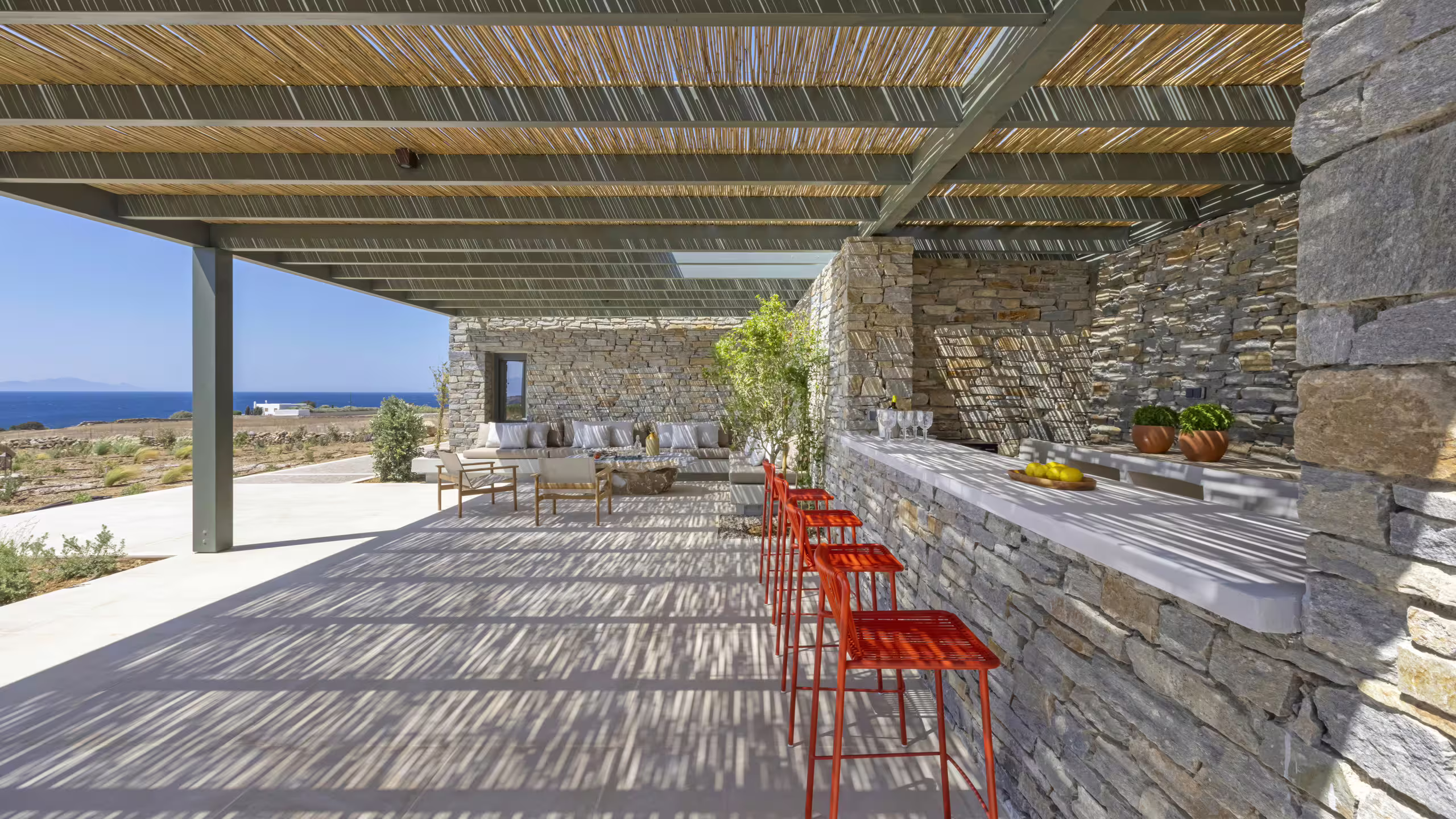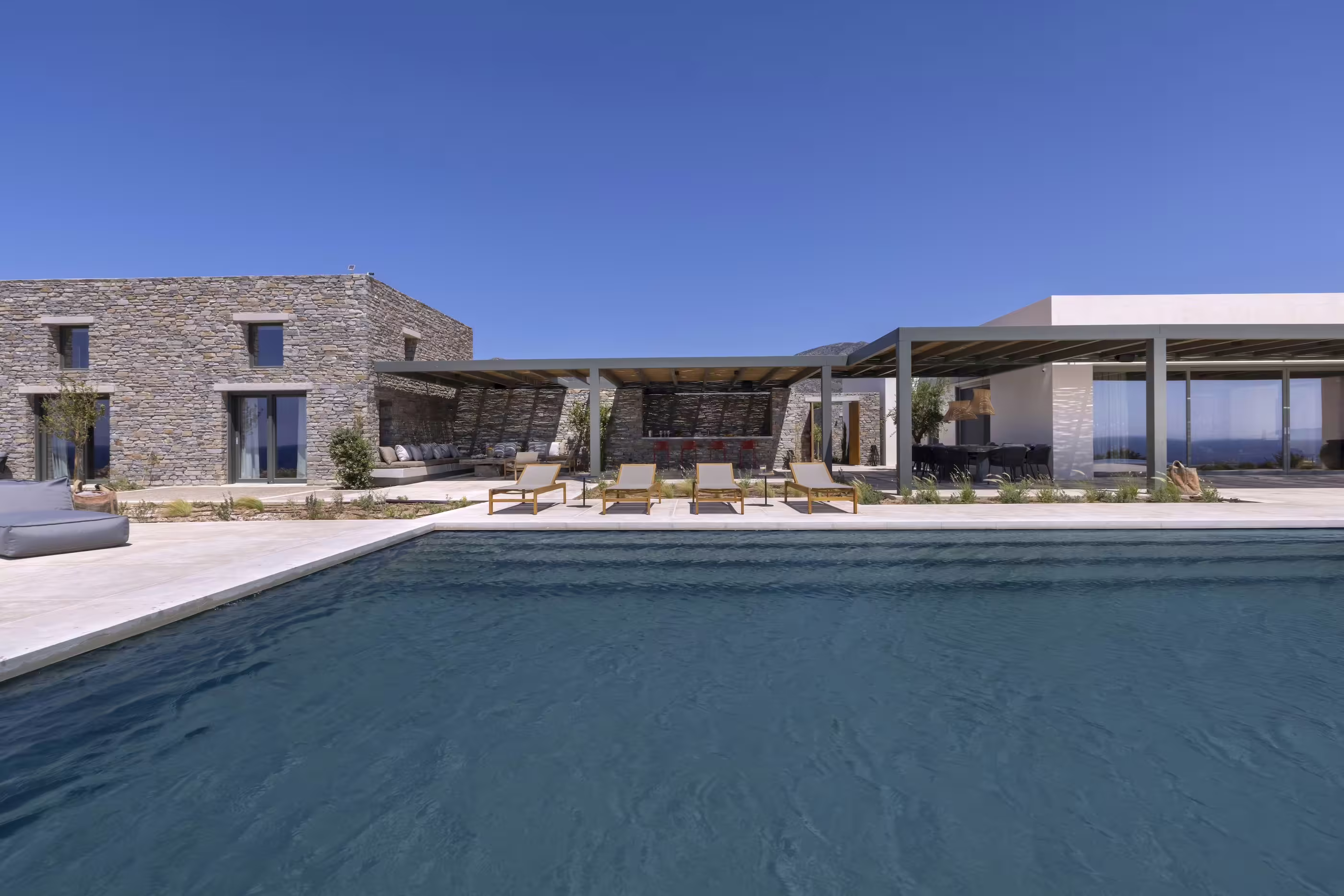Five interconnected buildings form this spacious property, linked by shaded pergolas, stone pathways, cozy courtyards, and gardens abundant with Mediterranean greenery. At its heart lies an infinity pool bordered by a wooden deck, ideal for sunbathing or quiet relaxation. A large, shaded outdoor living area with a bar and dining space invites leisurely days and intimate evenings by the sea.
