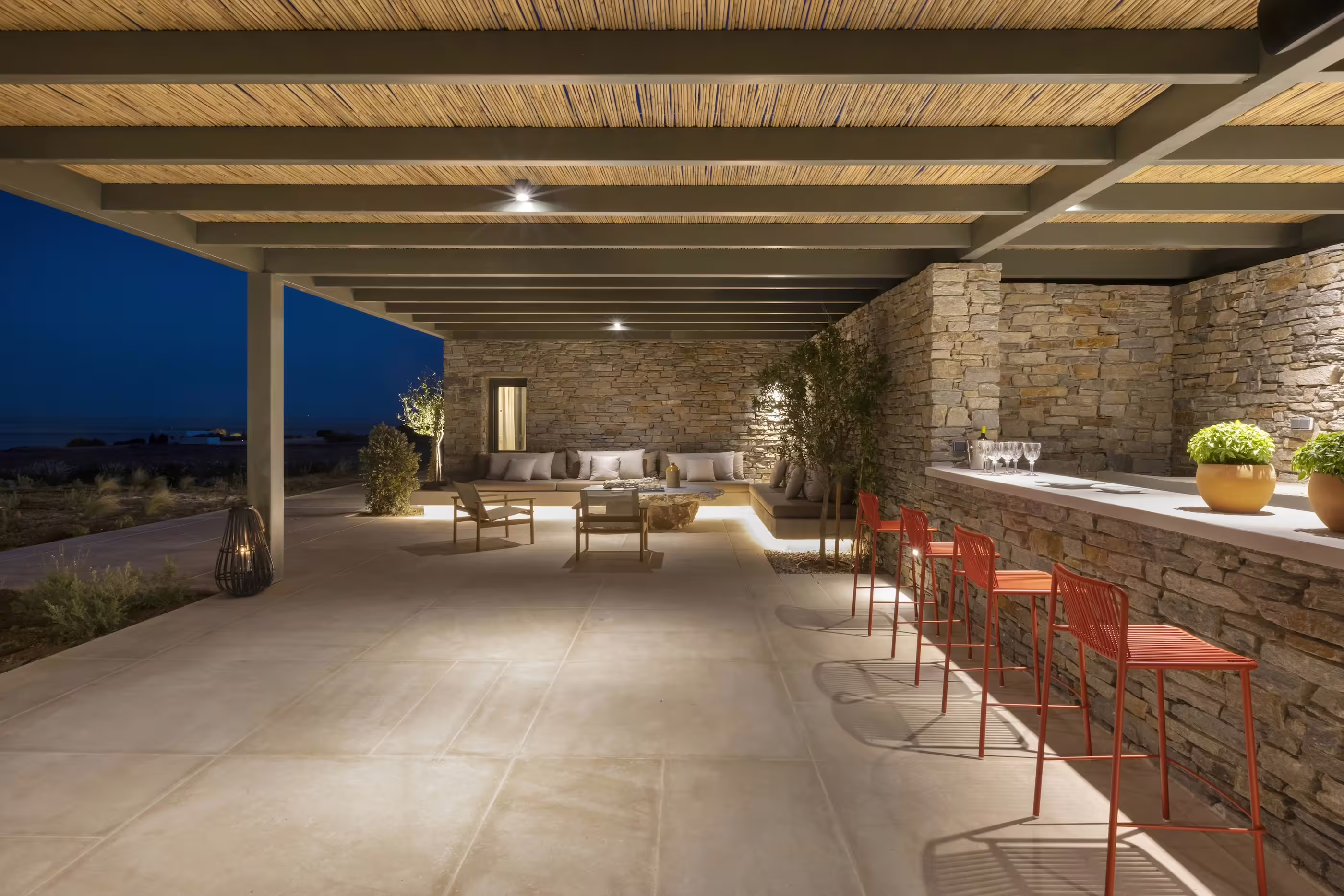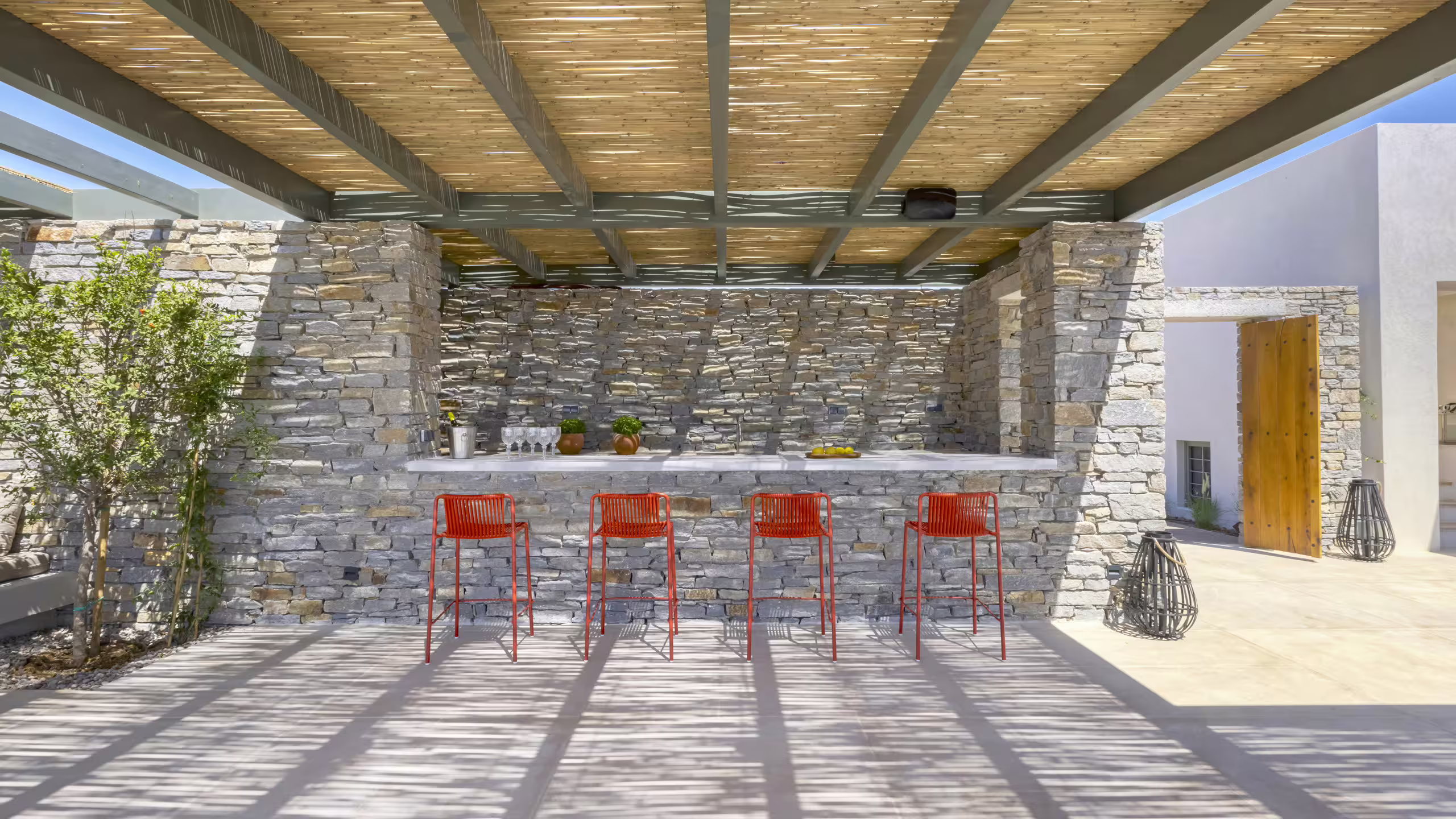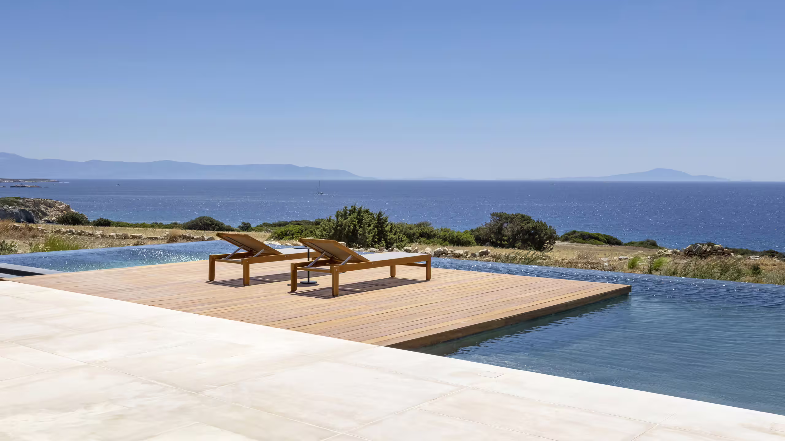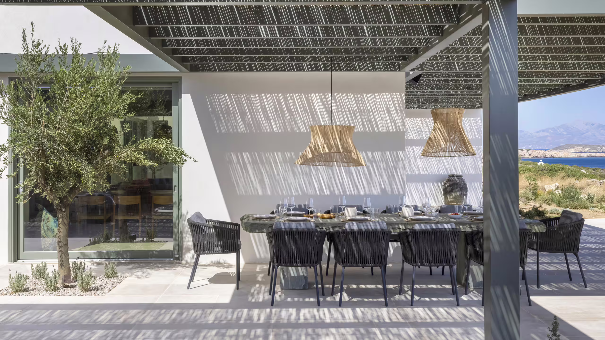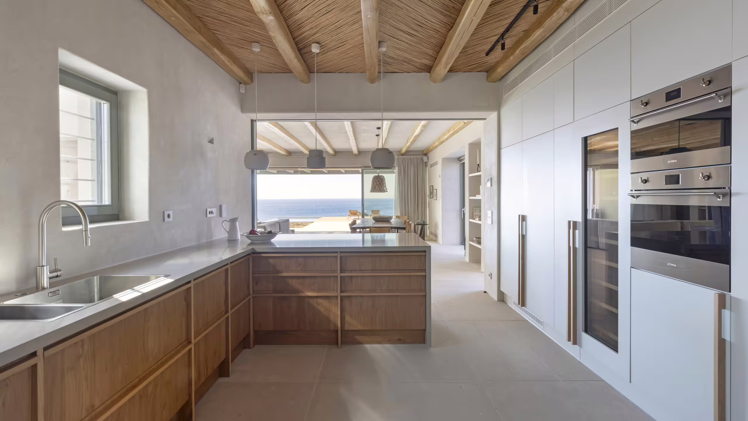 Five interconnected buildings form this spacious property, linked by shaded pergolas, stone pathways, cozy courtyards, and gardens abundant with Mediterranean greenery. At its heart lies an infinity pool bordered by a wooden deck, ideal for sunbathing or quiet relaxation. A large, shaded outdoor living area with a bar and dining space invites leisurely days and intimate evenings by the sea.