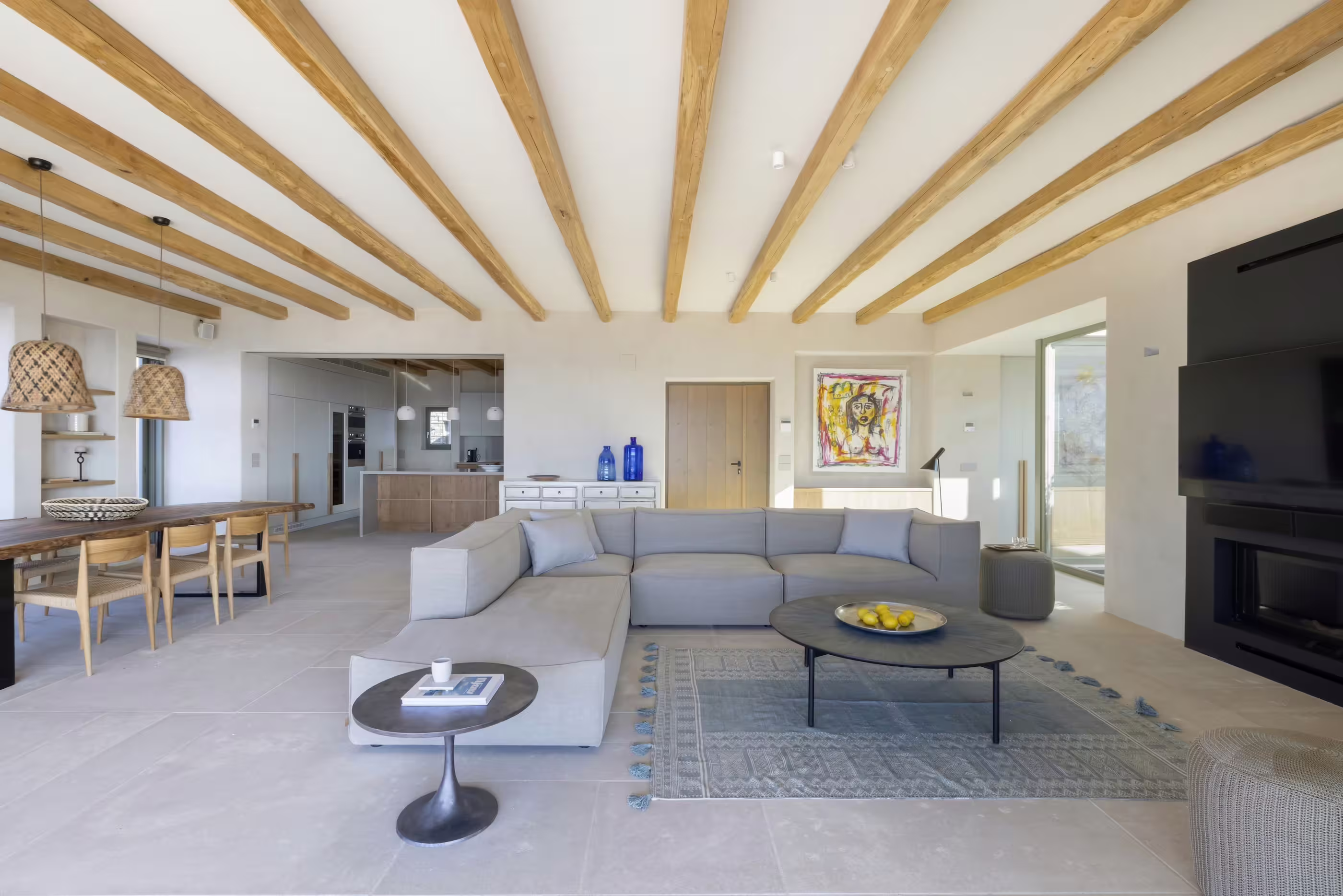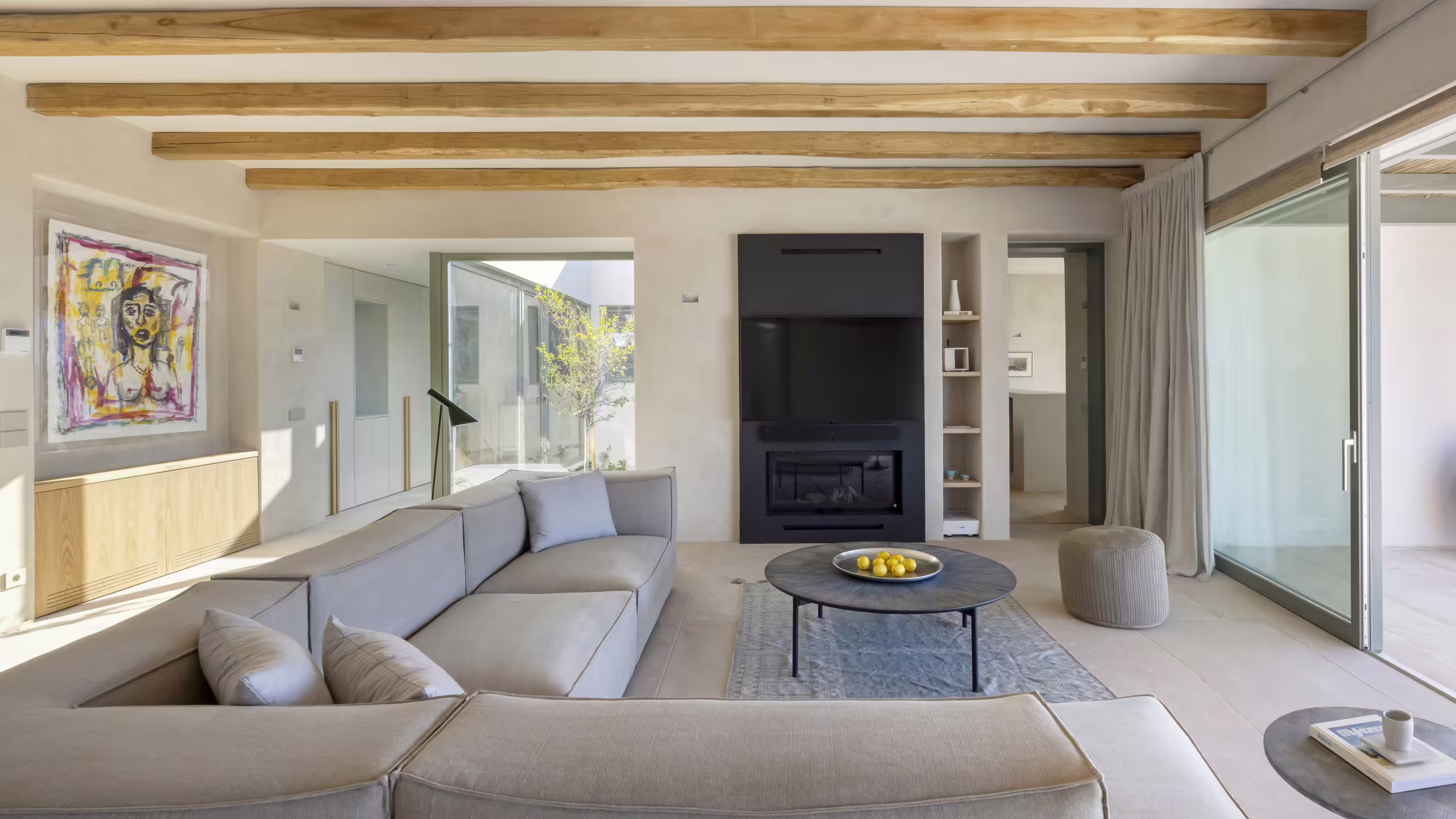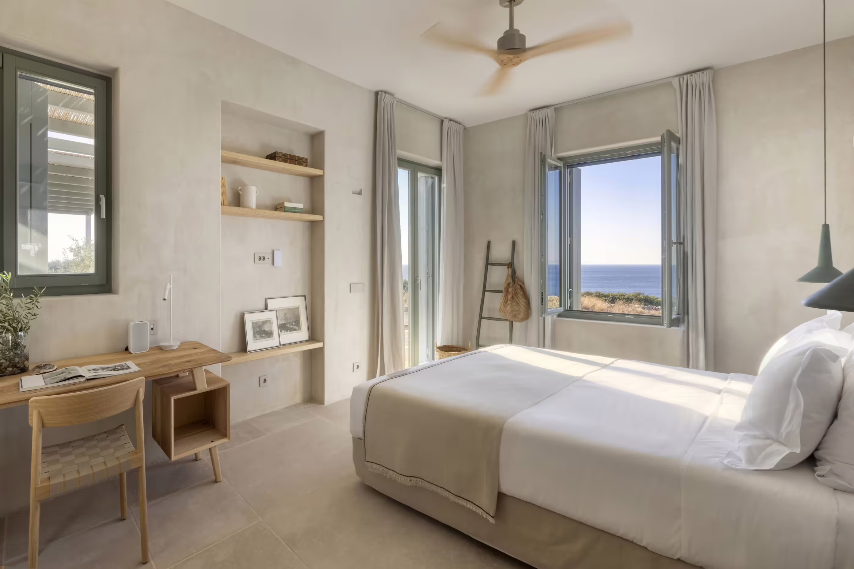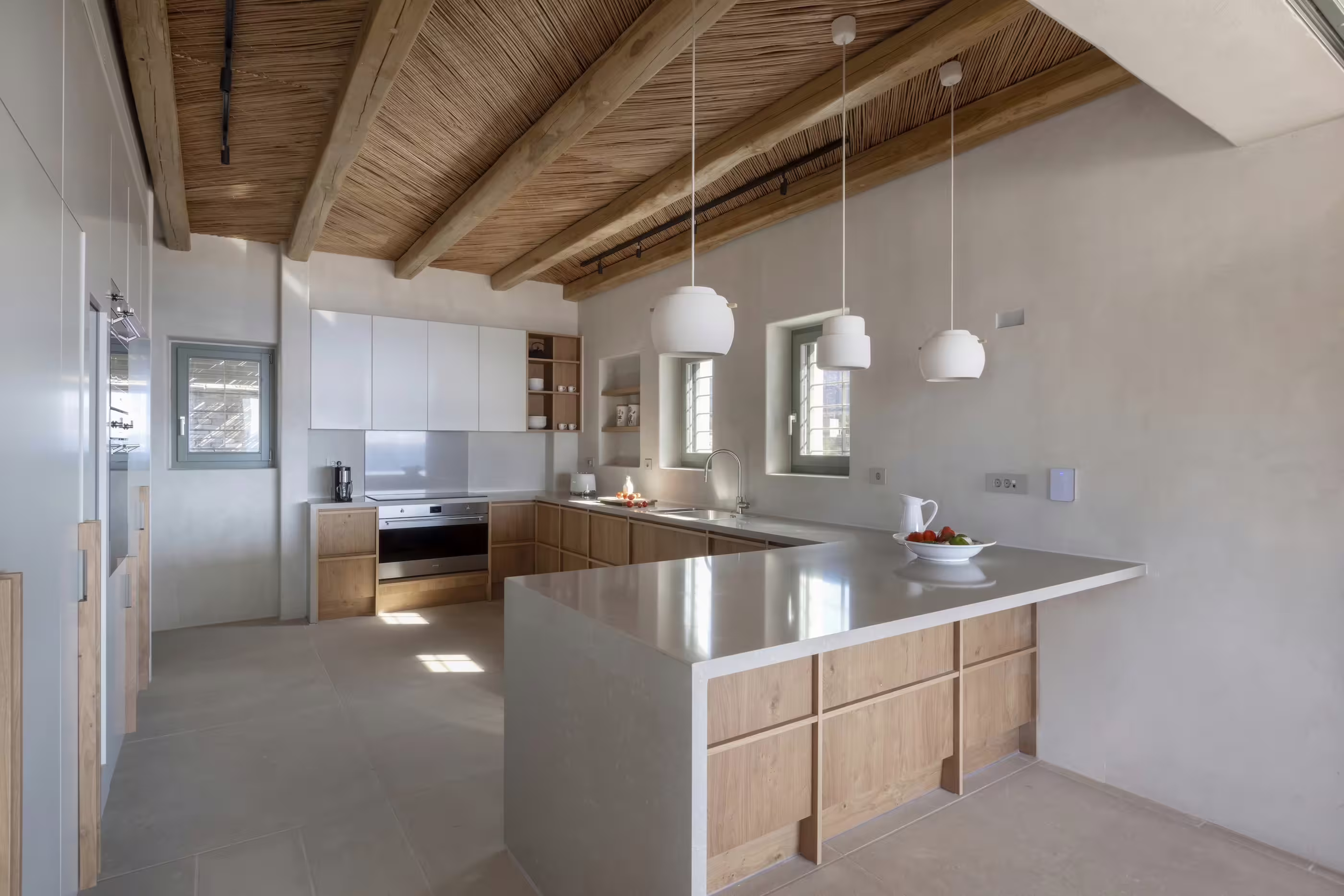 Five interconnected buildings form this spacious property, linked by shaded pergolas, stone pathways, cozy courtyards, and gardens abundant with Mediterranean greenery. At its heart lies an infinity pool bordered by a wooden deck, ideal for sunbathing or quiet relaxation. A large, shaded outdoor living area with a bar and dining space invites leisurely days and intimate evenings by the sea.