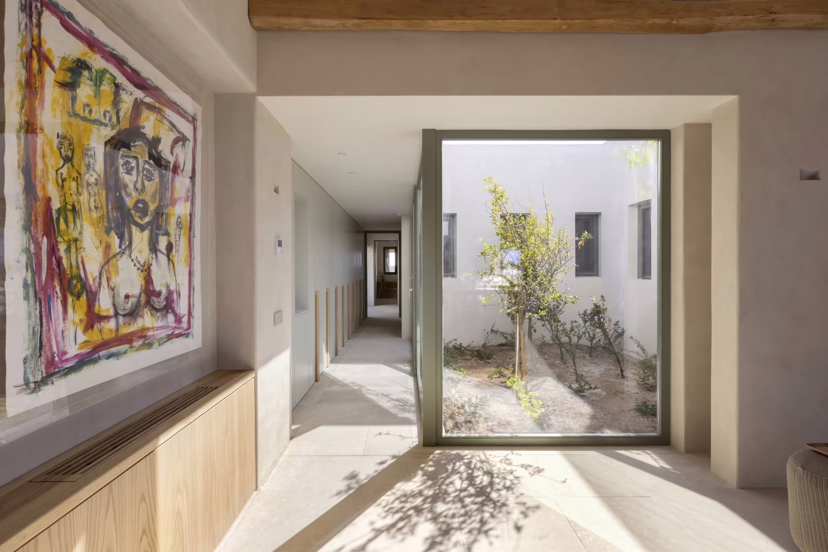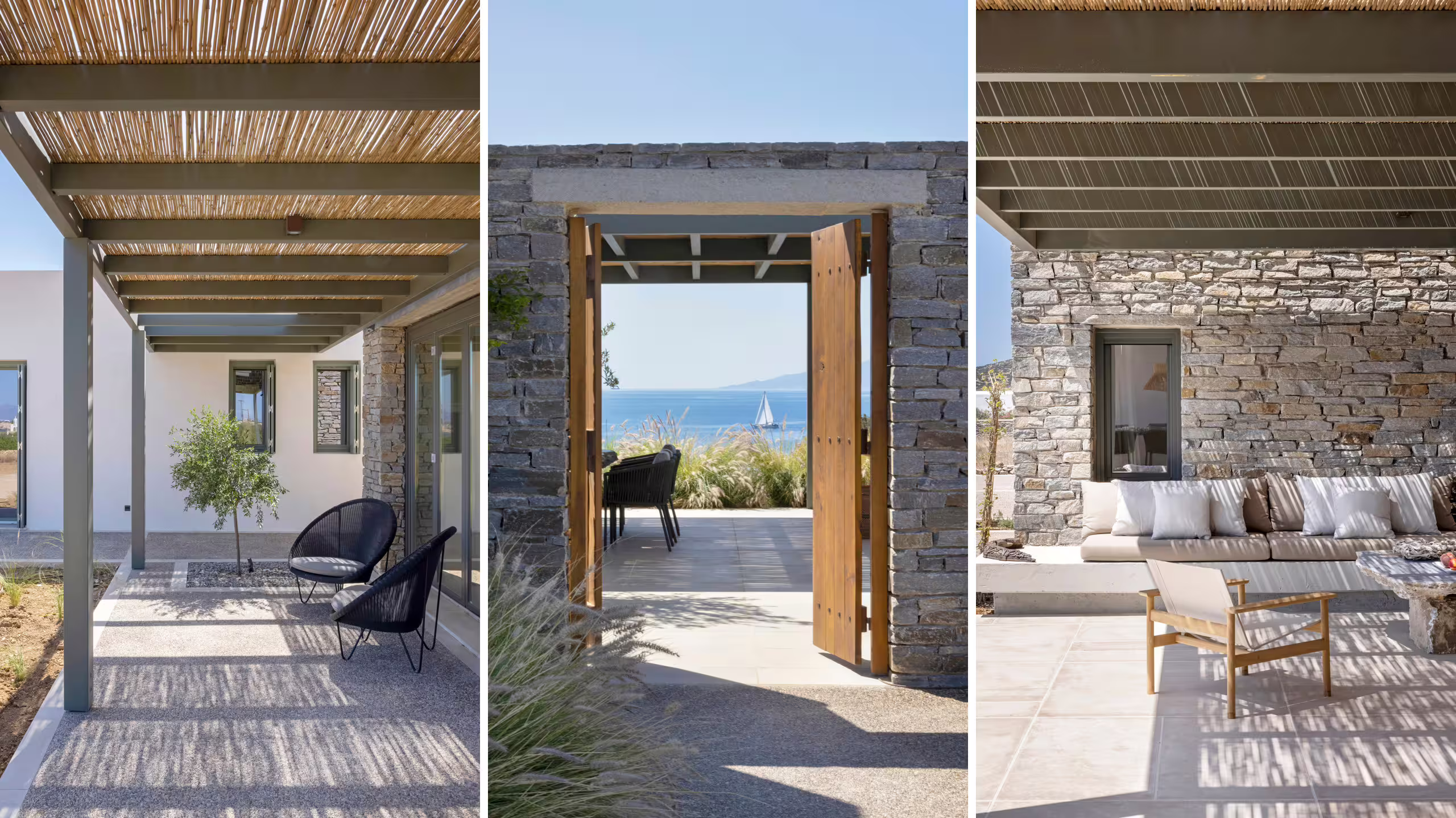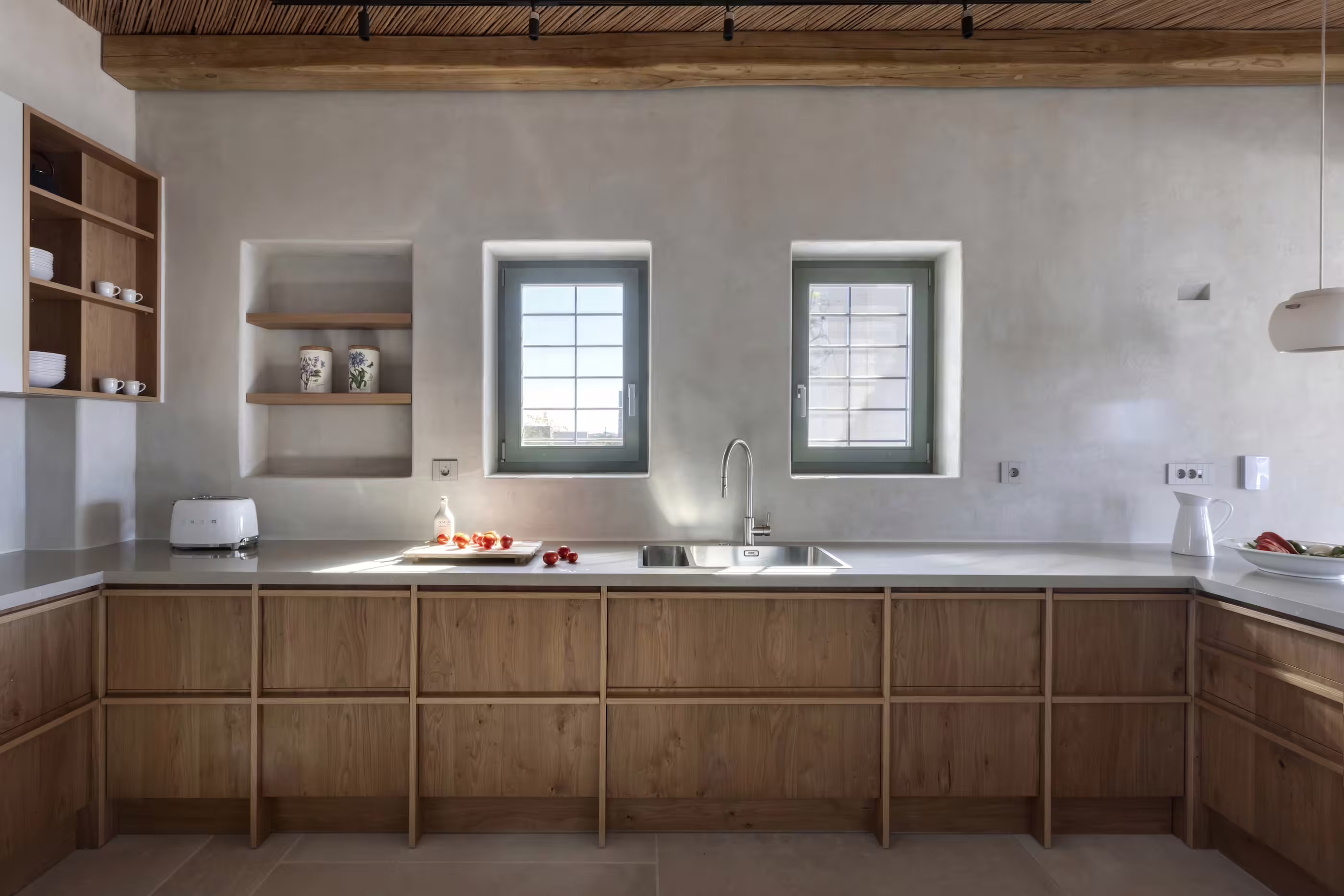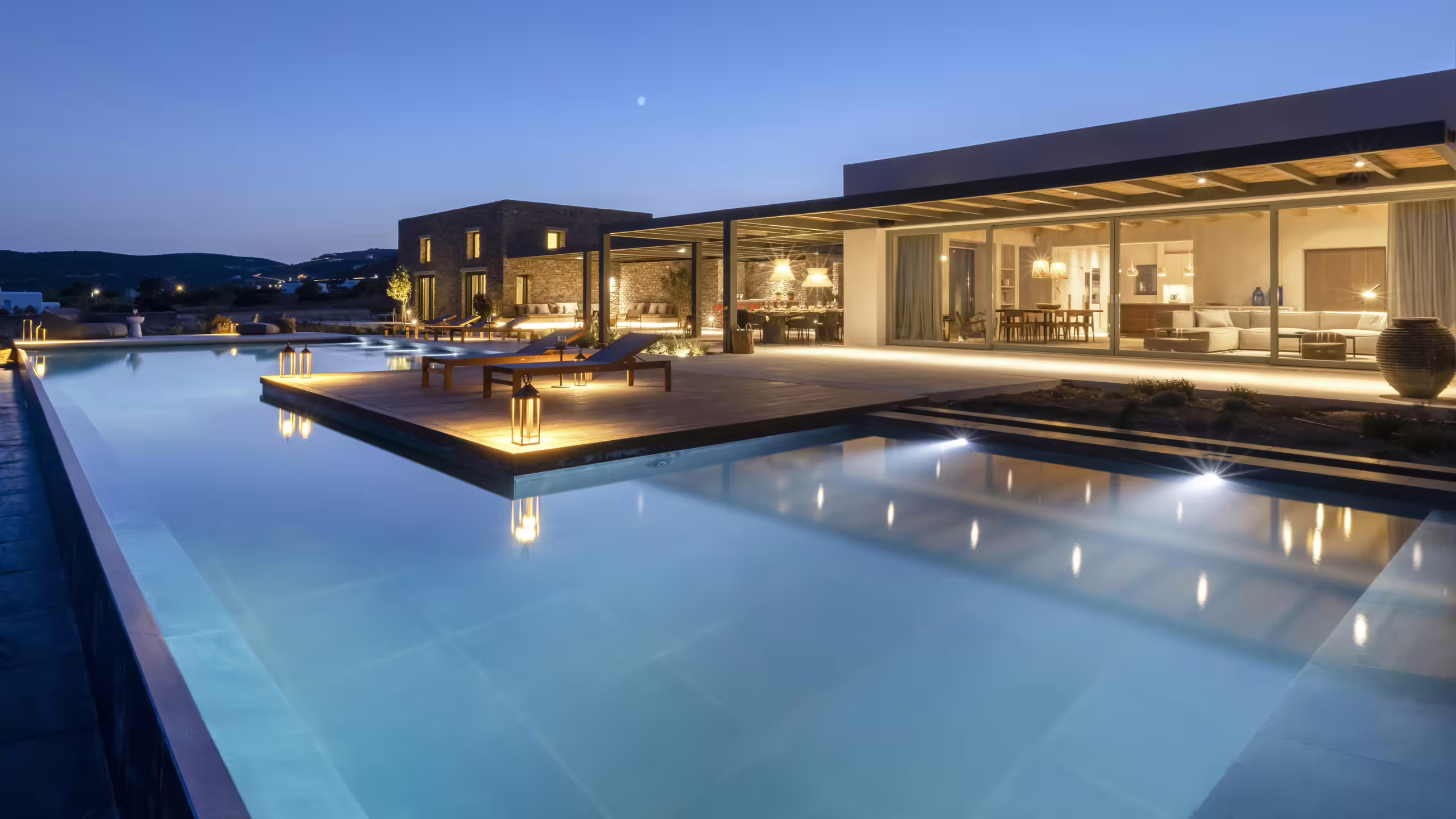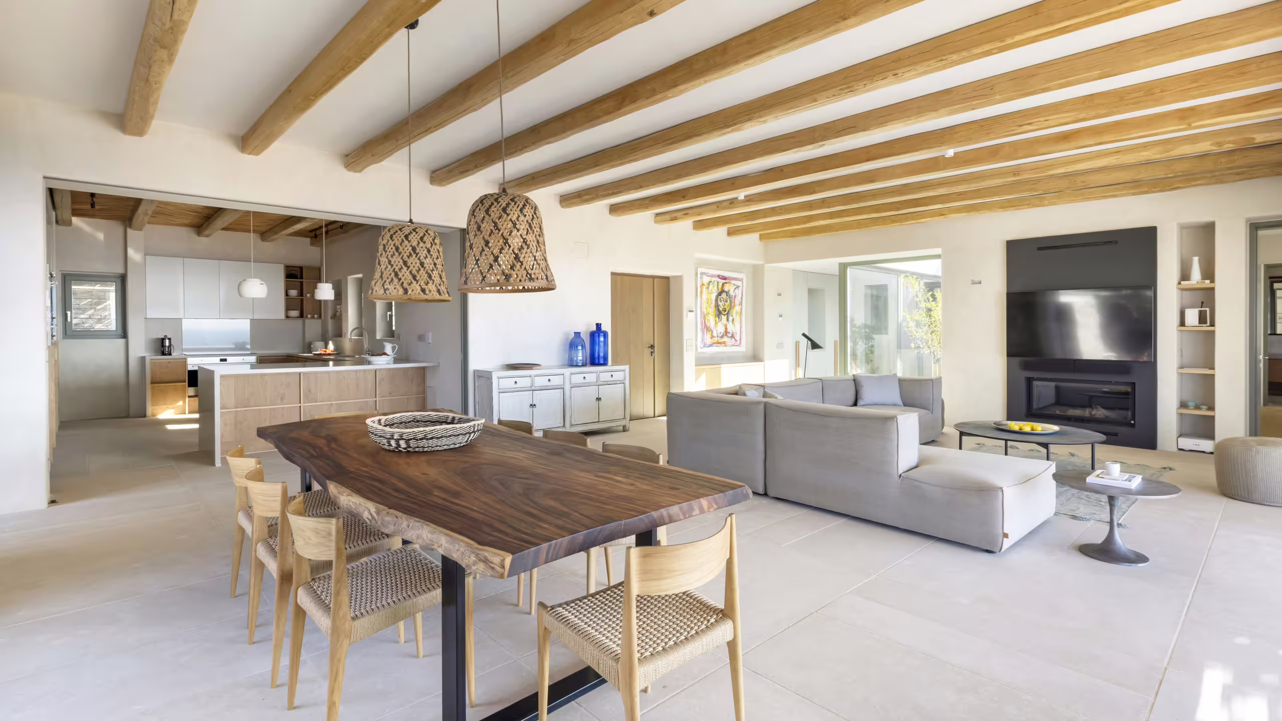 Five interconnected buildings form this spacious property, linked by shaded pergolas, stone pathways, cozy courtyards, and gardens abundant with Mediterranean greenery. At its heart lies an infinity pool bordered by a wooden deck, ideal for sunbathing or quiet relaxation. A large, shaded outdoor living area with a bar and dining space invites leisurely days and intimate evenings by the sea.