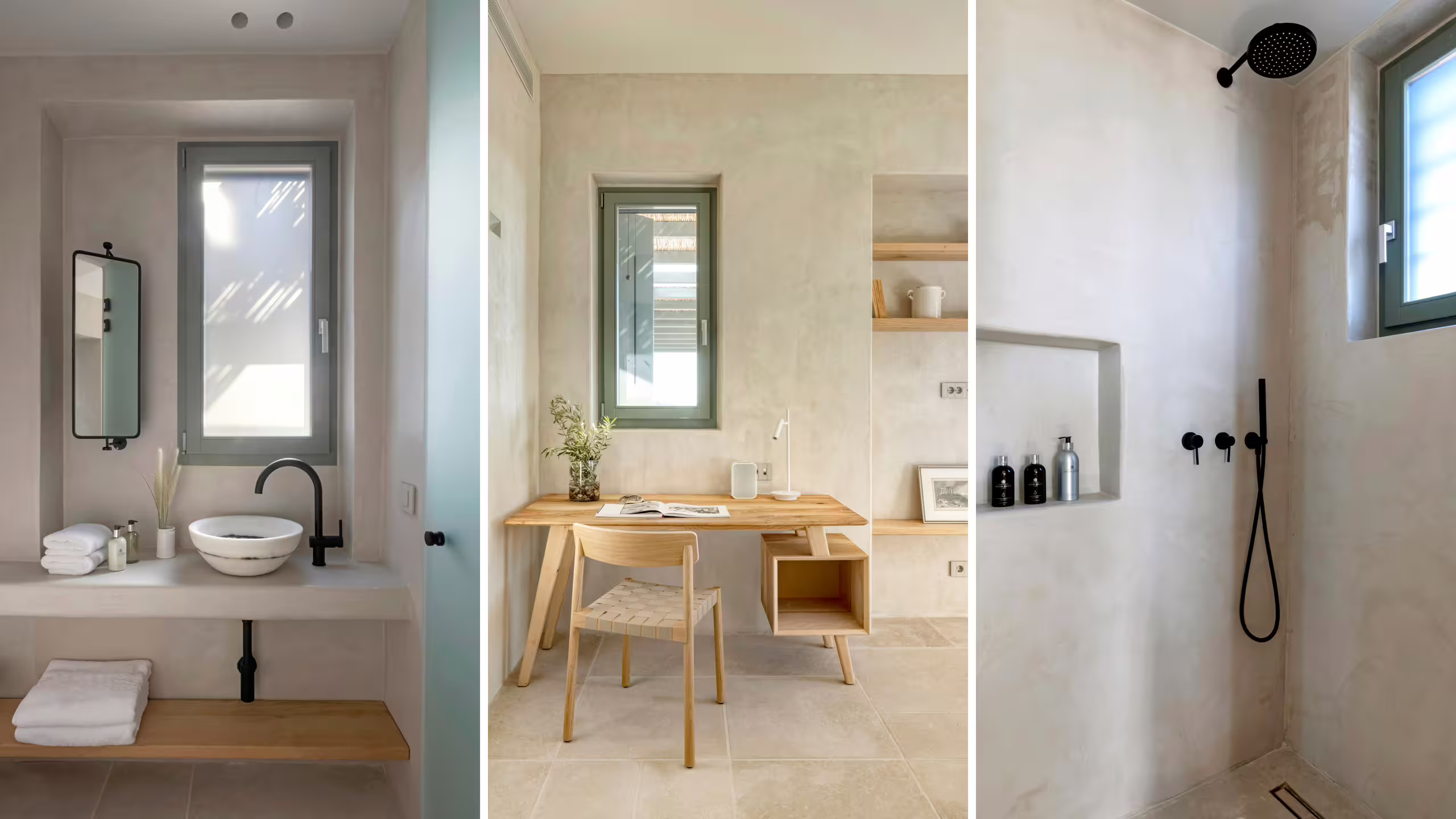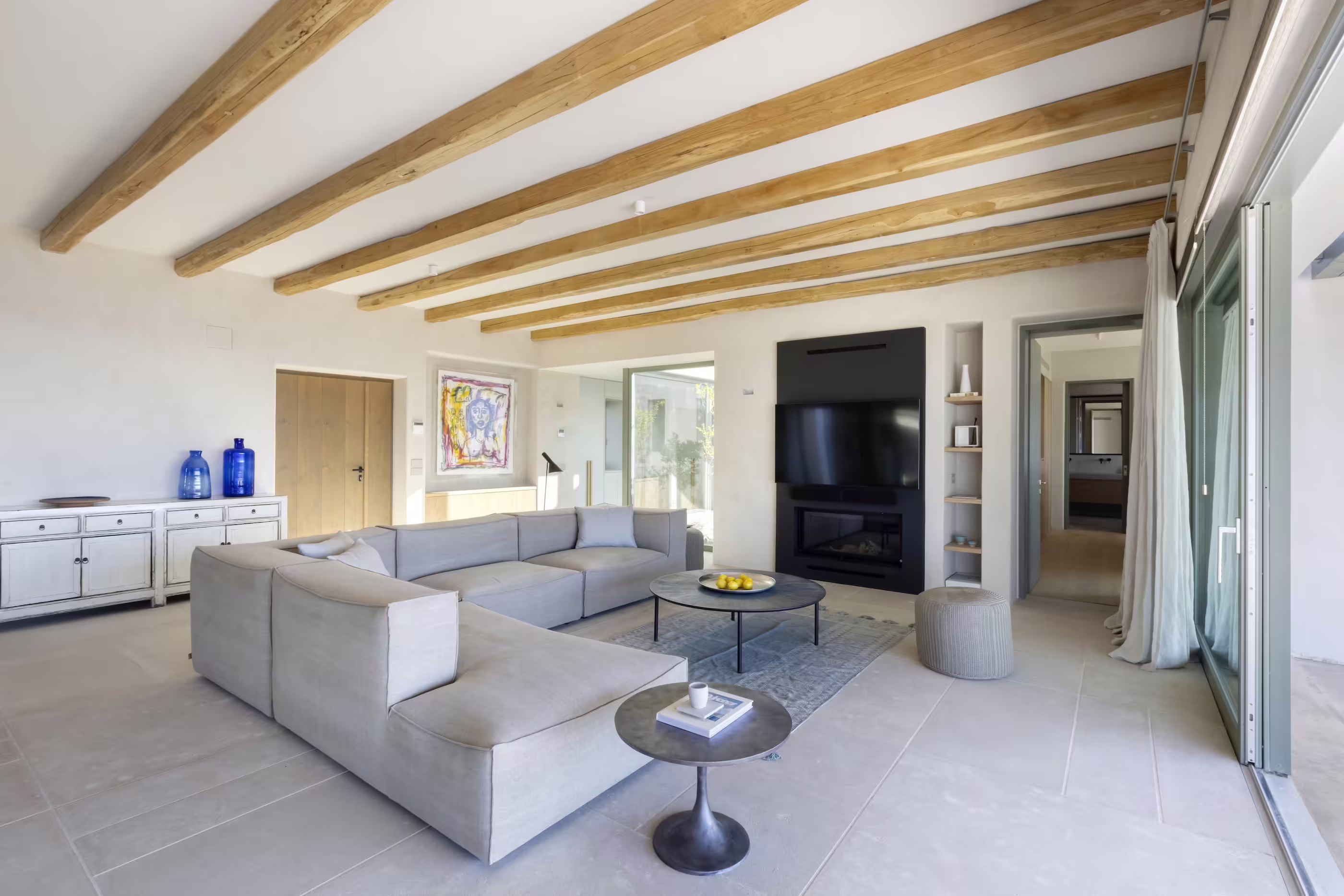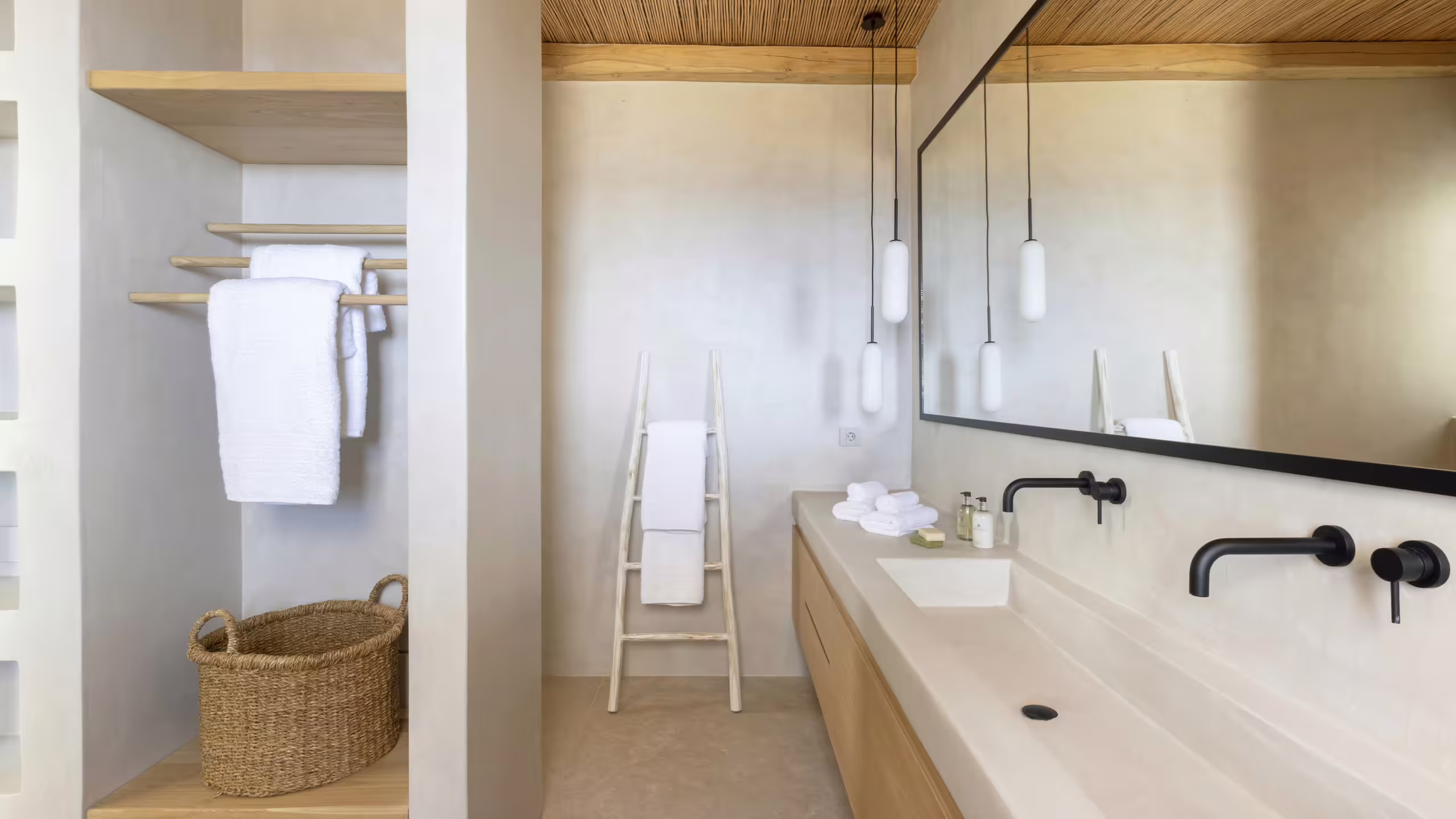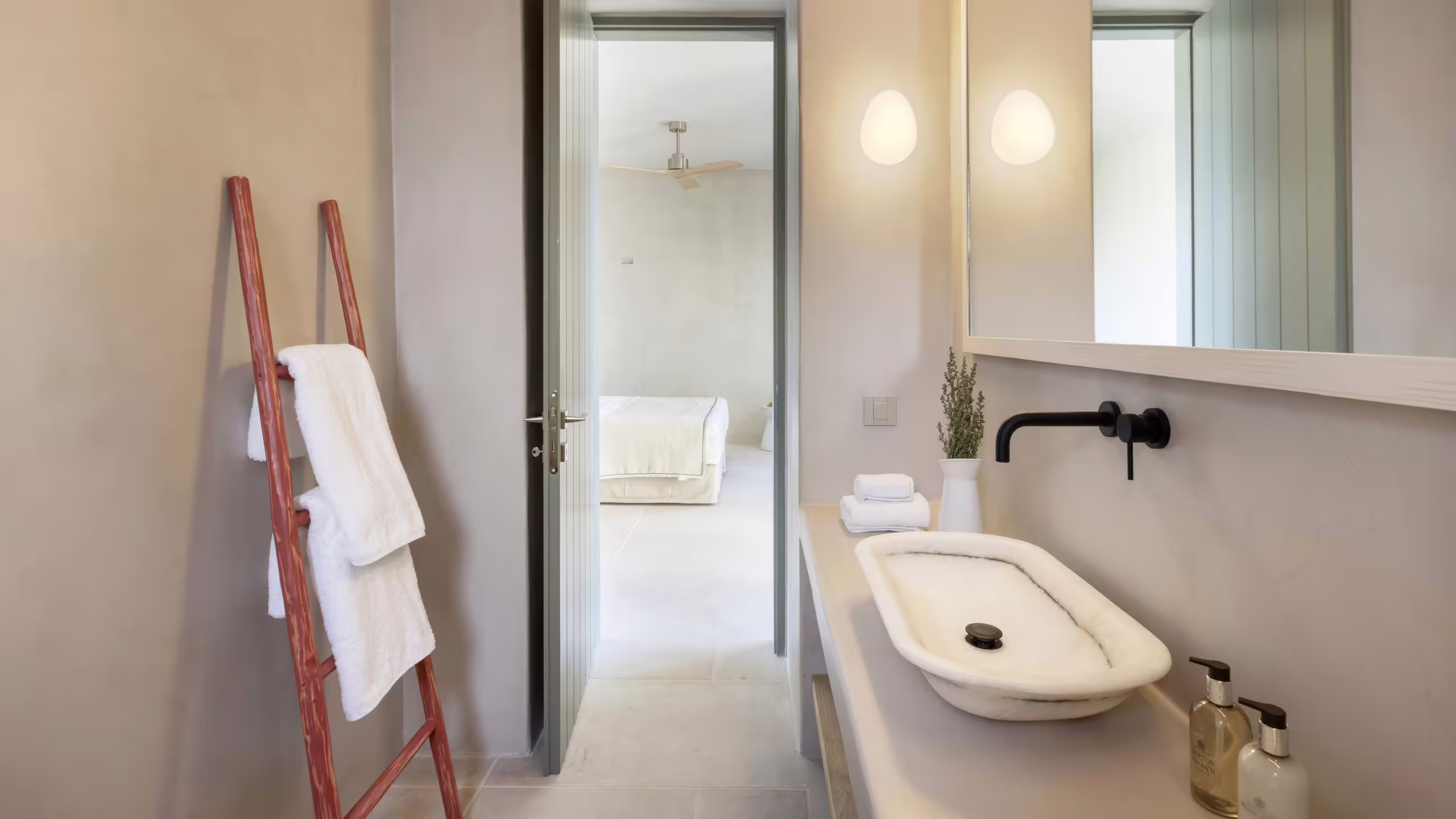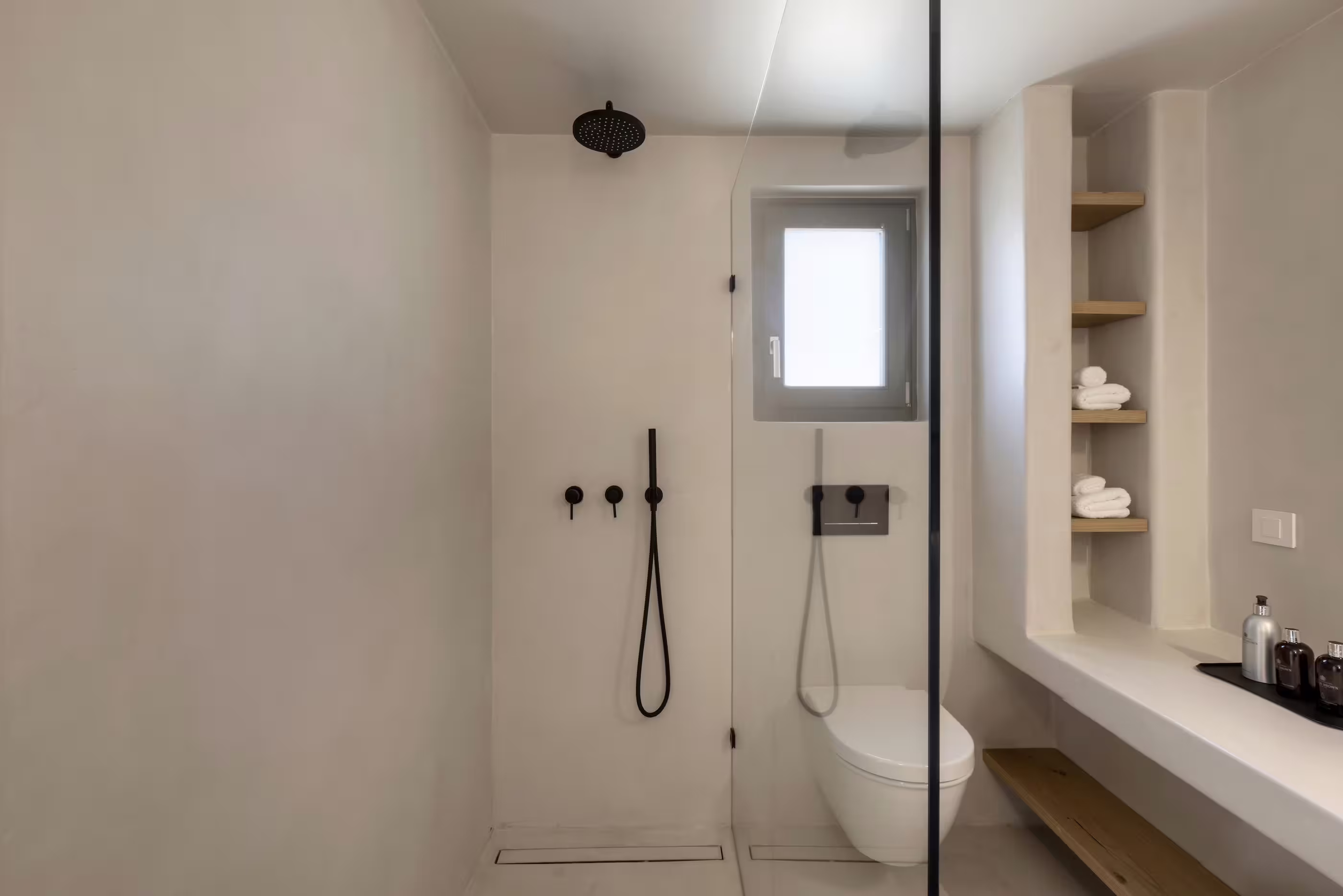 Five interconnected buildings form this spacious property, linked by shaded pergolas, stone pathways, cozy courtyards, and gardens abundant with Mediterranean greenery. At its heart lies an infinity pool bordered by a wooden deck, ideal for sunbathing or quiet relaxation. A large, shaded outdoor living area with a bar and dining space invites leisurely days and intimate evenings by the sea.