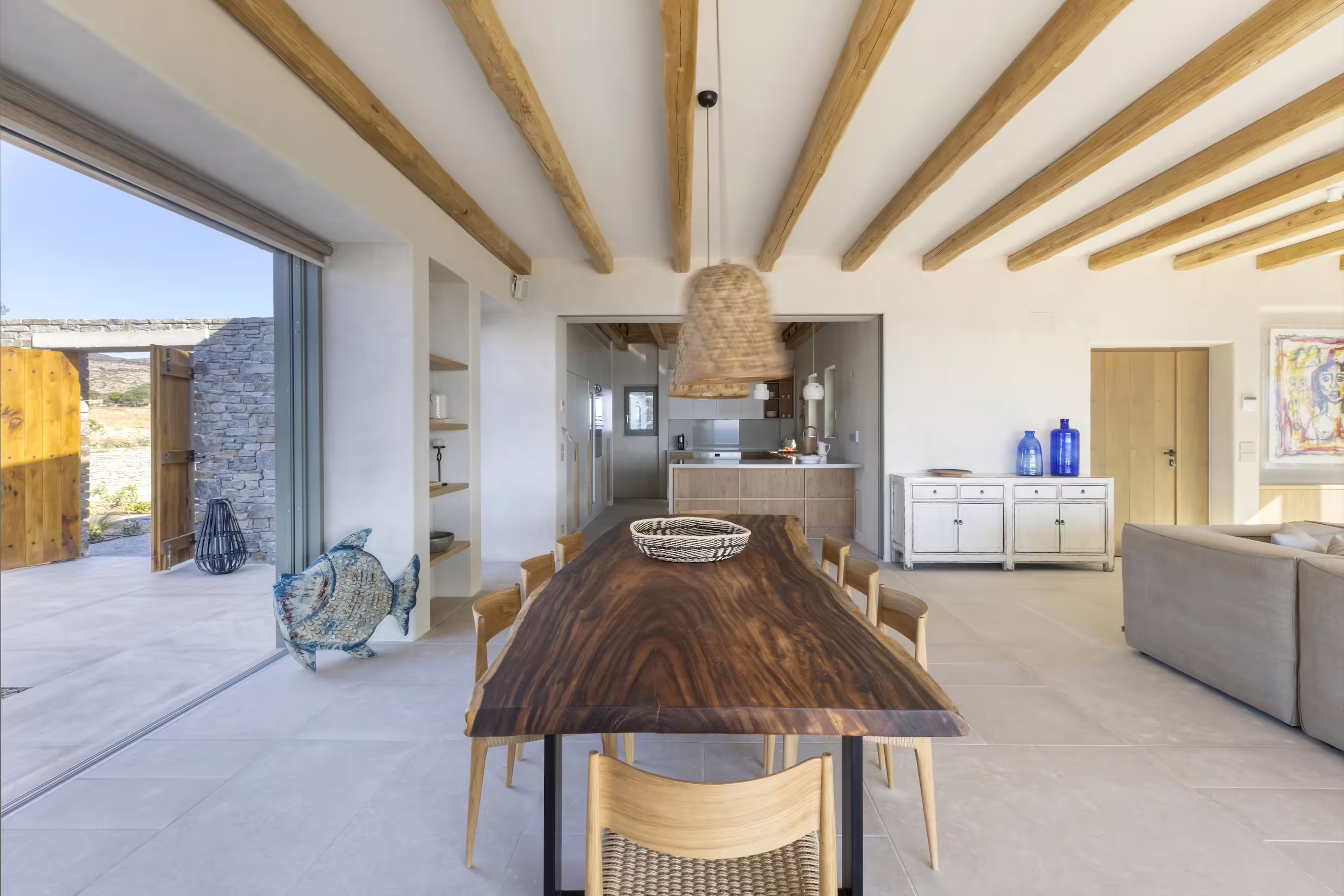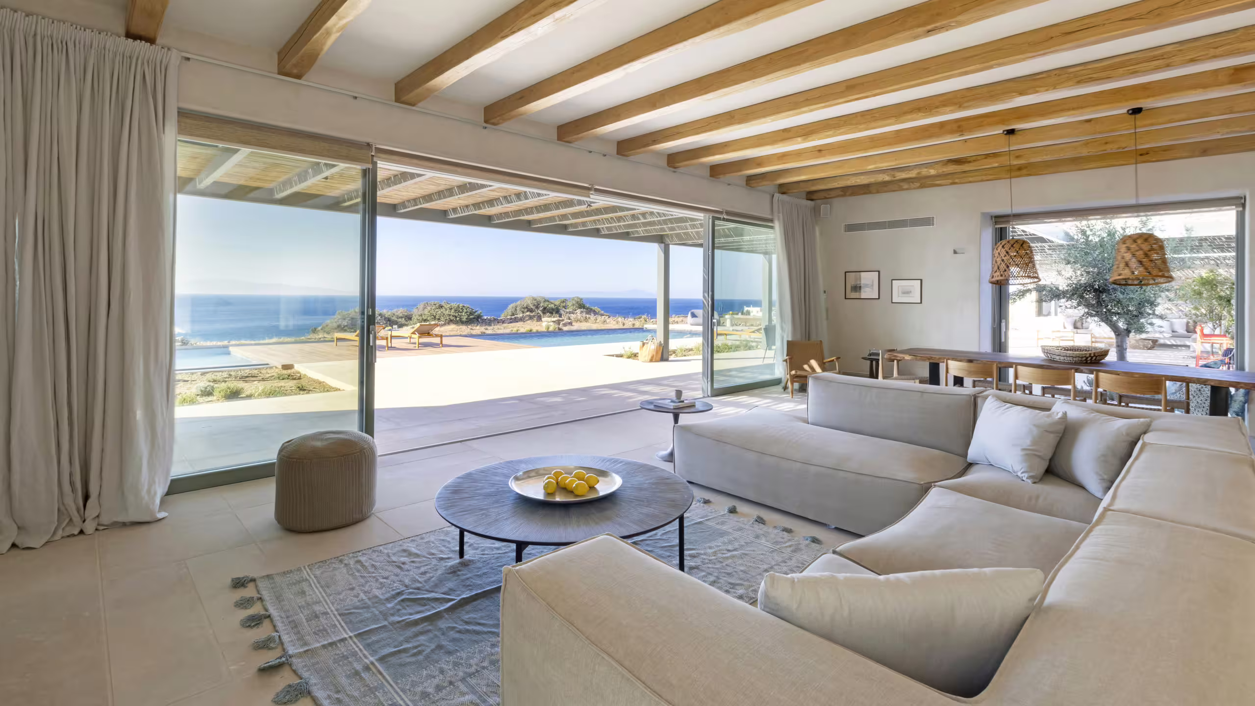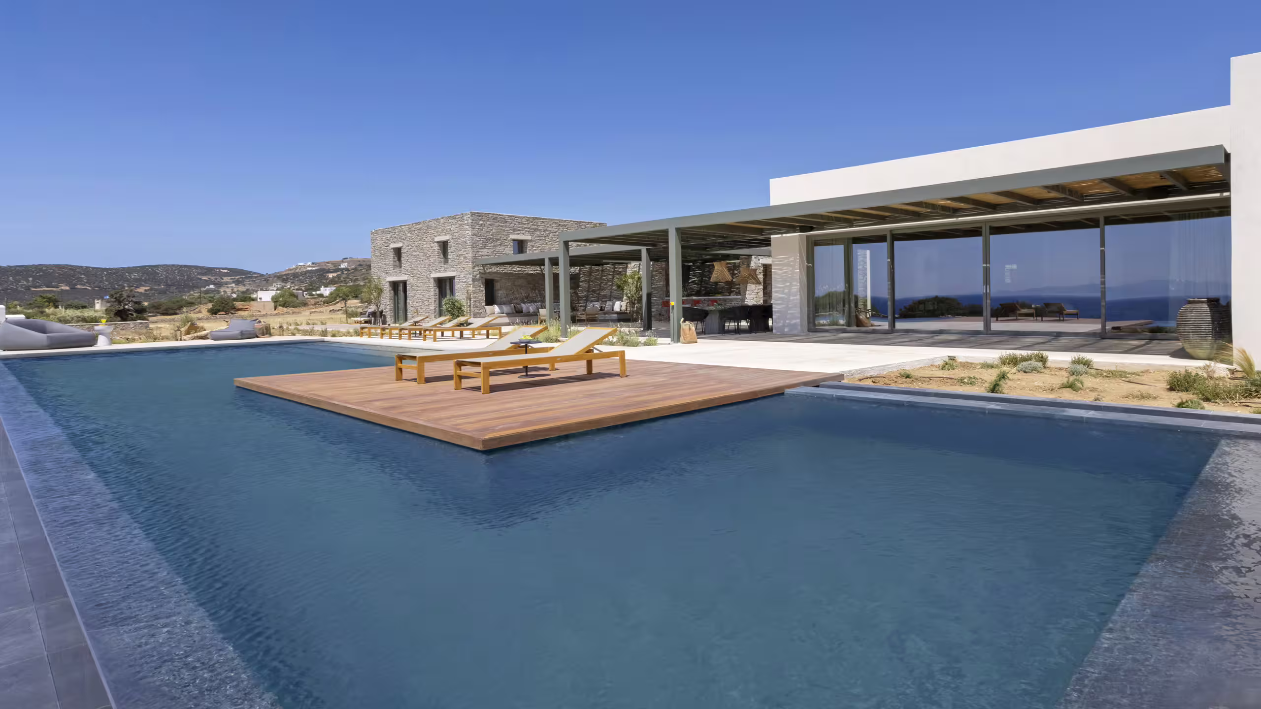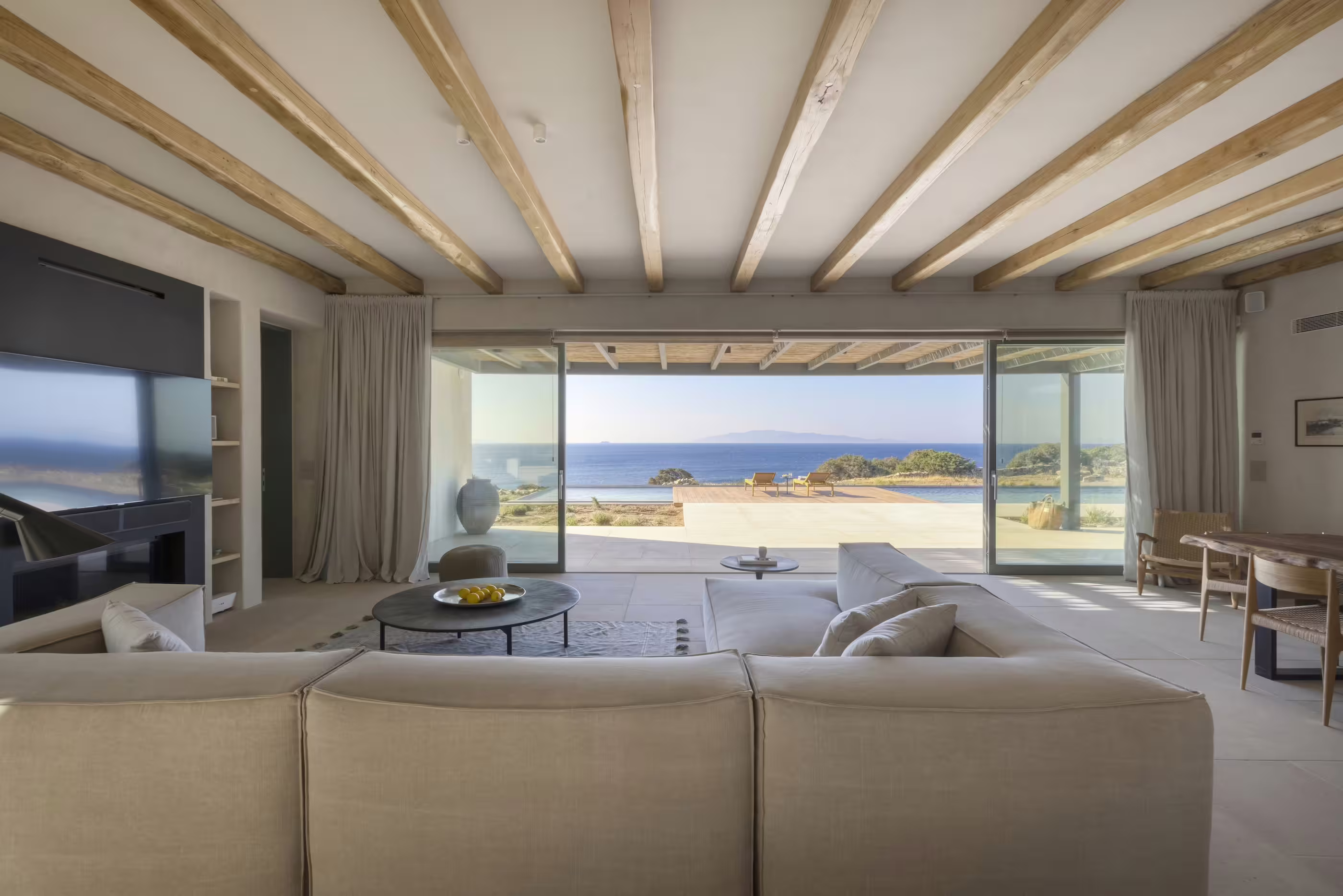 On the serene southern coast of Paros sits Villa Helia, an impressive property framed by untouched natural beauty. Completely private, the villa stands alone with easy, direct access to the sea—whether by stepping down the rocky path in front, strolling toward Glyfa and Pastelos beaches nearby, or exploring secluded coves along the shoreline.