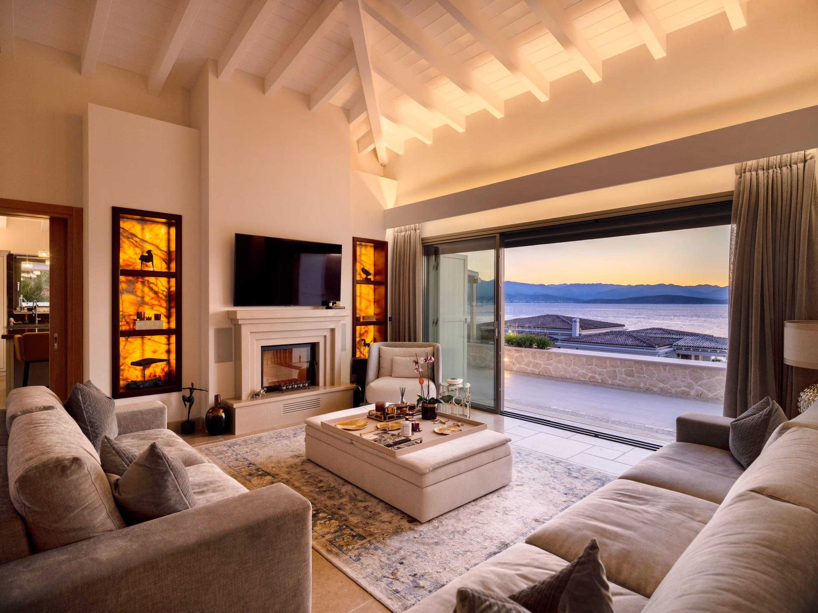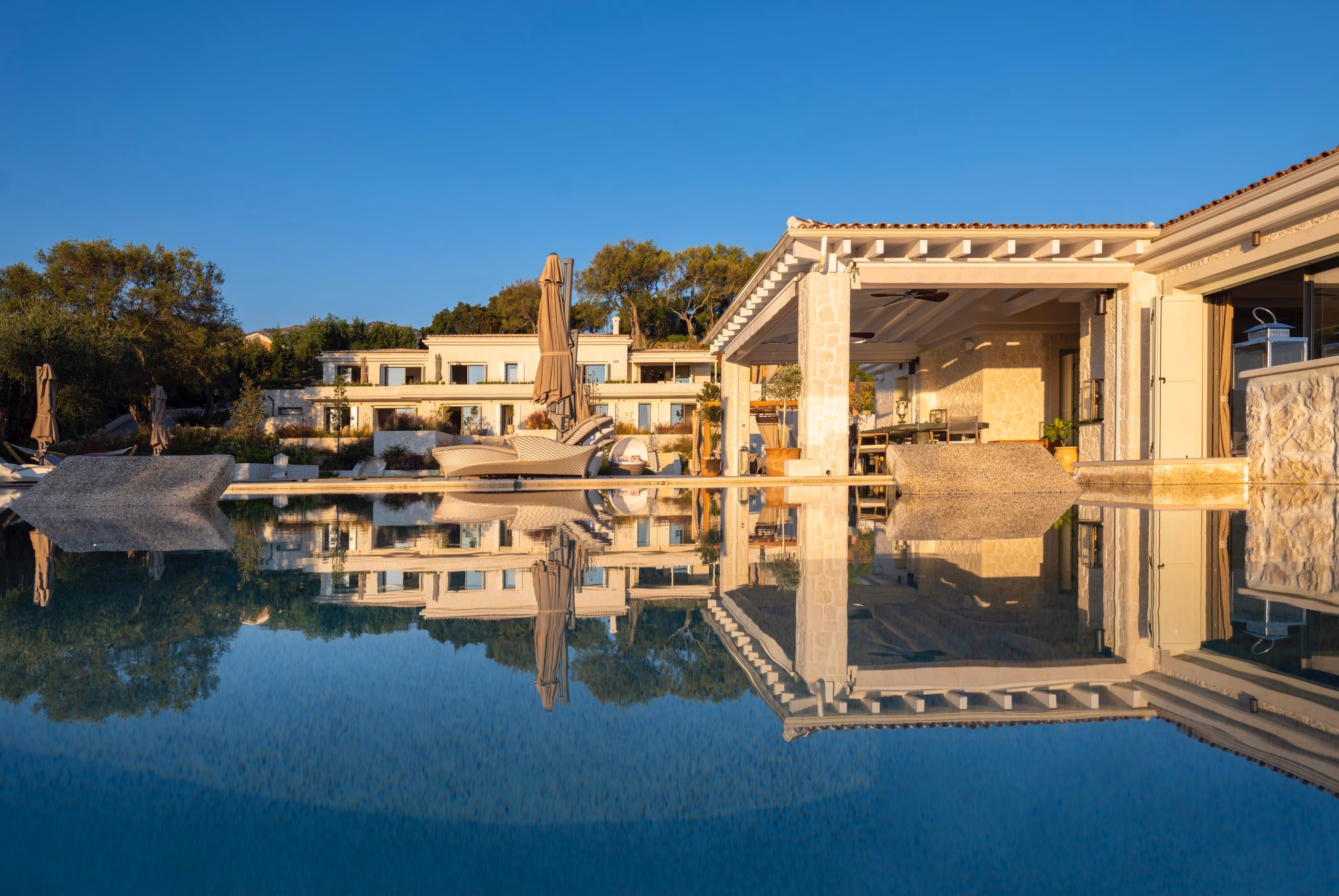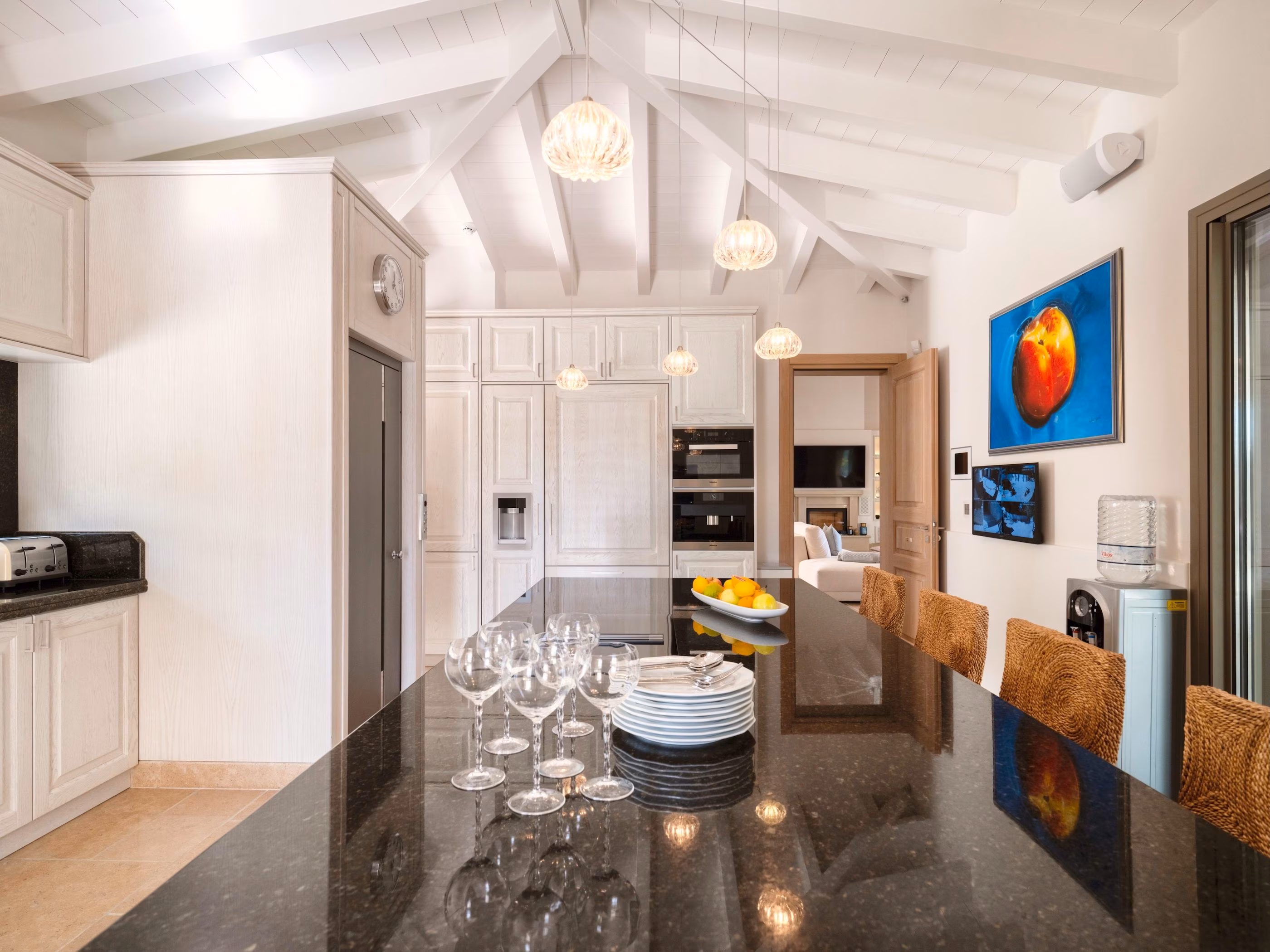 Designed for grand socializing and comfortable family living, the villa’s living spaces are serene with easy-on-the-eye decor. It comfortably seats twenty for dinner. Unparalleled KNX smart home technology is installed throughout, customized specifically for this unique property.