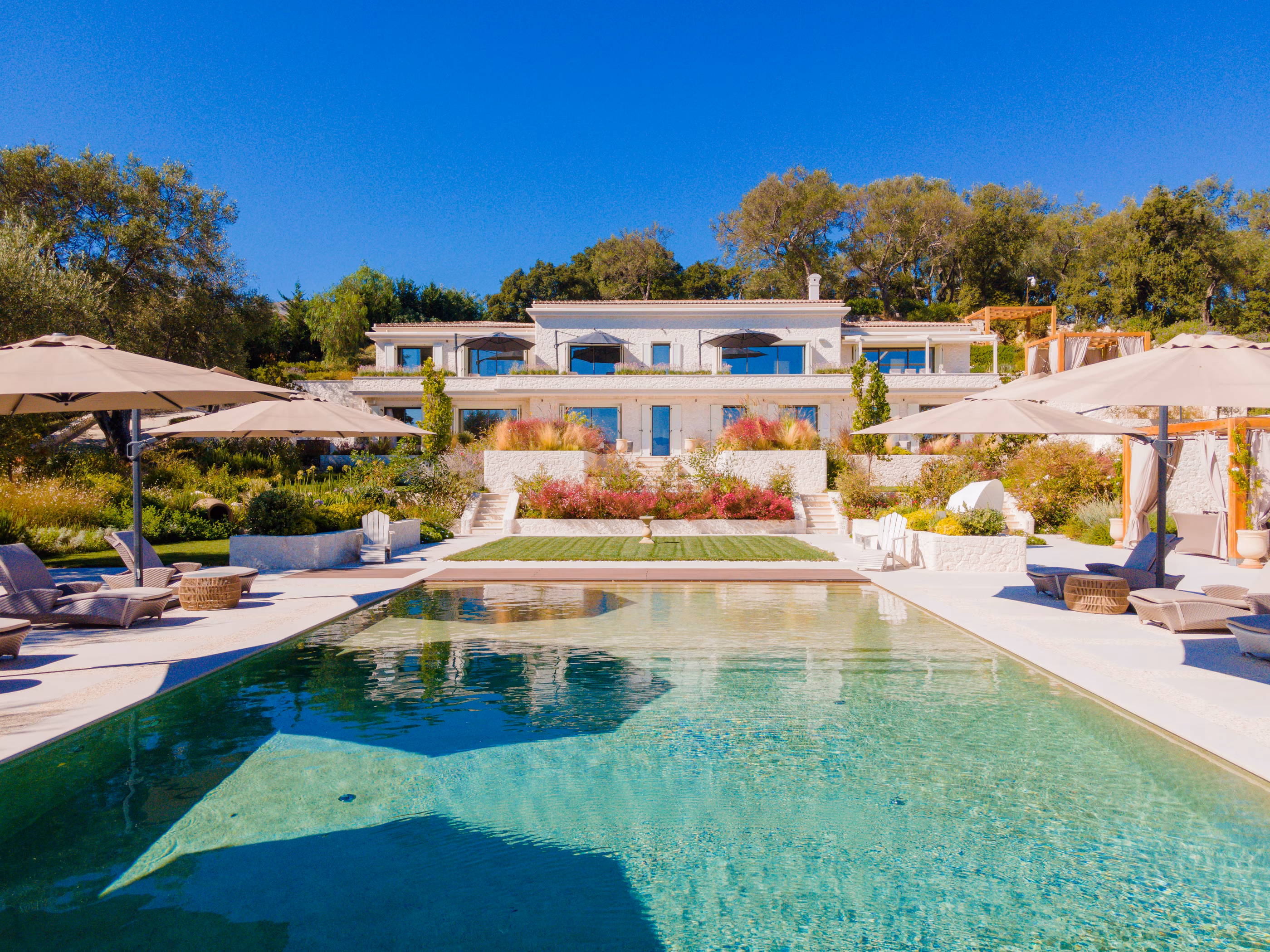 This Villa is the epitome of elegance in a gloriously panoramic setting. Beautiful grounds, captivating views, and verdant surroundings open onto the sparkling waters of the Mediterranean. A tale of two homes, with 11 exceedingly spacious en-suite bedroom suites. Four bedrooms are in the main house and five in the other, joined by an underground pathway. Additionally, there is a two-bedroom gatehouse.