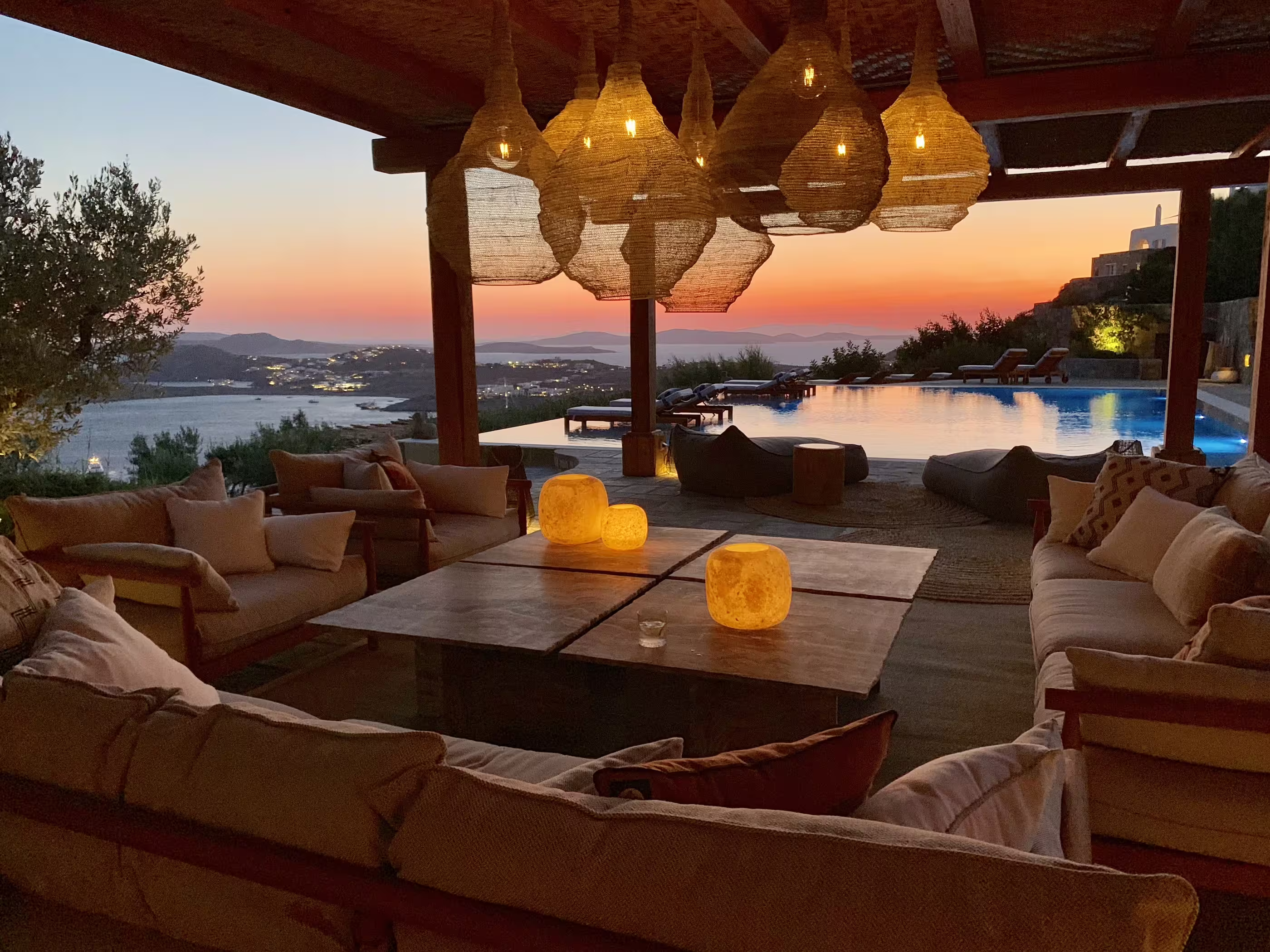 Infinity Estate is a sumptuous private getaway in Mykonos’ most sought-after neighborhood, Agios Lazaros. Perched atop a hill facing Ornos Bay, it offers arguably the best sunset view on the island.