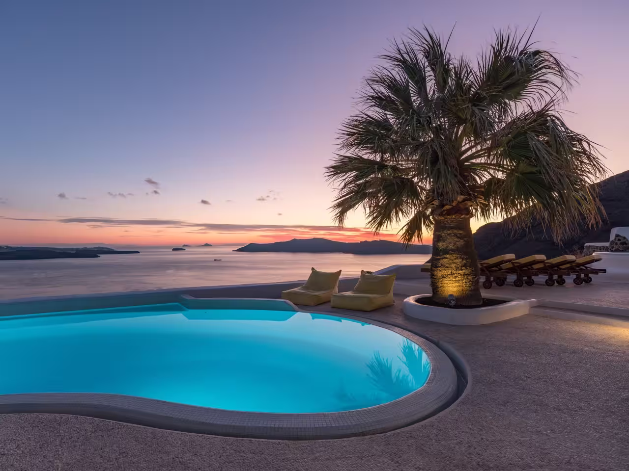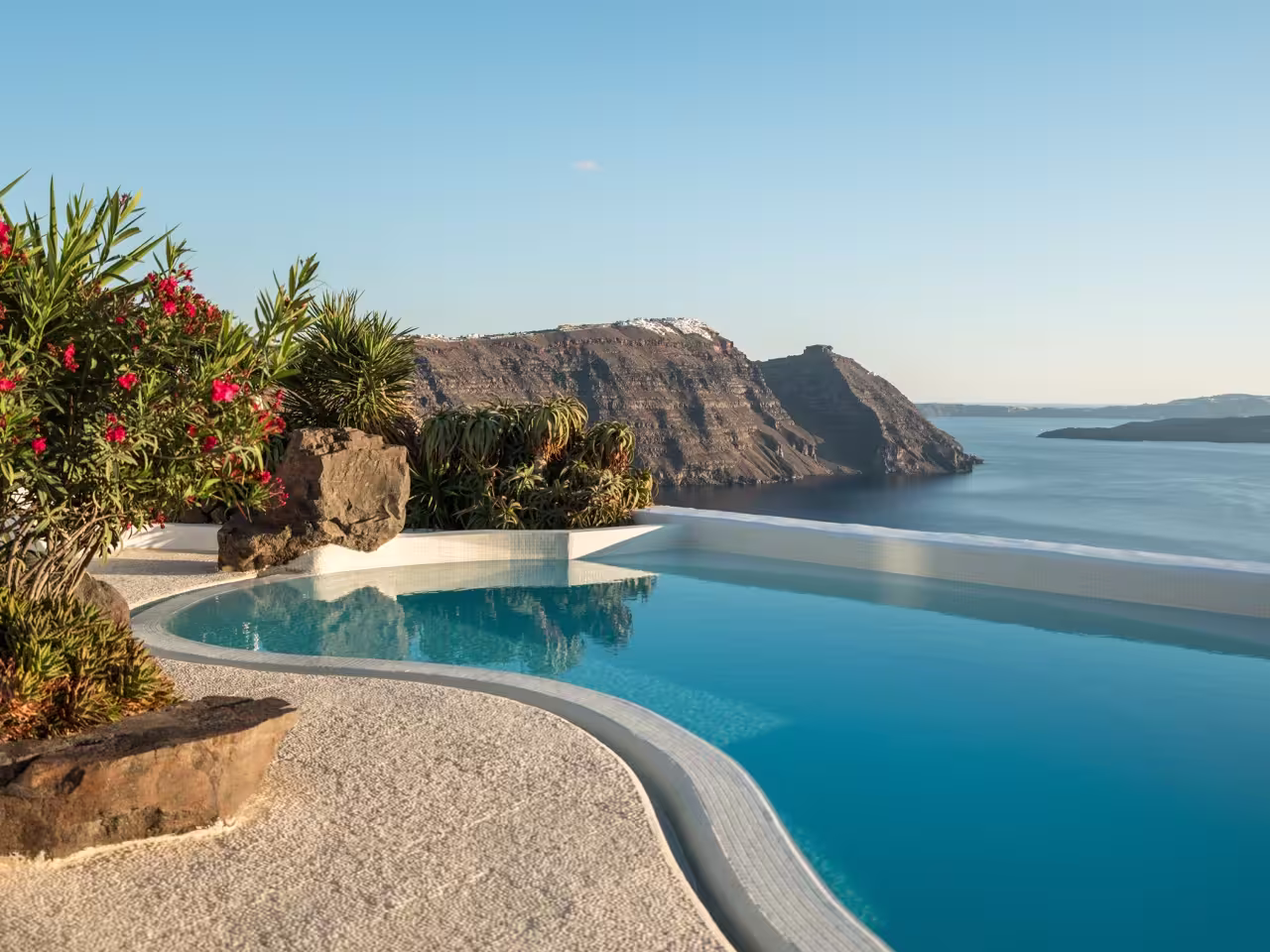 Perched on the cliffs of the Caldera, in a dramatic setting of lava rocks and crystal blue waters, the villa hovers above the horizon, offering breathtaking views of the Aegean Sea. Conveniently located between Fira and Oia, it is easily accessible from the main road yet hidden from the crowds.
