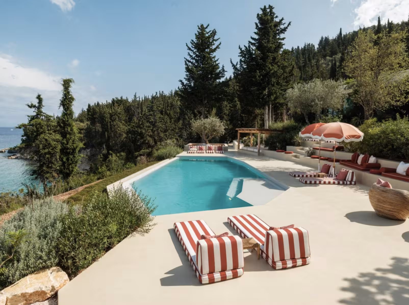 The interiors have been chosen with the utmost care and taste, each element is a piece of artwork in itself. The walls have been designed at angles, and frame the collections of unusual ceramics and iconic pieces of furniture. Everything is of the highest quality- beautiful and unique. A secretive courtyard garden studded with sculpted plants leads from the open plan sitting area- an ideal area to enjoy breakfast or evening drinks. Comfortable sunbeds surround the pool, placed to gaze out over one of the best beaches on the island. The outdoor bar and dining area is a wonderful area to while away the long afternoons. Off the terrace is a garden path leading down to the beach. The Villa is an exceptional house, of which the like has never been seen before on the island.