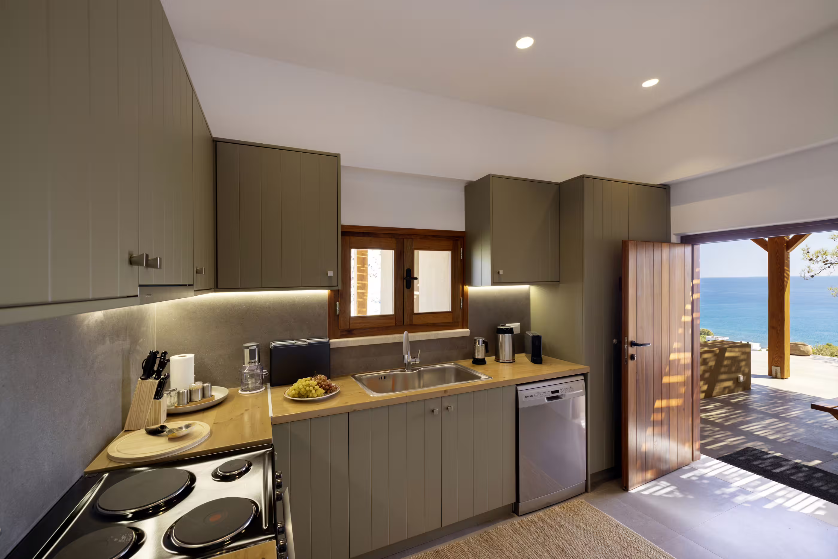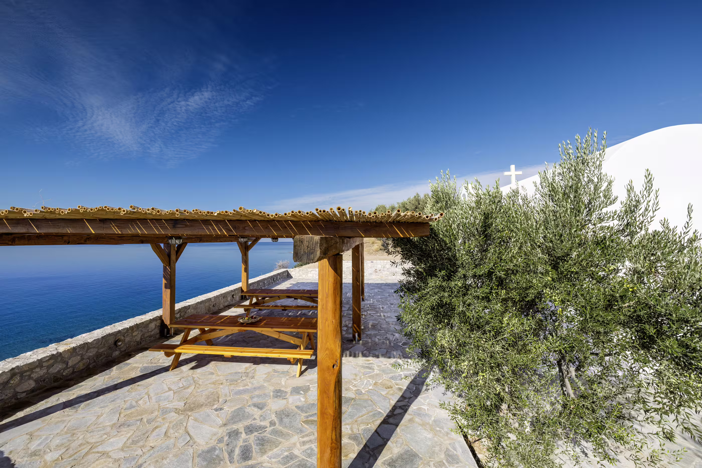 Designed with luxurious simplicity, the villa features 10 sea-view bedrooms, 6 with direct beach access. Guests can relax under the main pergola, which includes alfresco dining areas, a built-in sofa, and an infinity pool blending with the horizon. A separate pergola hosts a fully equipped BBQ kitchen and a long dining table, while a traditional Cretan cookery near the chapel offers an authentic culinary experience. With its secluded setting and mesmerizing night sky, this villa is a true hidden paradise.