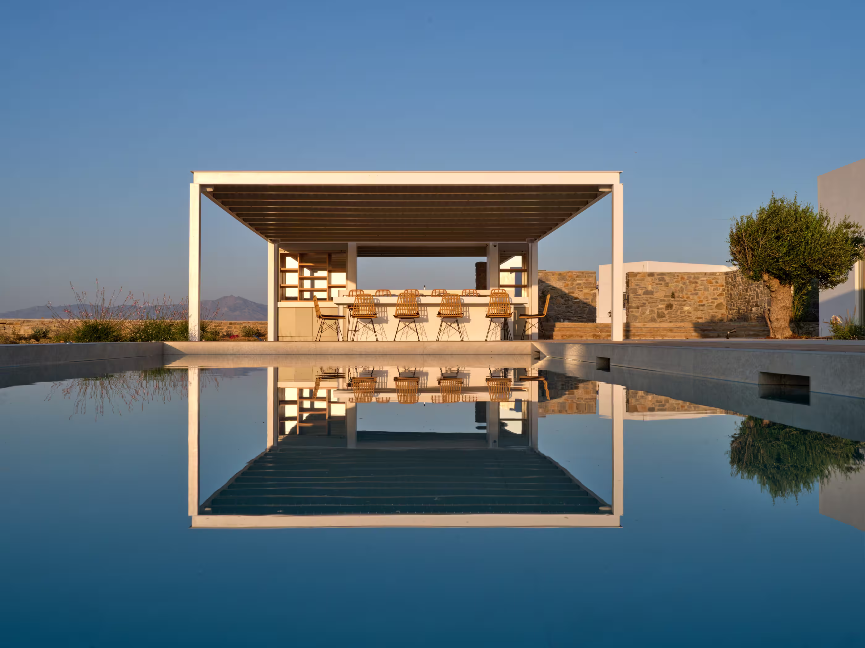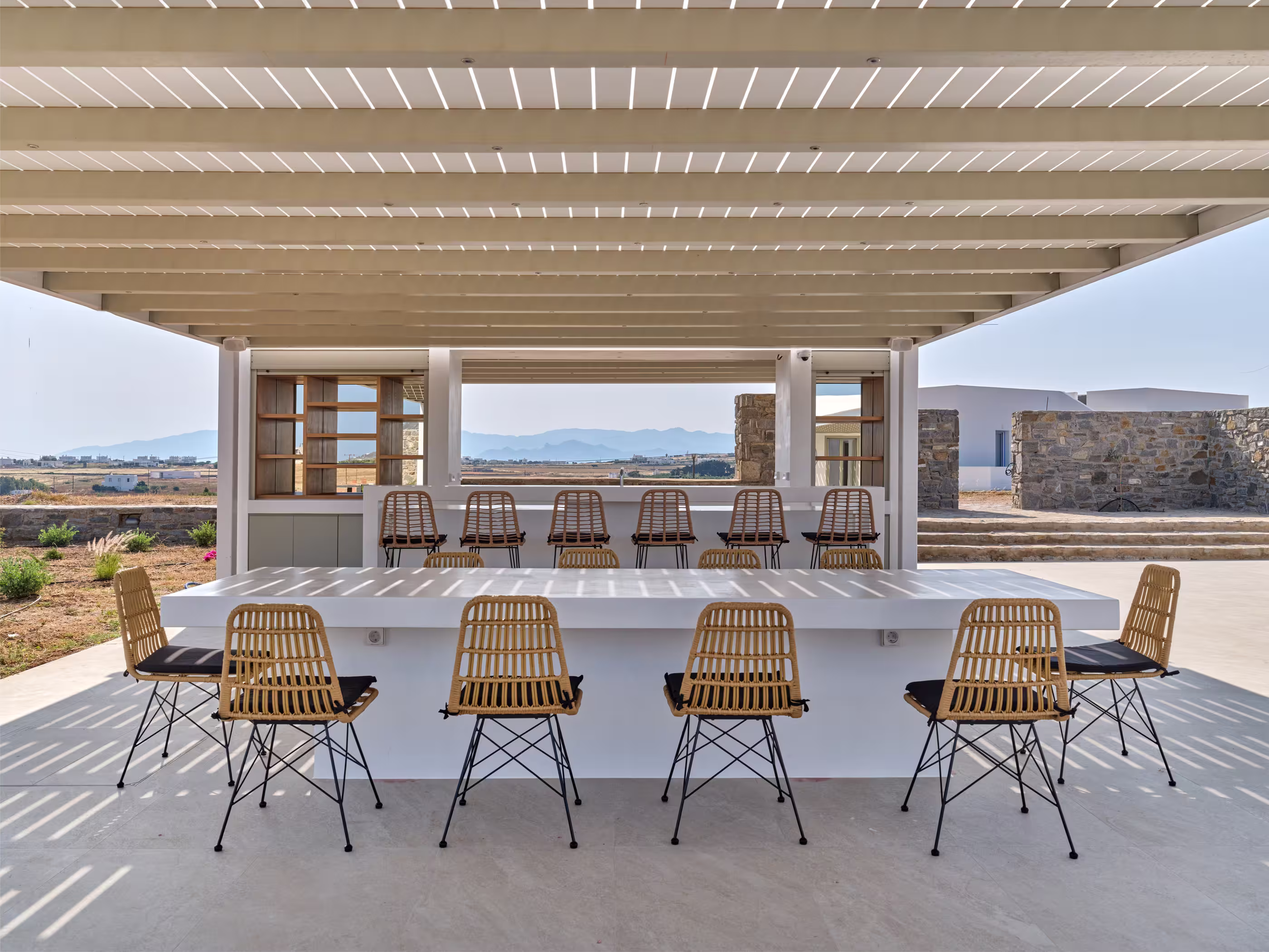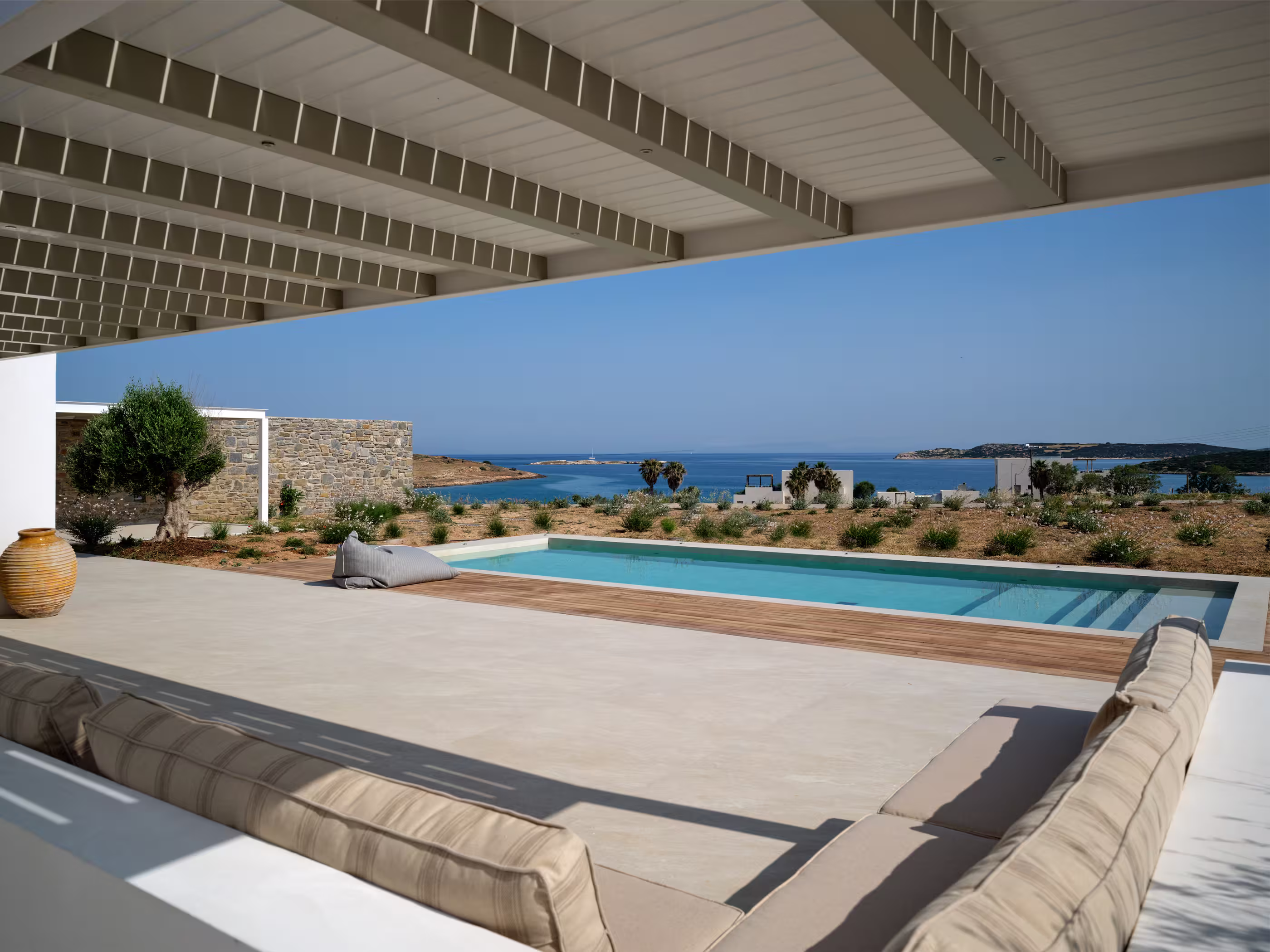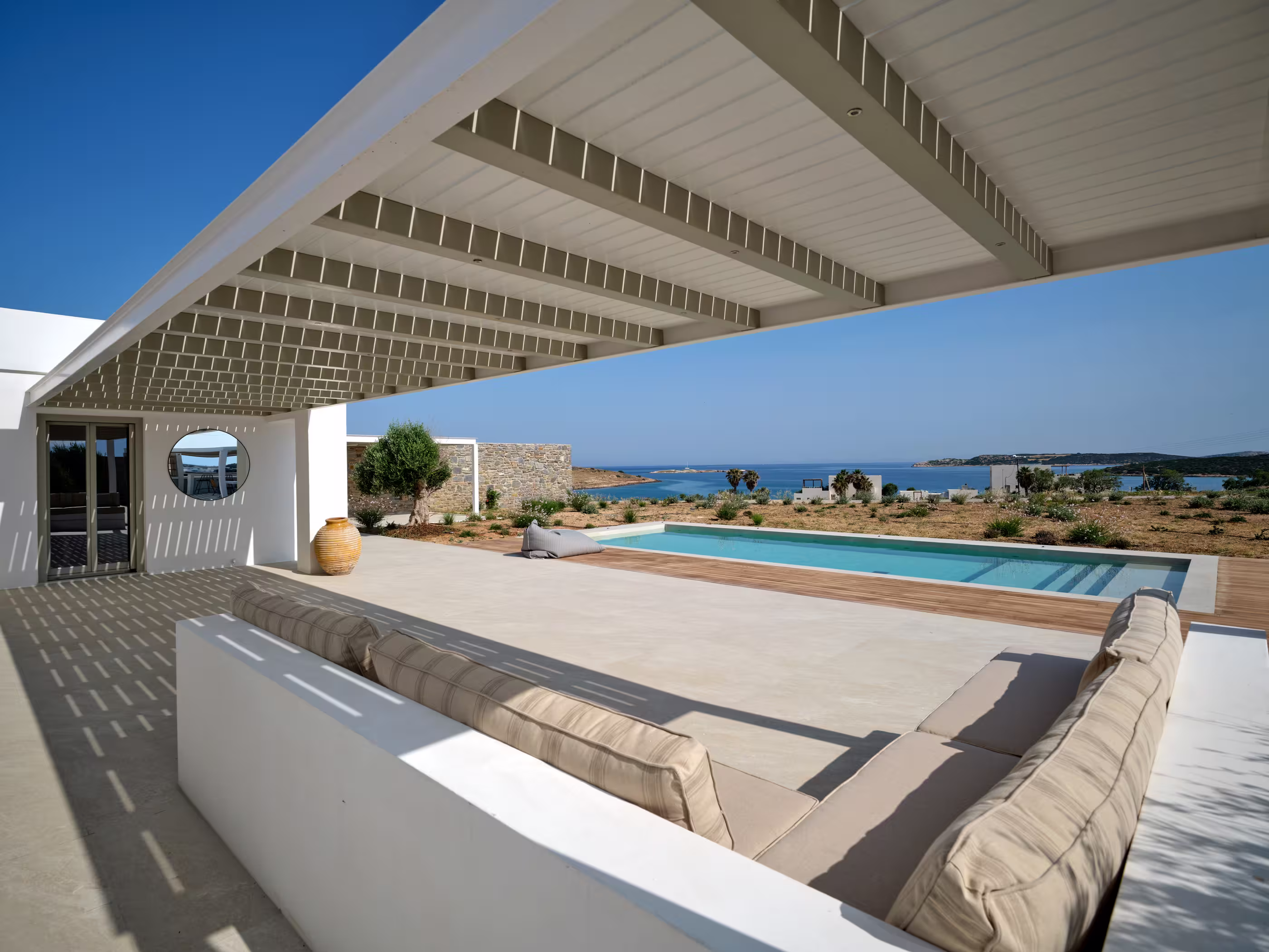 Villa Myra is a newly built hideaway in peaceful Xifara, just minutes from lively Naousa. Designed for relaxed holiday living, the villa features five double bedrooms with private bathrooms, a welcoming open-plan living area, and a fully equipped kitchen opening onto the terrace. Large windows allow natural light to flow indoors, creating a calm setting for groups seeking comfort and privacy. Outside, a private swimming pool, shaded dining space, sun loungers, and a stylish bar corner provide plenty of room for unwinding throughout the day. Air conditioning, Smart TVs, WiFi, laundry facilities, and daily housekeeping ensure a smooth, carefree stay. Nearby beaches, coastal paths, and Naousa’s dining scene are all easy to reach. Making your time here effortlessly enjoyable throughout.
