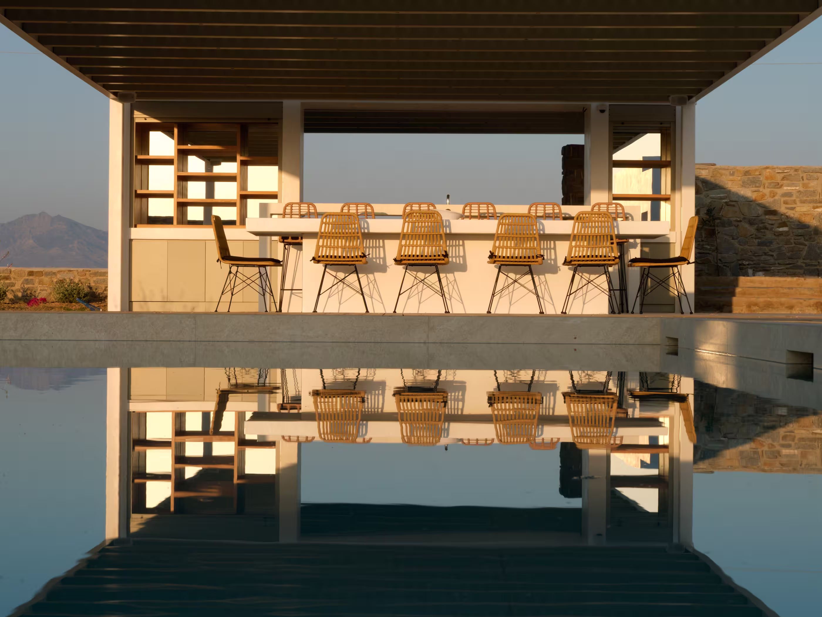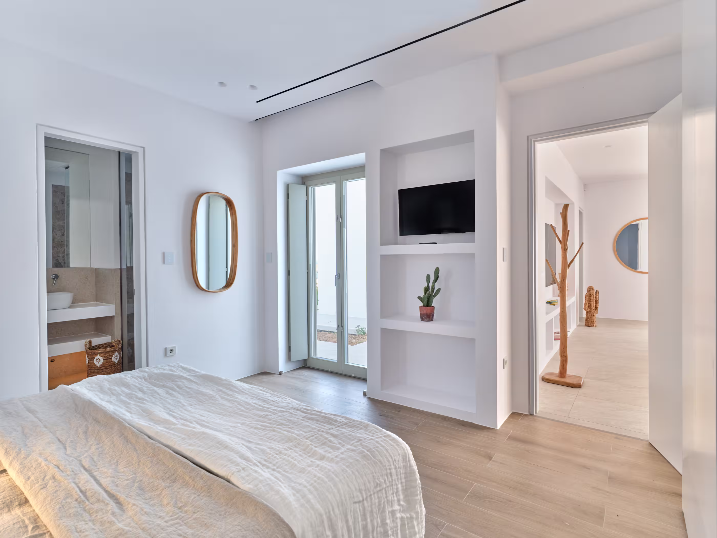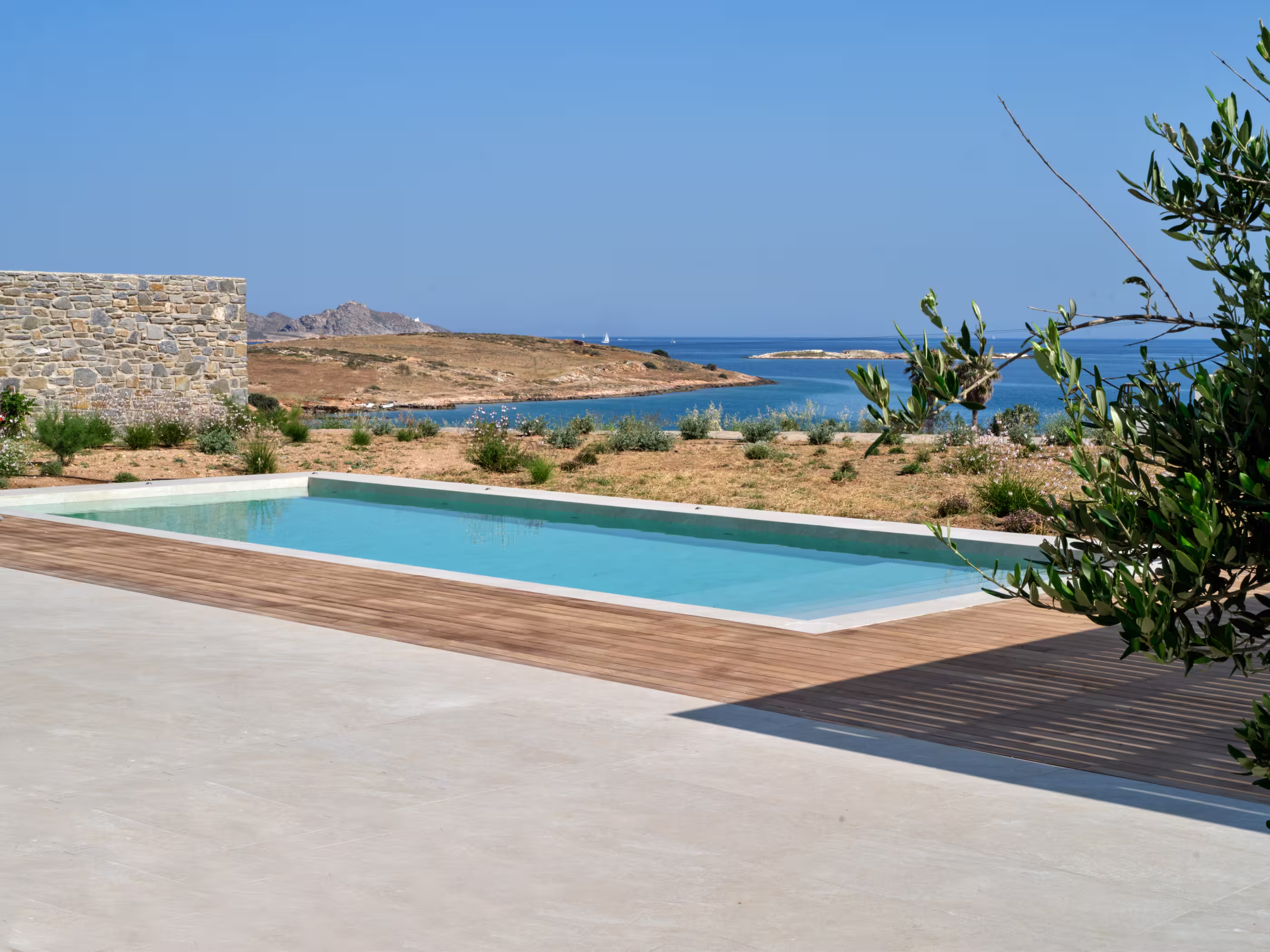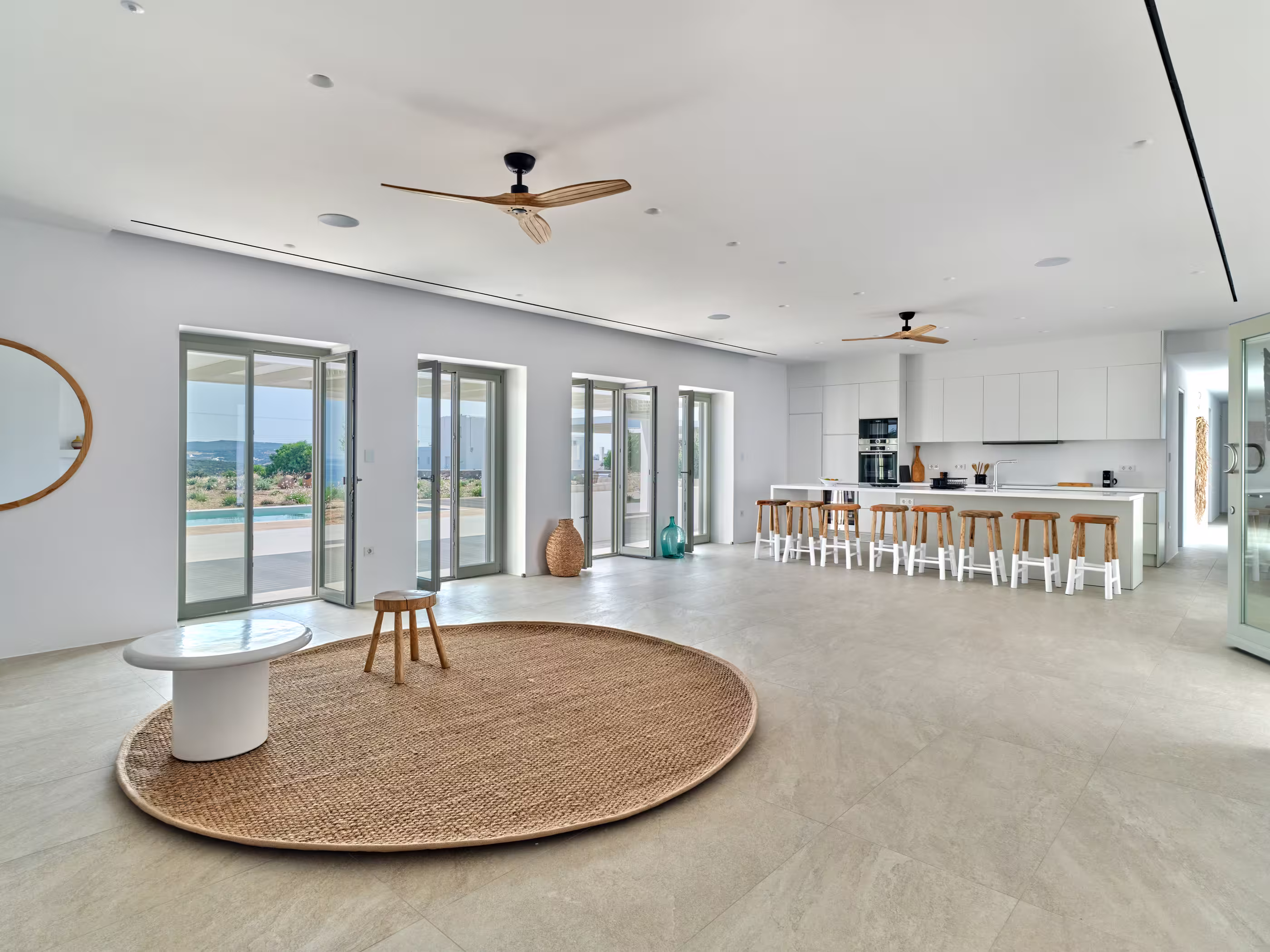 Villa Myra is a newly built hideaway in peaceful Xifara, just minutes from lively Naousa. Designed for relaxed holiday living, the villa features five double bedrooms with private bathrooms, a welcoming open-plan living area, and a fully equipped kitchen opening onto the terrace. Large windows allow natural light to flow indoors, creating a calm setting for groups seeking comfort and privacy. Outside, a private swimming pool, shaded dining space, sun loungers, and a stylish bar corner provide plenty of room for unwinding throughout the day. Air conditioning, Smart TVs, WiFi, laundry facilities, and daily housekeeping ensure a smooth, carefree stay. Nearby beaches, coastal paths, and Naousa’s dining scene are all easy to reach. Making your time here effortlessly enjoyable throughout.