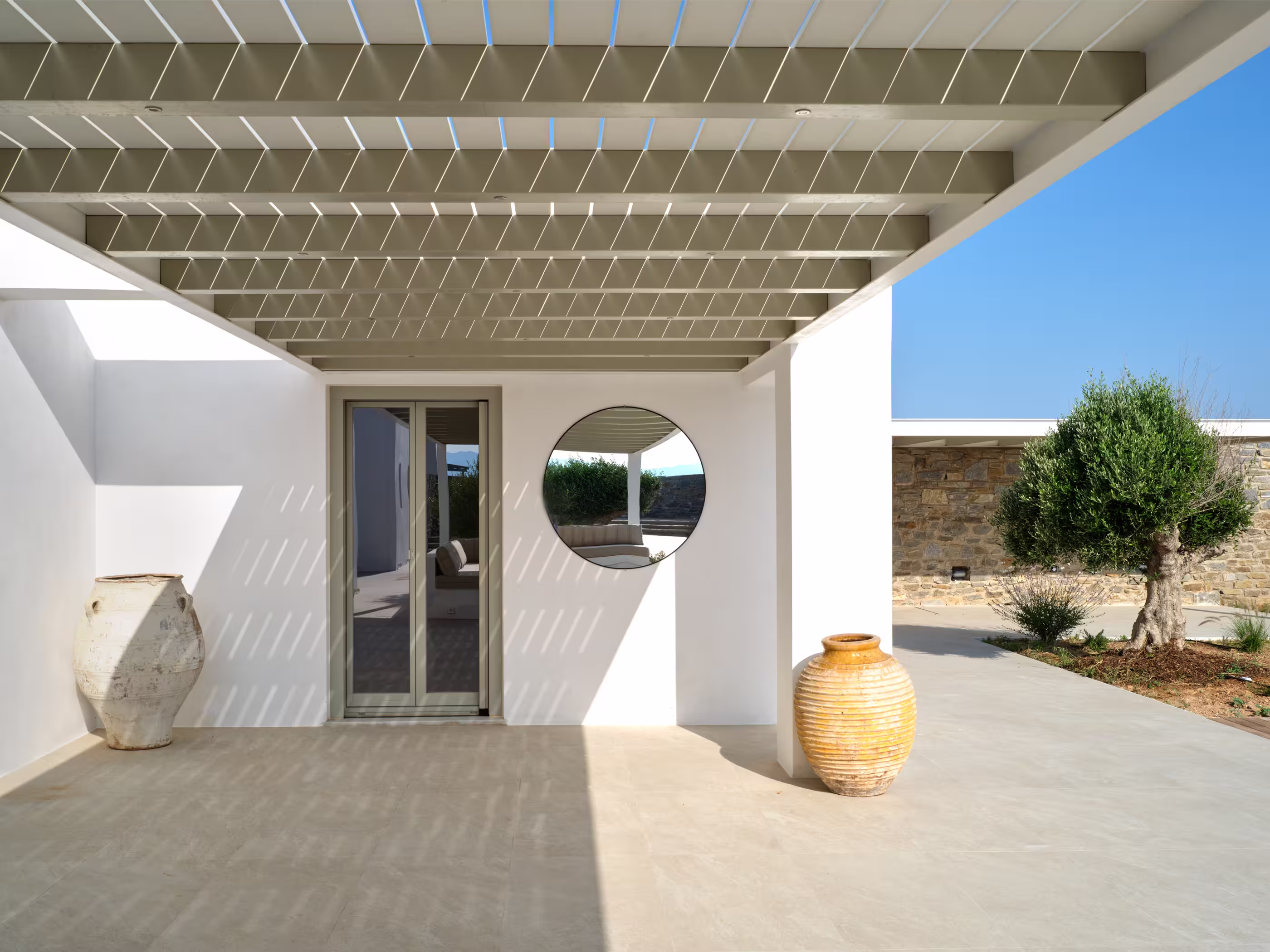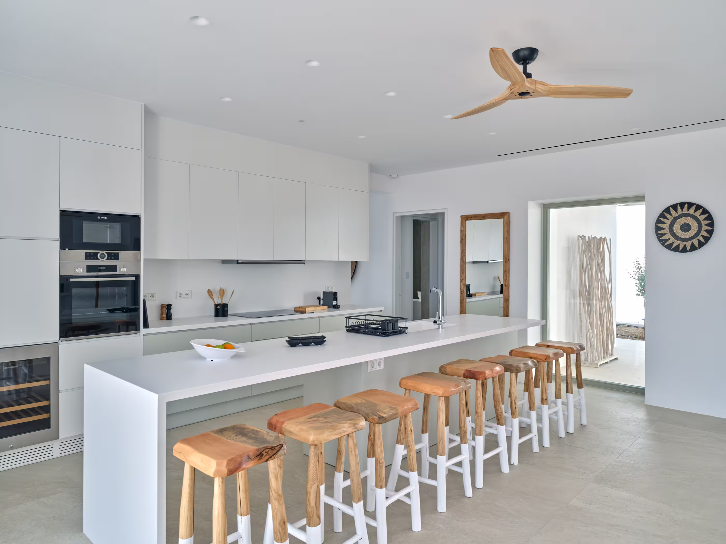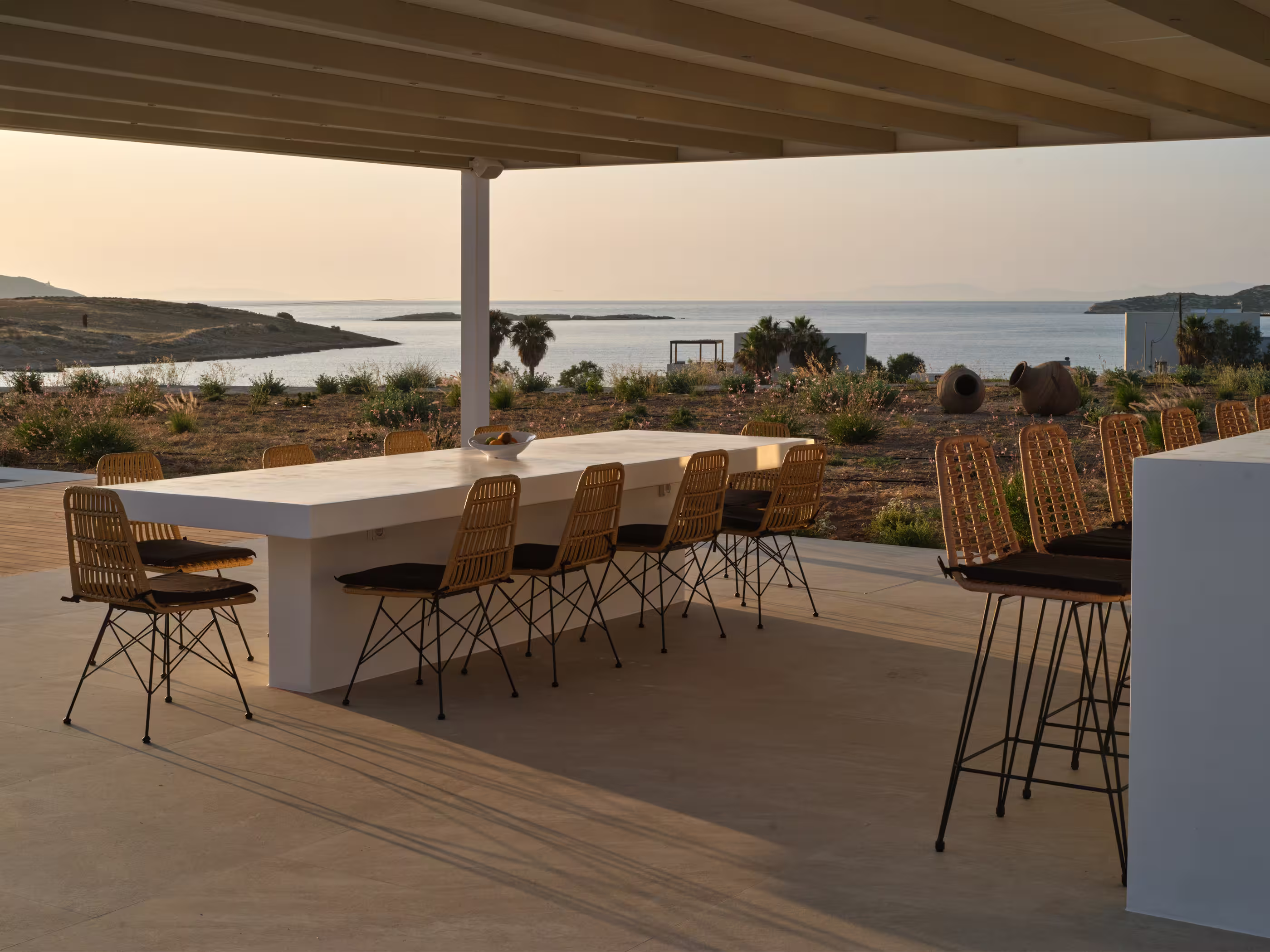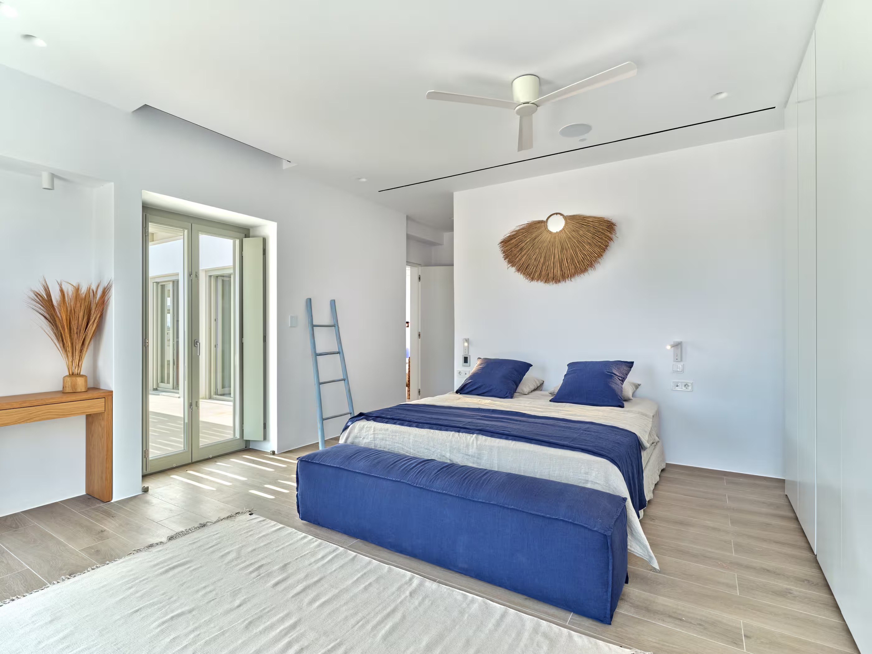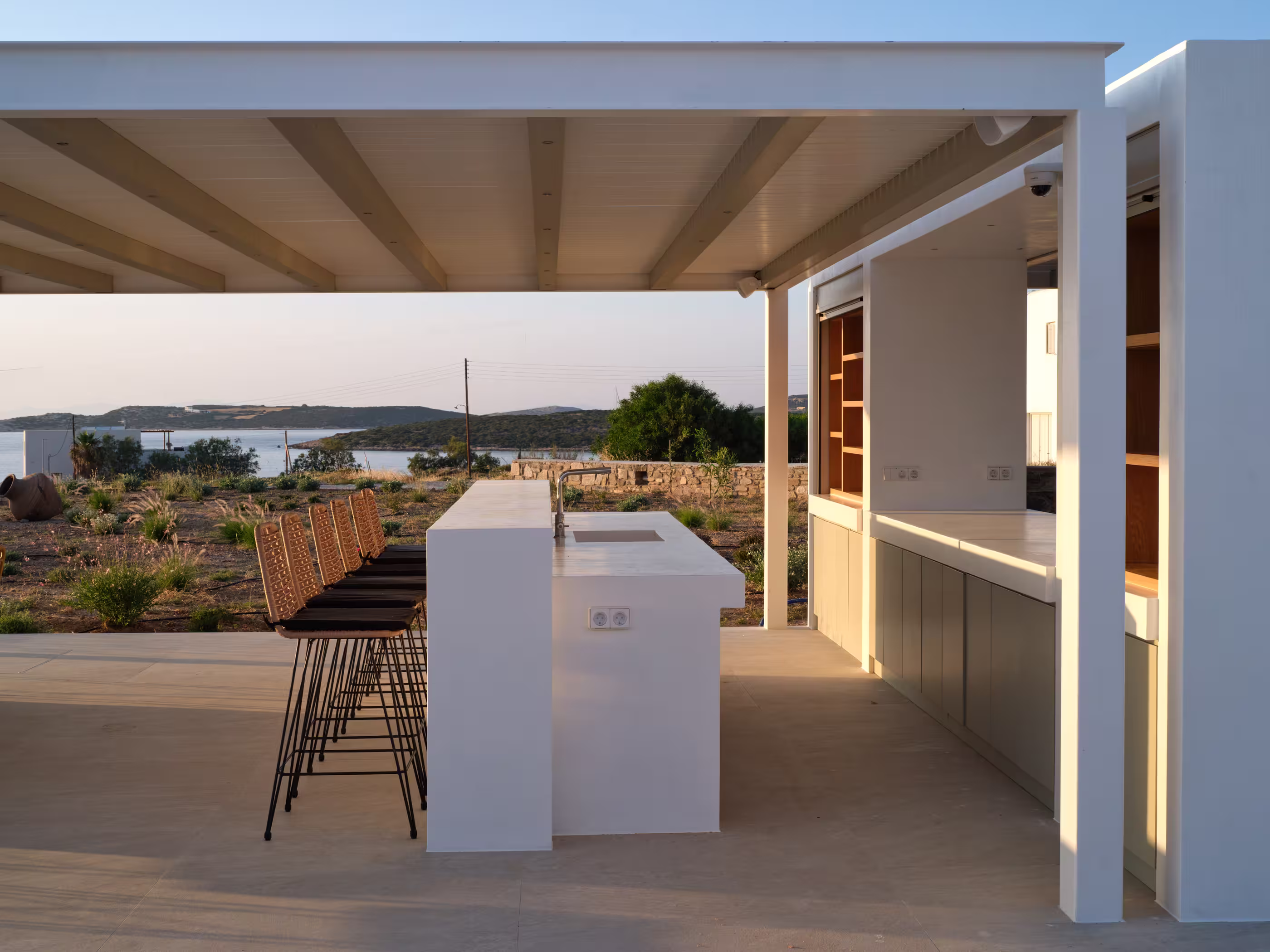Villa Myra is a newly built hideaway in peaceful Xifara, just minutes from lively Naousa. Designed for relaxed holiday living, the villa features five double bedrooms with private bathrooms, a welcoming open-plan living area, and a fully equipped kitchen opening onto the terrace. Large windows allow natural light to flow indoors, creating a calm setting for groups seeking comfort and privacy. Outside, a private swimming pool, shaded dining space, sun loungers, and a stylish bar corner provide plenty of room for unwinding throughout the day. Air conditioning, Smart TVs, WiFi, laundry facilities, and daily housekeeping ensure a smooth, carefree stay. Nearby beaches, coastal paths, and Naousa’s dining scene are all easy to reach. Making your time here effortlessly enjoyable throughout.