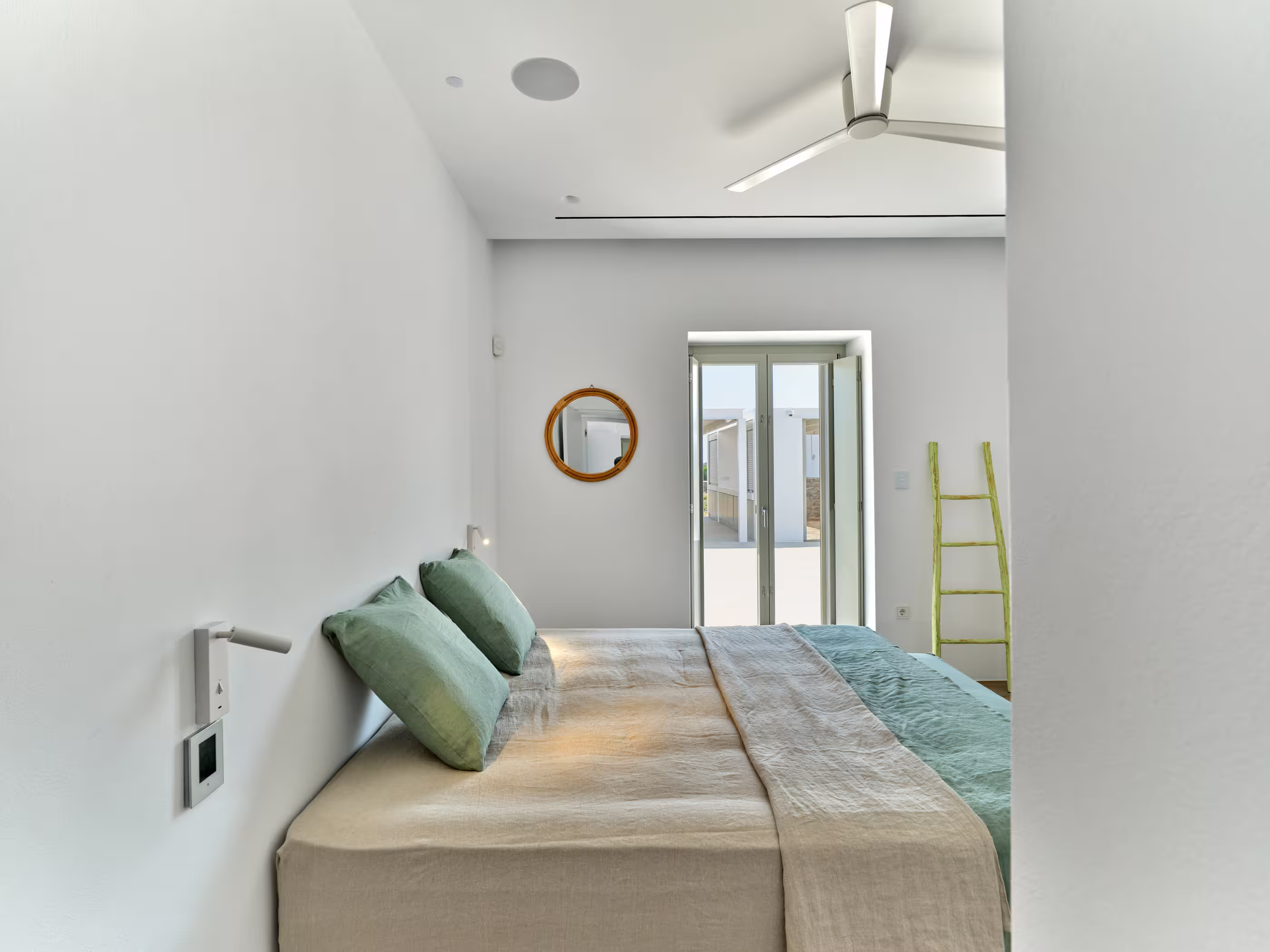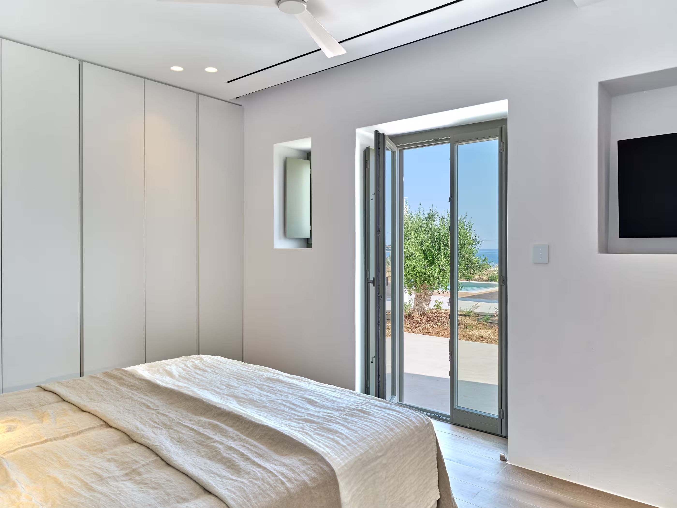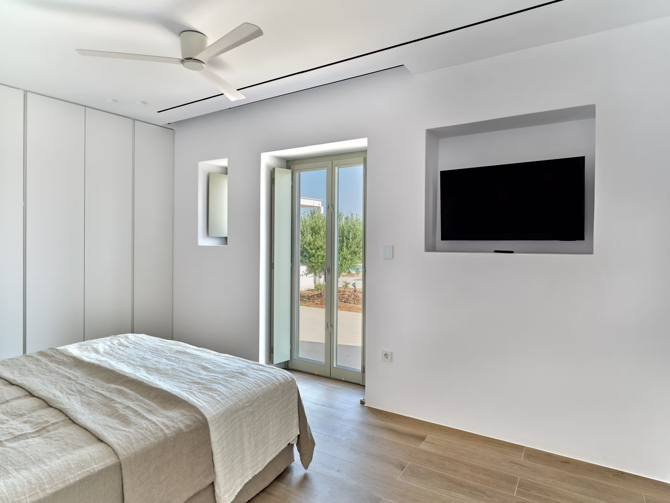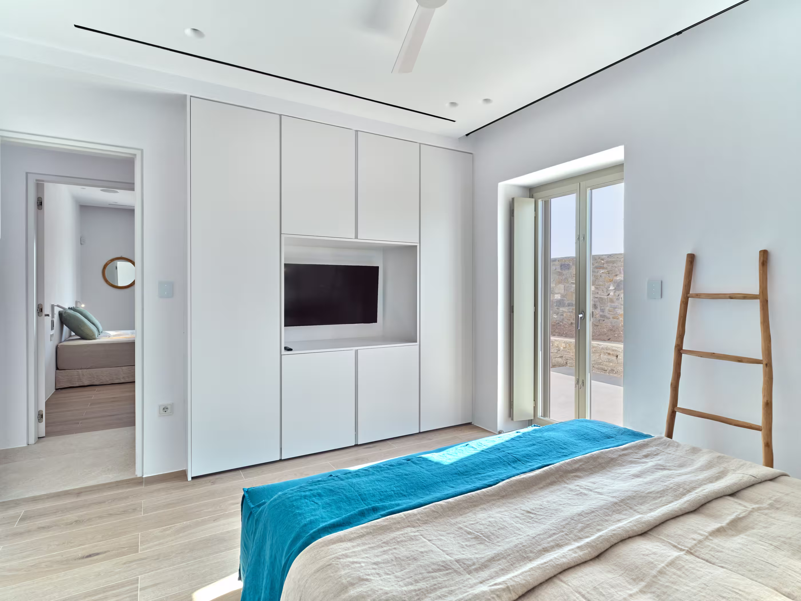 Villa Myra is a newly built hideaway in peaceful Xifara, just minutes from lively Naousa. Designed for relaxed holiday living, the villa features five double bedrooms with private bathrooms, a welcoming open-plan living area, and a fully equipped kitchen opening onto the terrace. Large windows allow natural light to flow indoors, creating a calm setting for groups seeking comfort and privacy. Outside, a private swimming pool, shaded dining space, sun loungers, and a stylish bar corner provide plenty of room for unwinding throughout the day. Air conditioning, Smart TVs, WiFi, laundry facilities, and daily housekeeping ensure a smooth, carefree stay. Nearby beaches, coastal paths, and Naousa’s dining scene are all easy to reach. Making your time here effortlessly enjoyable throughout.