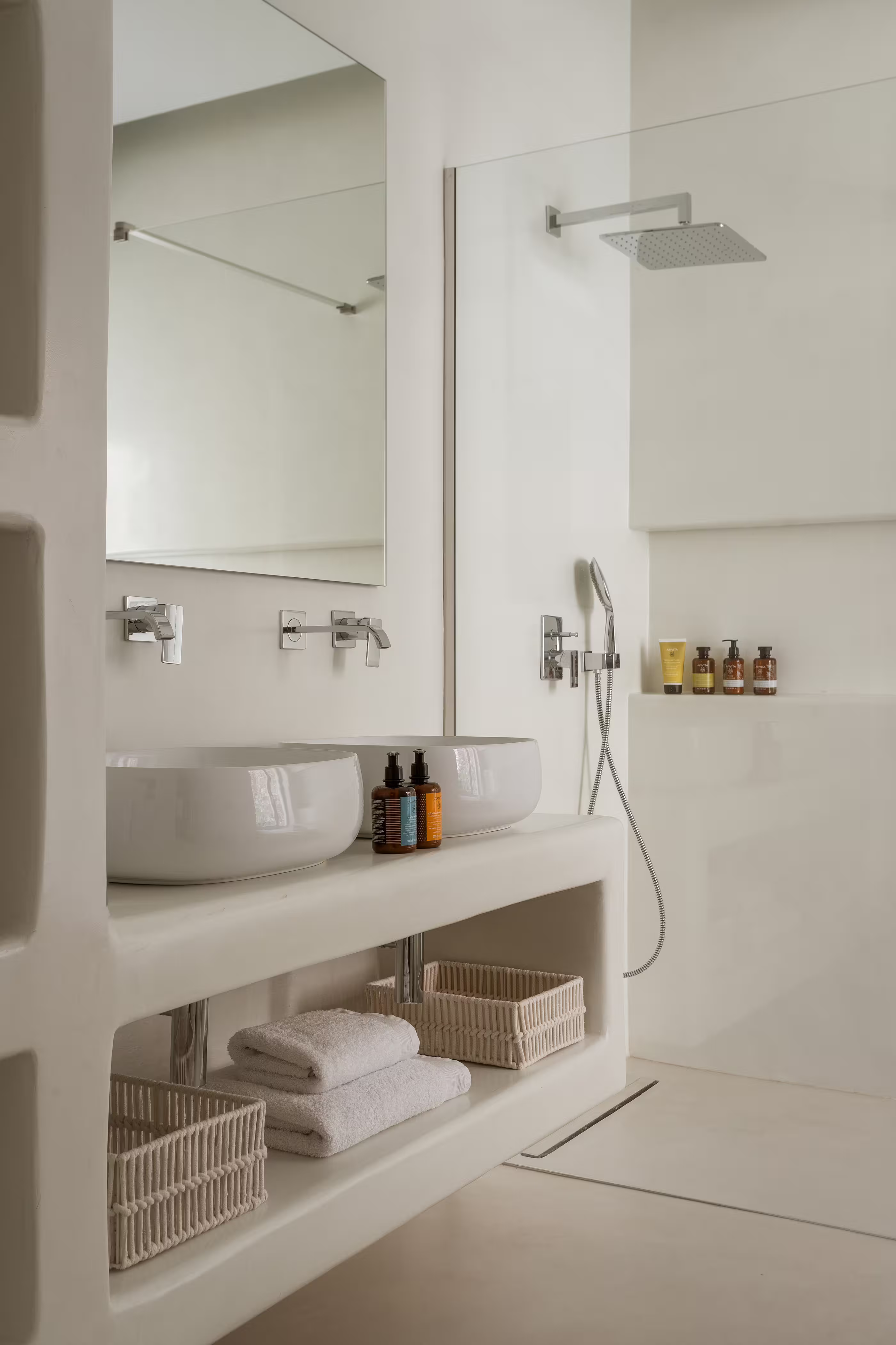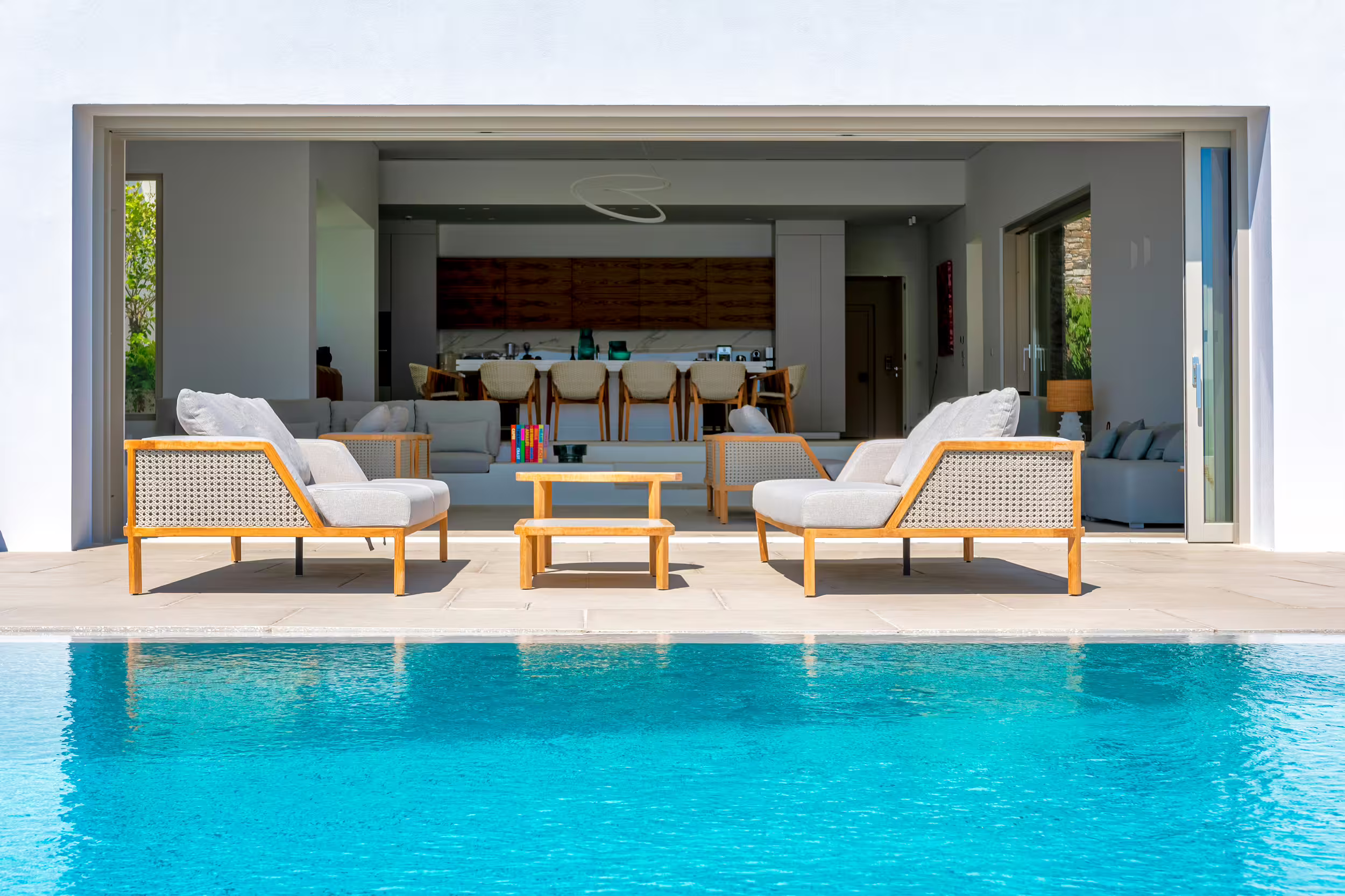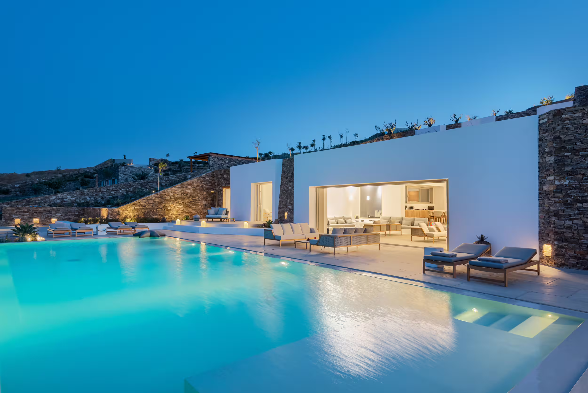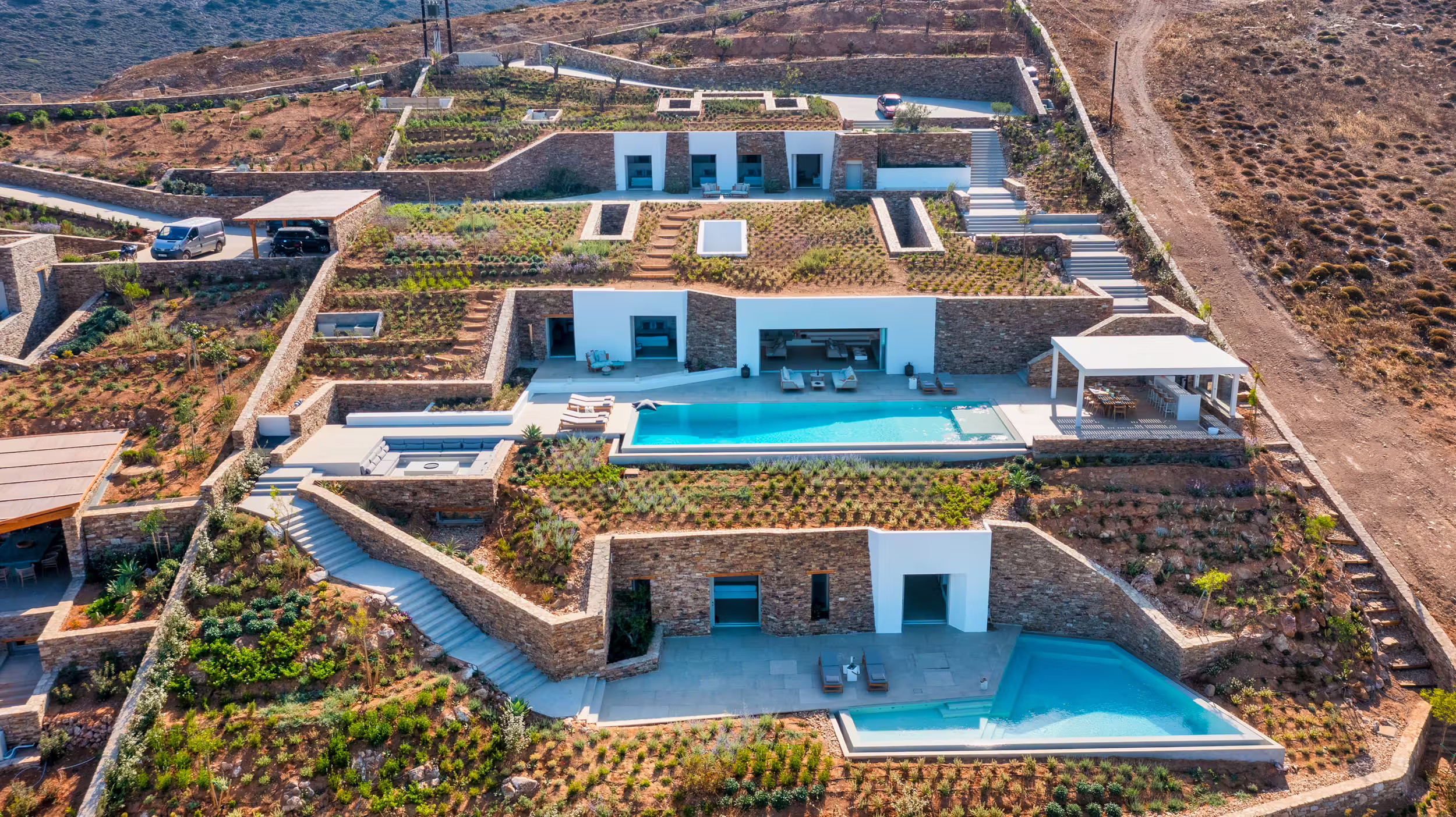Villa Nacre is a hillside cave house above Antiparos, built across three levels with green roofs. Its design blends into the natural landscape using local stone and Cycladic-style white volumes.