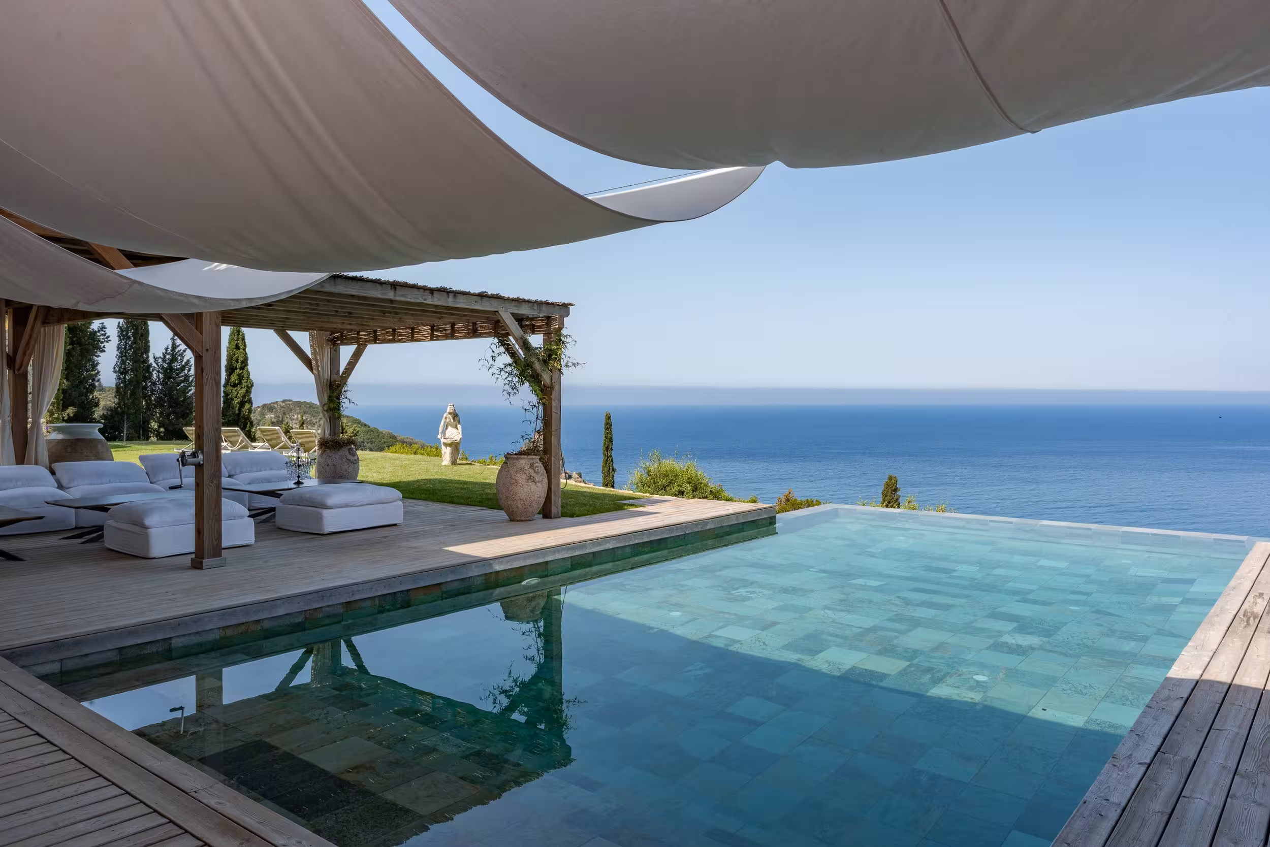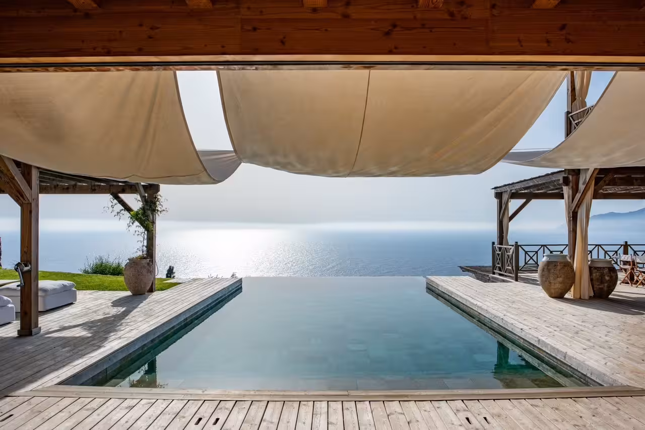 Designed for comfort, privacy, luxurious relaxation, and wellness, the estate is fully staffed and connected by golf buggies. From the pools and terraces, a superb vista of uninterrupted sea views and sunsets extends along the west coast and over Ortholithi Rock to the south.