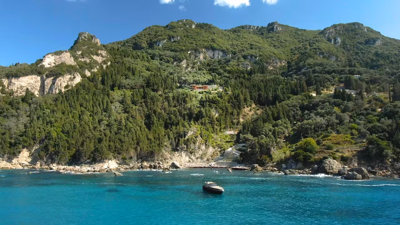 Seafront, olive trees, and Corfu coast.