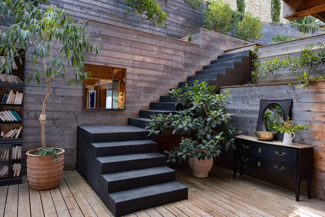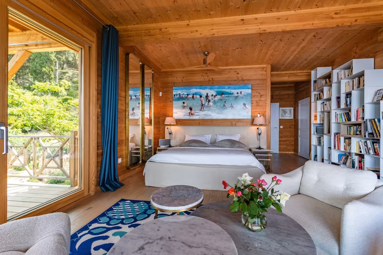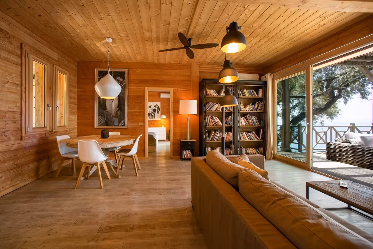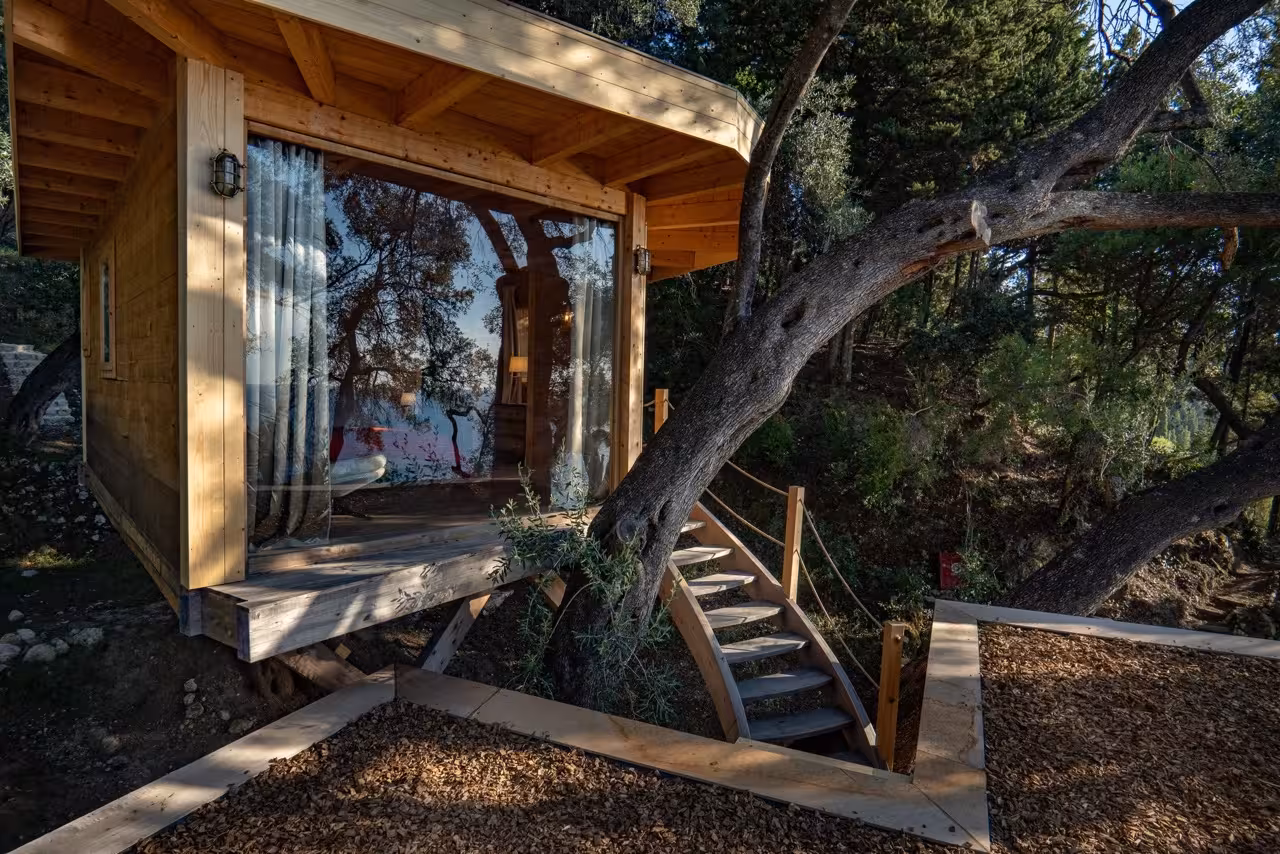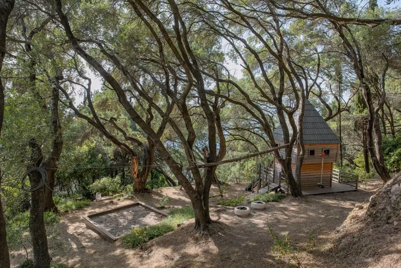 Cocooned in tall pine trees, a short walk from the Nissaki Estate is a striking wooden treehouse. Crafted around the trees, with wide decked terraces and floor-to-ceiling glass doors, it’s the perfect setting for a small family or teenagers.