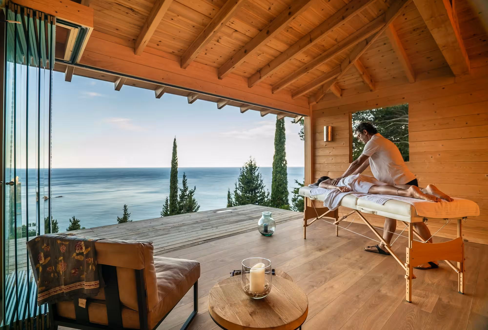 The Beach House, accessible by golf buggy, sits just above the beach and sea deck. Completely self-contained with a kitchen and living room, it’s the perfect place to relax and spend the day by the sea. The bedroom can be used for the week on special request or couples can enjoy a romantic night away from the group, falling asleep to the sounds of the sea.