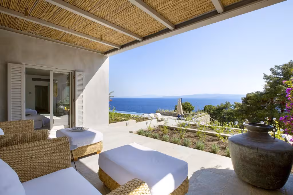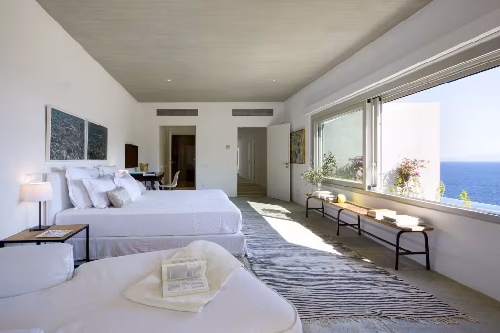 This seafront two-floor villa in Skiathos rests on the south of the island, overlooking the infinite blue. You’ll love this private luxury villa for its positive energy, unique architecture, photography collection, outdoor spaces, natural light, lush forest, and unspoiled beach. The sunsets, the sound of the sea, the herb garden, Mediterranean cuisine, and sailing opportunities around the island make this retreat a truly unforgettable experience.