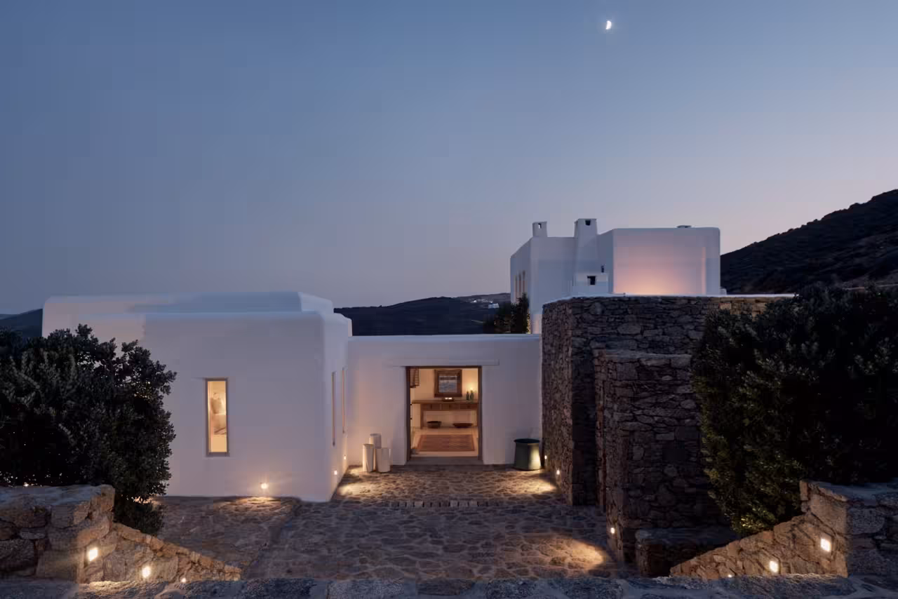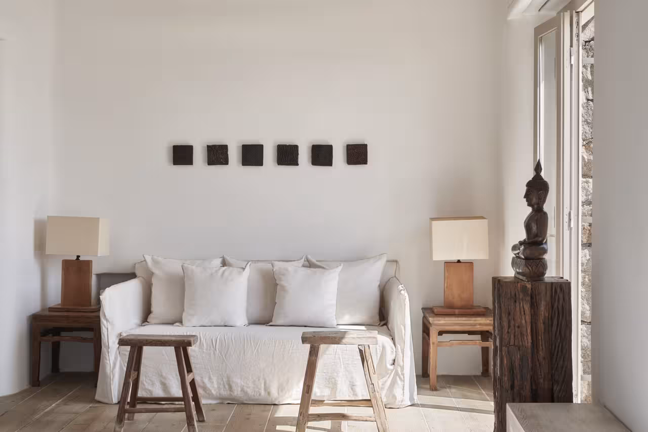This whitewashed villa features an infinity pool, clear views of the sea, and a peaceful disposition. All bedrooms have sea views, French doors to terraces, and ceiling fans. The décor is calm, breezy, and natural, with none of the excesses that can afflict so many Mykonos homes. The pool is freshwater and can be heated on request during the off-season.