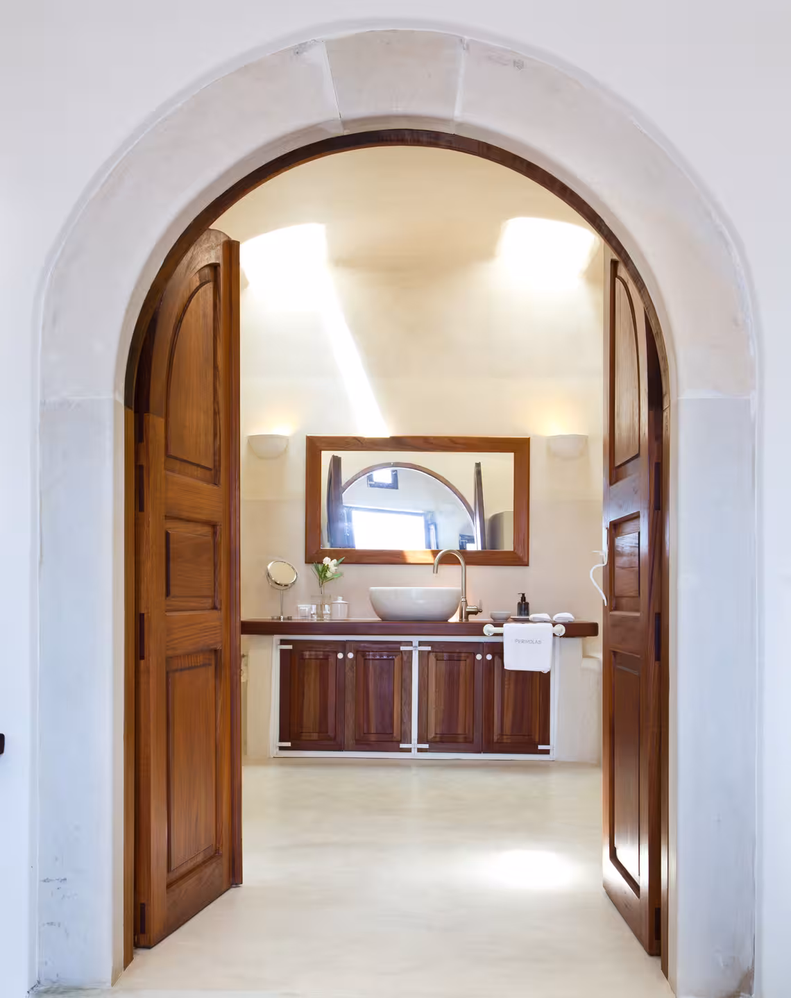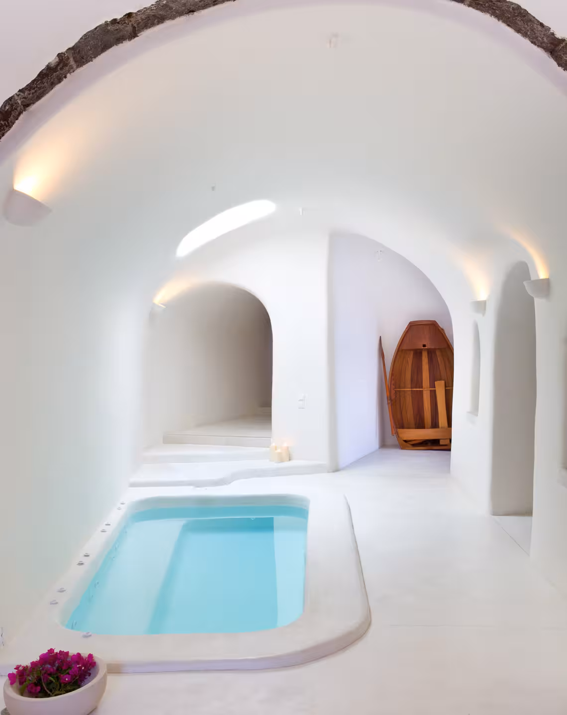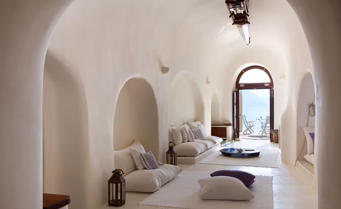 Perivolas Hideaway is a unique property in an idyllic, quiet location, offering superb quality and comfort. With white interiors, rounded archways, minimalist furnishings, and occasional dashes of color, it is intimate, private, and architecturally designed for aesthetic living, entertaining, and relaxing.