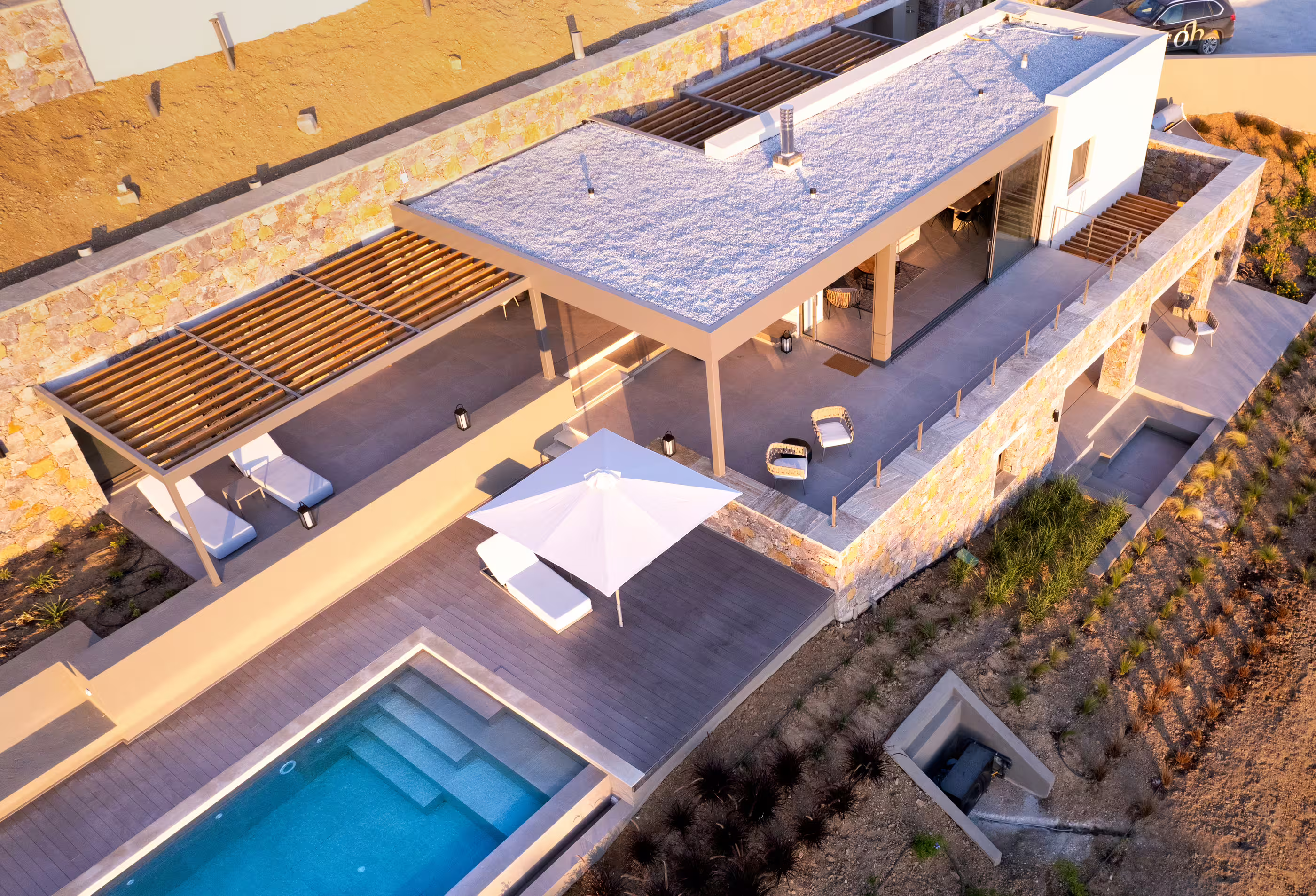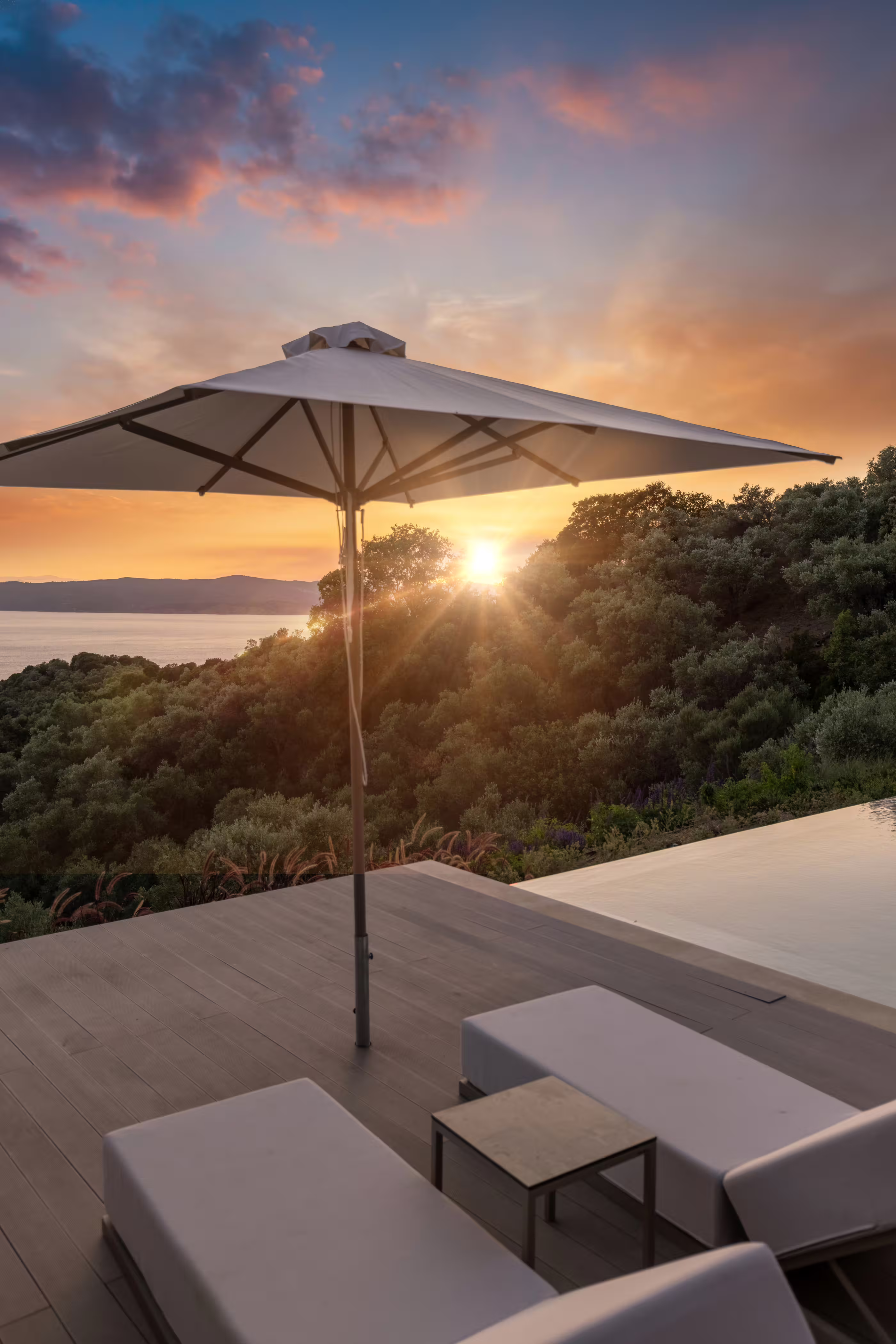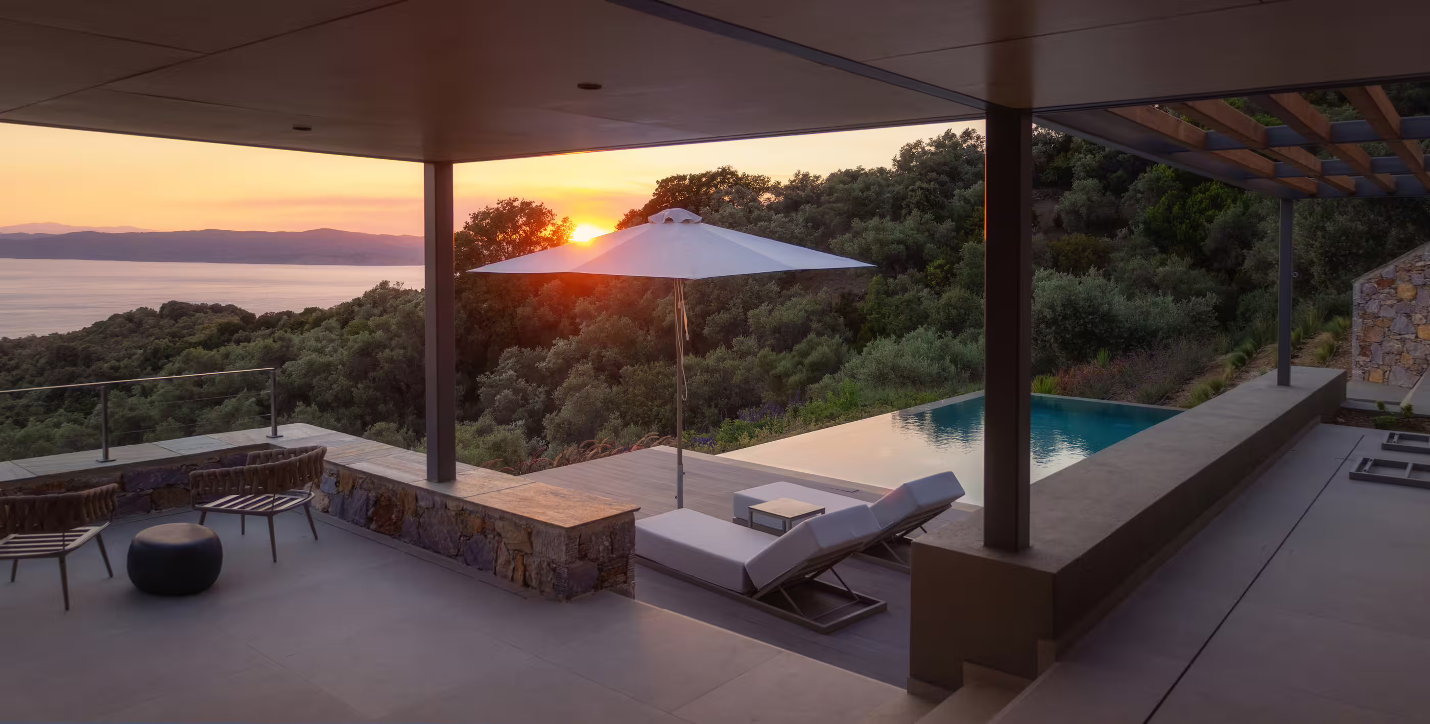 - Large private infinity pool (9 m × 3.85 m) with panoramic sea and sunset views