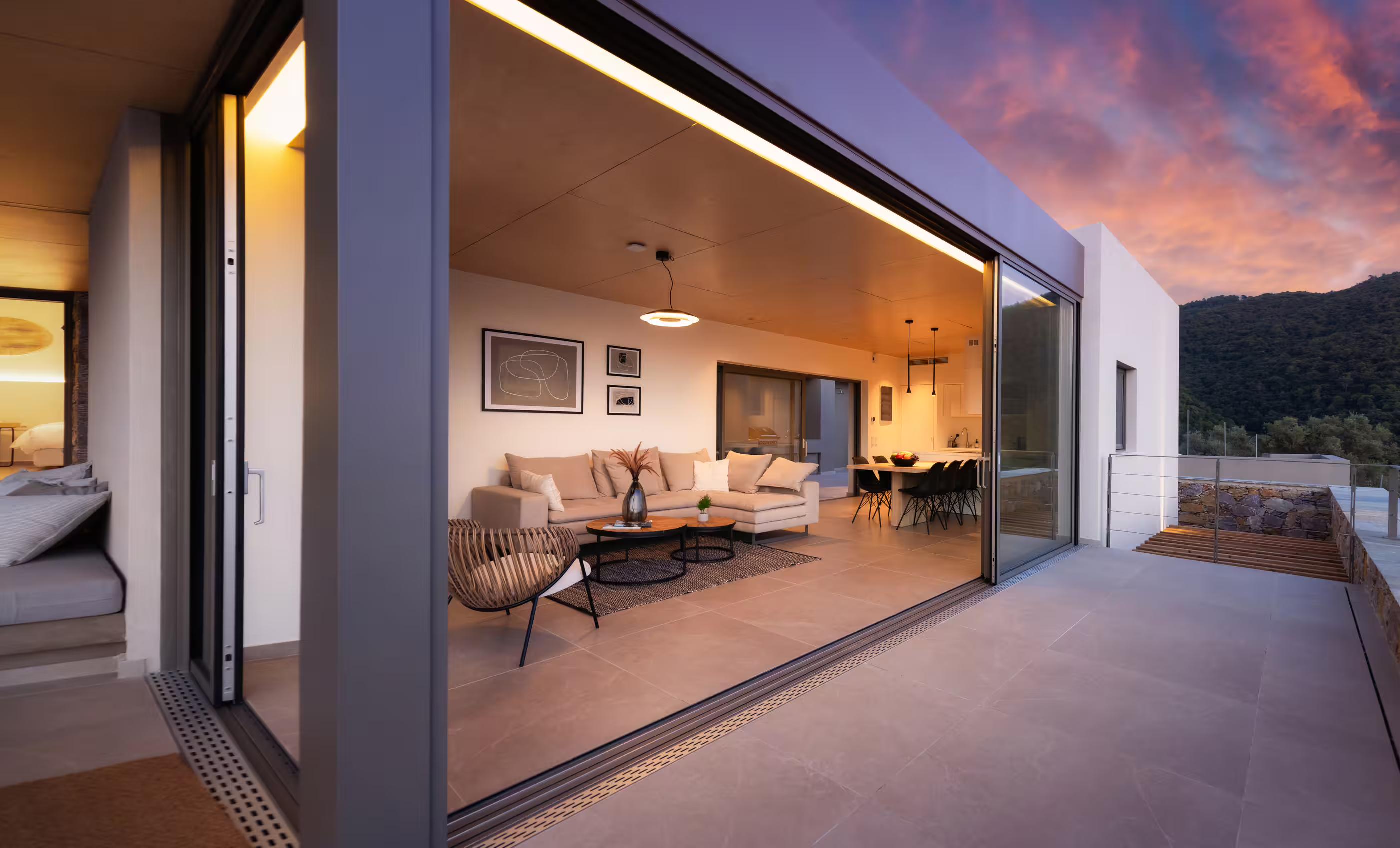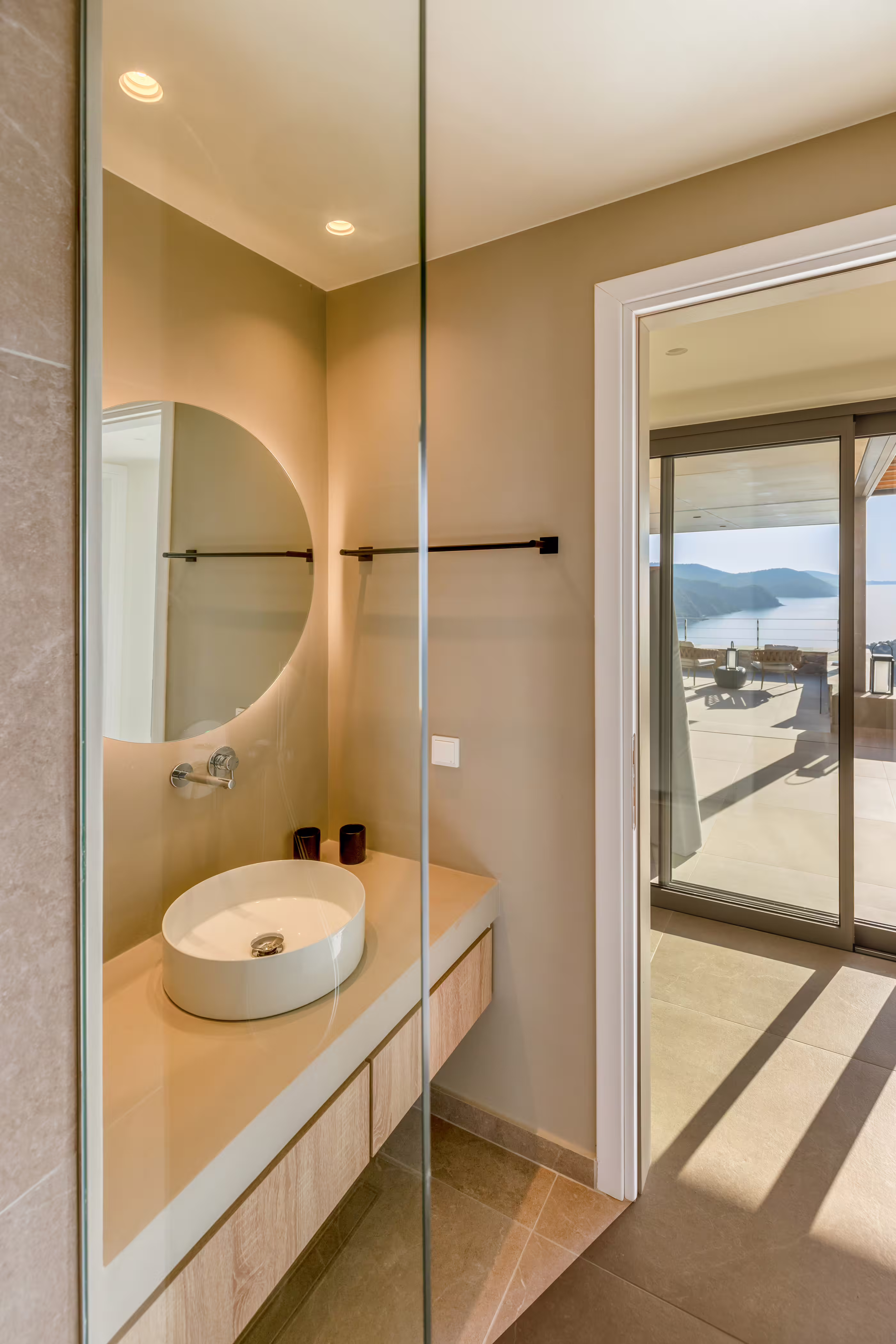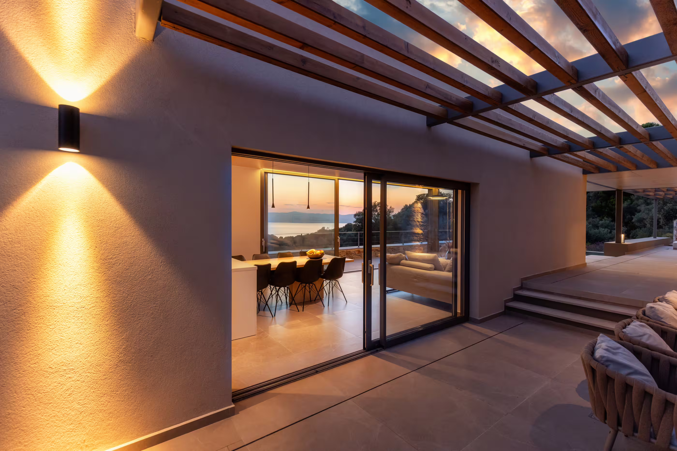 - Large private infinity pool (9 m × 3.85 m) with panoramic sea and sunset views