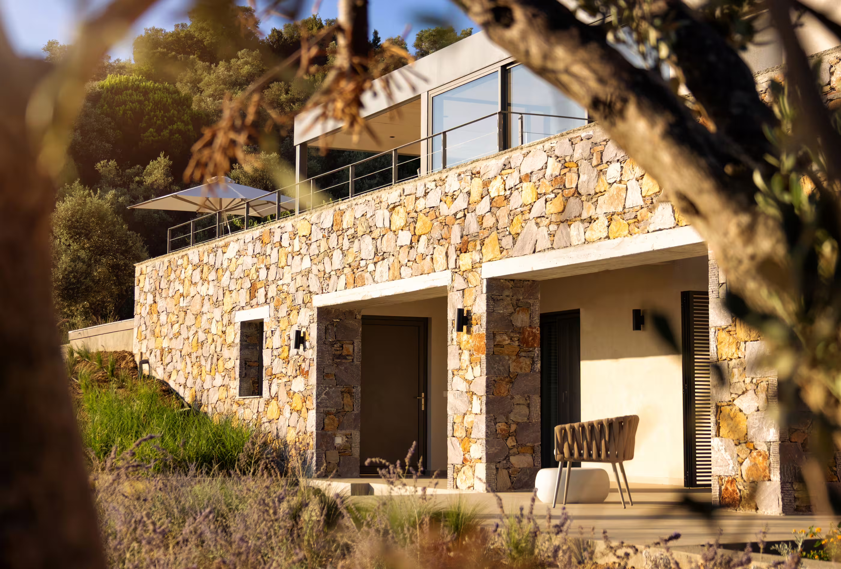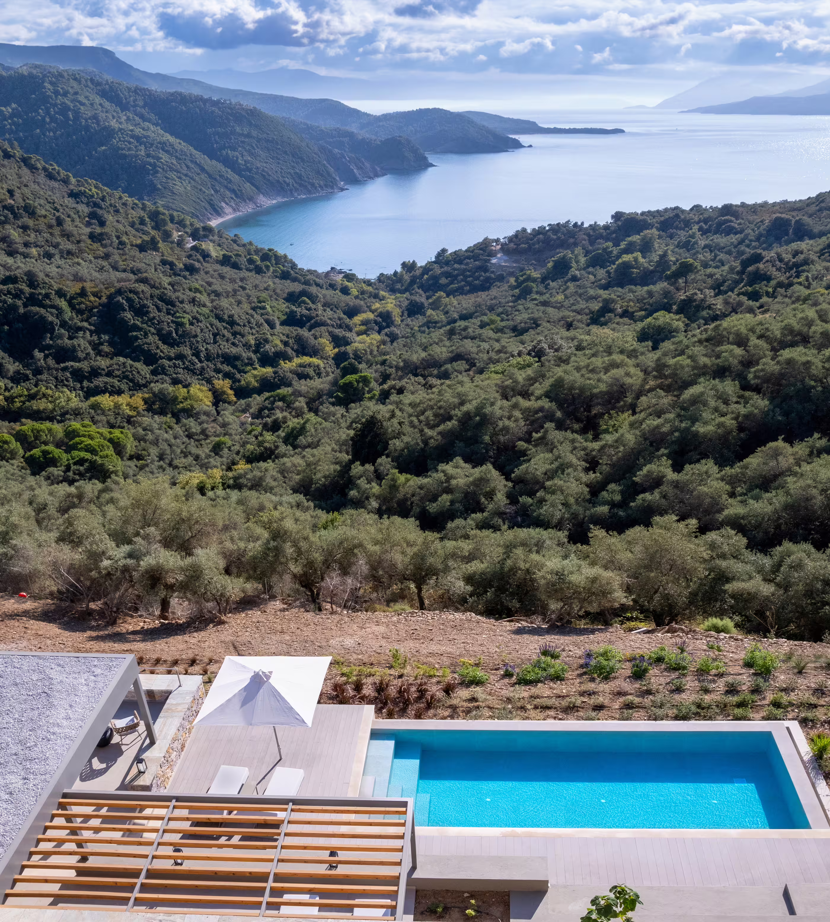 - Landscaped garden surrounded by olive trees and pines