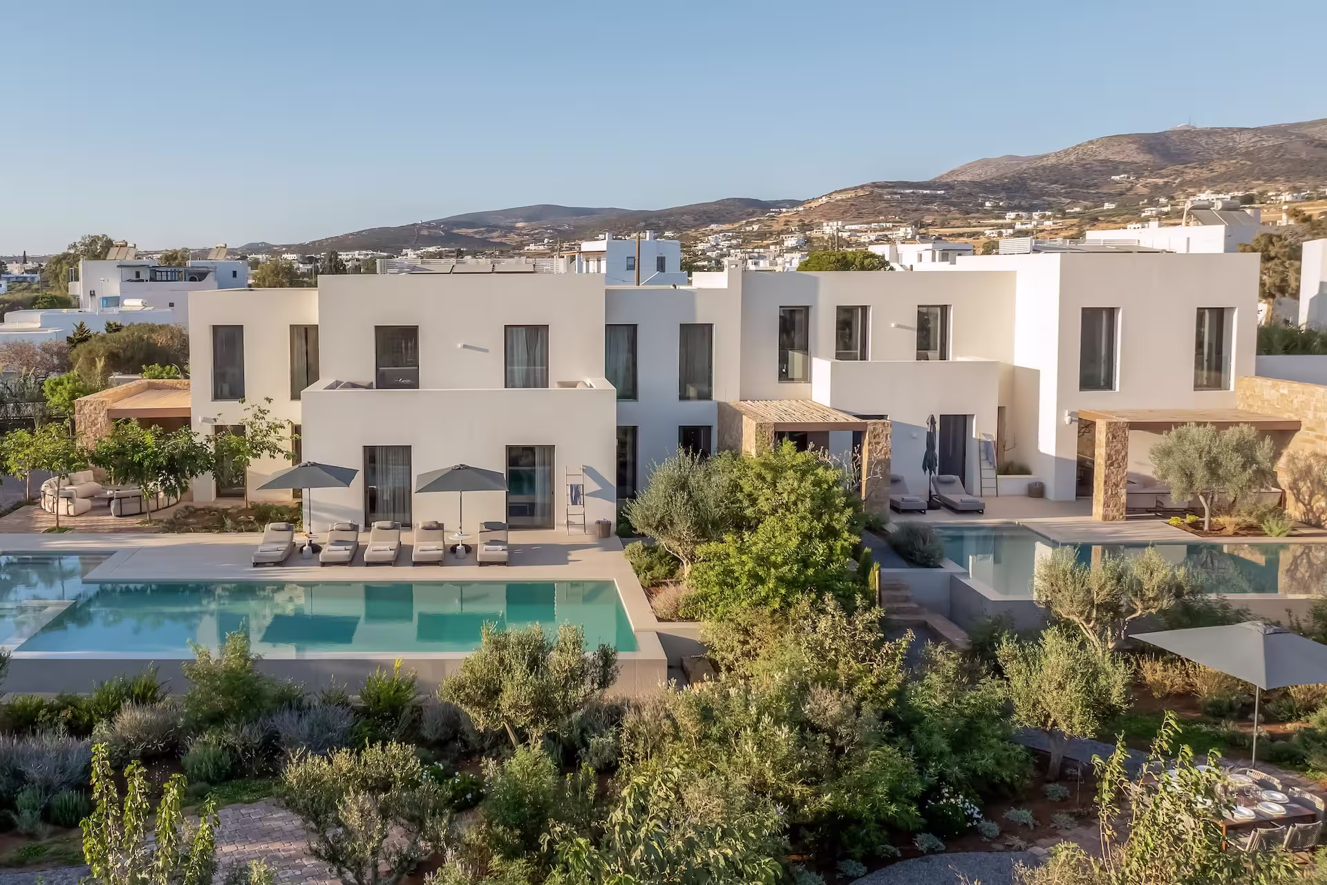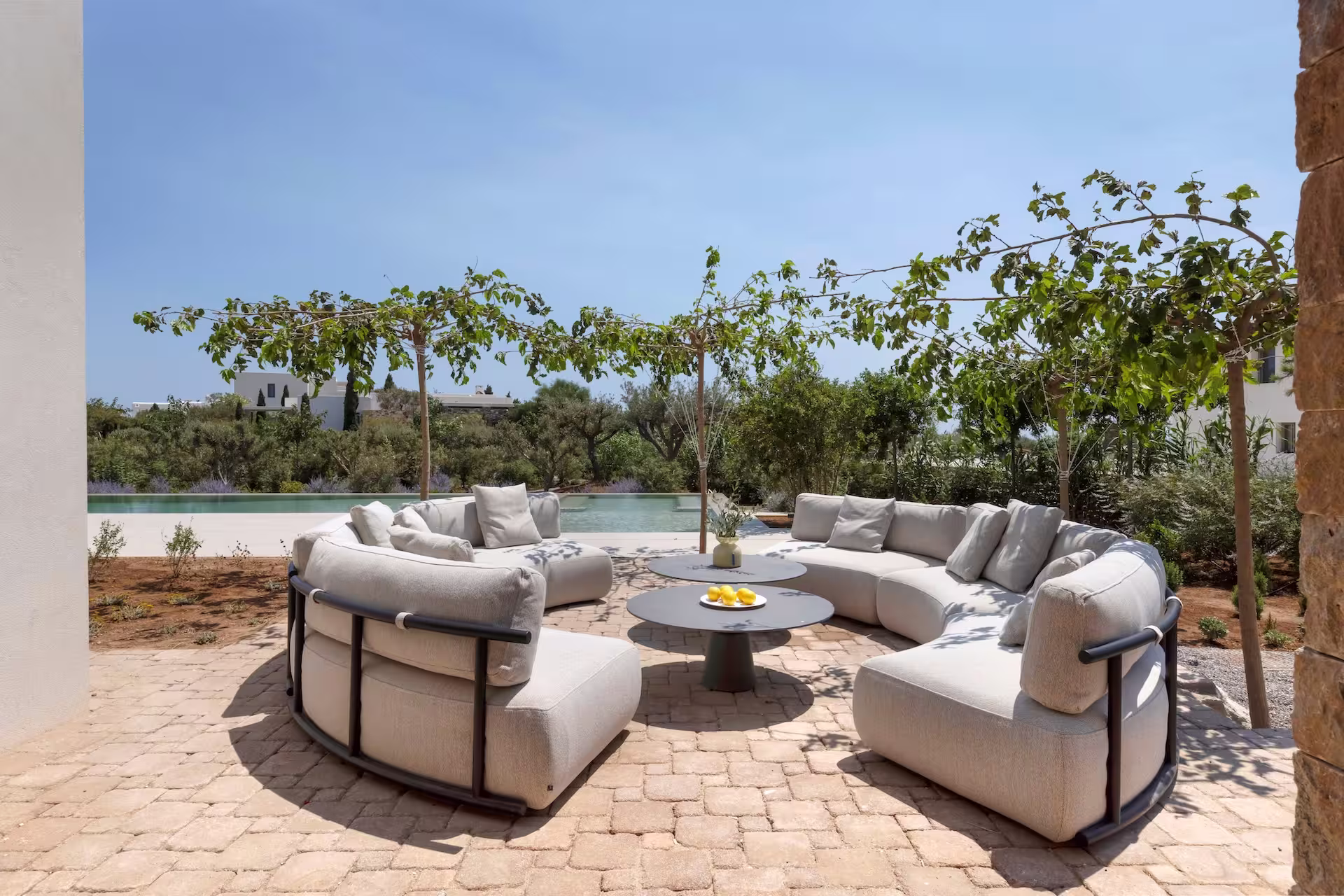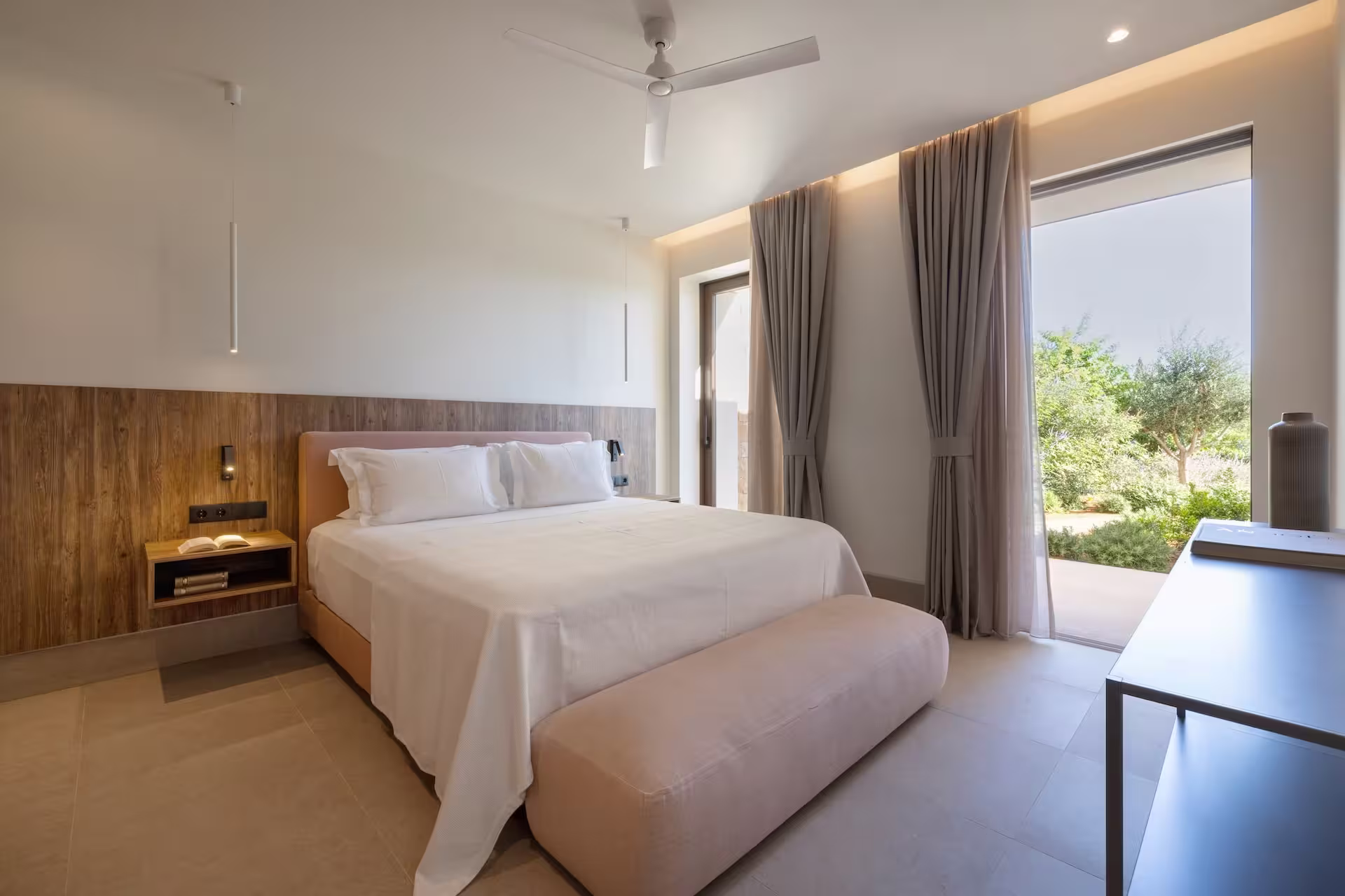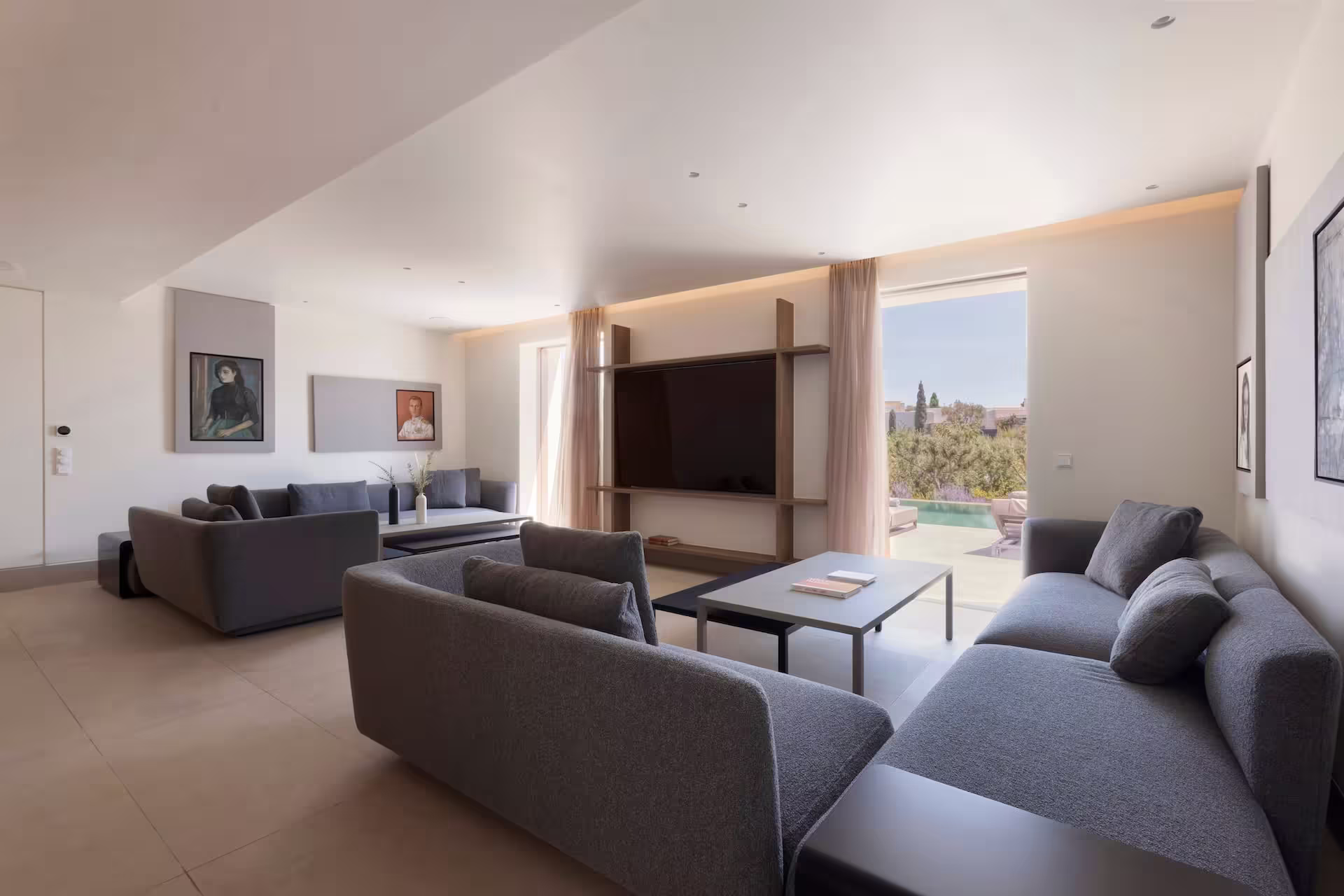 Villa Vela is the largest residence of its estate, offering generous interiors and refined architectural details within a beautifully landscaped private garden. With a large swimming pool featuring a jacuzzi and children’s section, the villa is designed for effortless relaxation and family enjoyment. A spacious central patio forms the heart of the home, creating a natural flow between indoor and outdoor living. The upper-level bedrooms open onto a balcony with calming sea views, while the recreation room provides a dedicated space for leisure. Wide openings fill the villa with natural light and maintain a constant connection to the surrounding greenery. Just moments from the pebble beach of Aliki, Villa Vela invites guests to swim from sunrise to moonlit evenings.