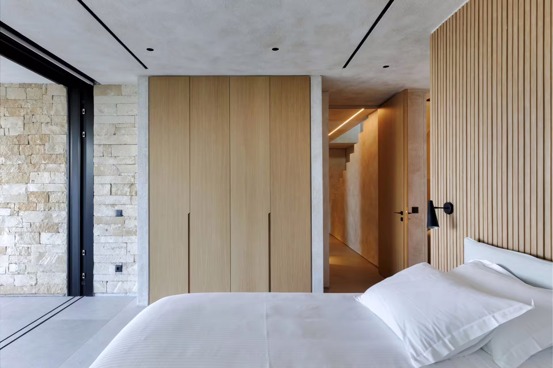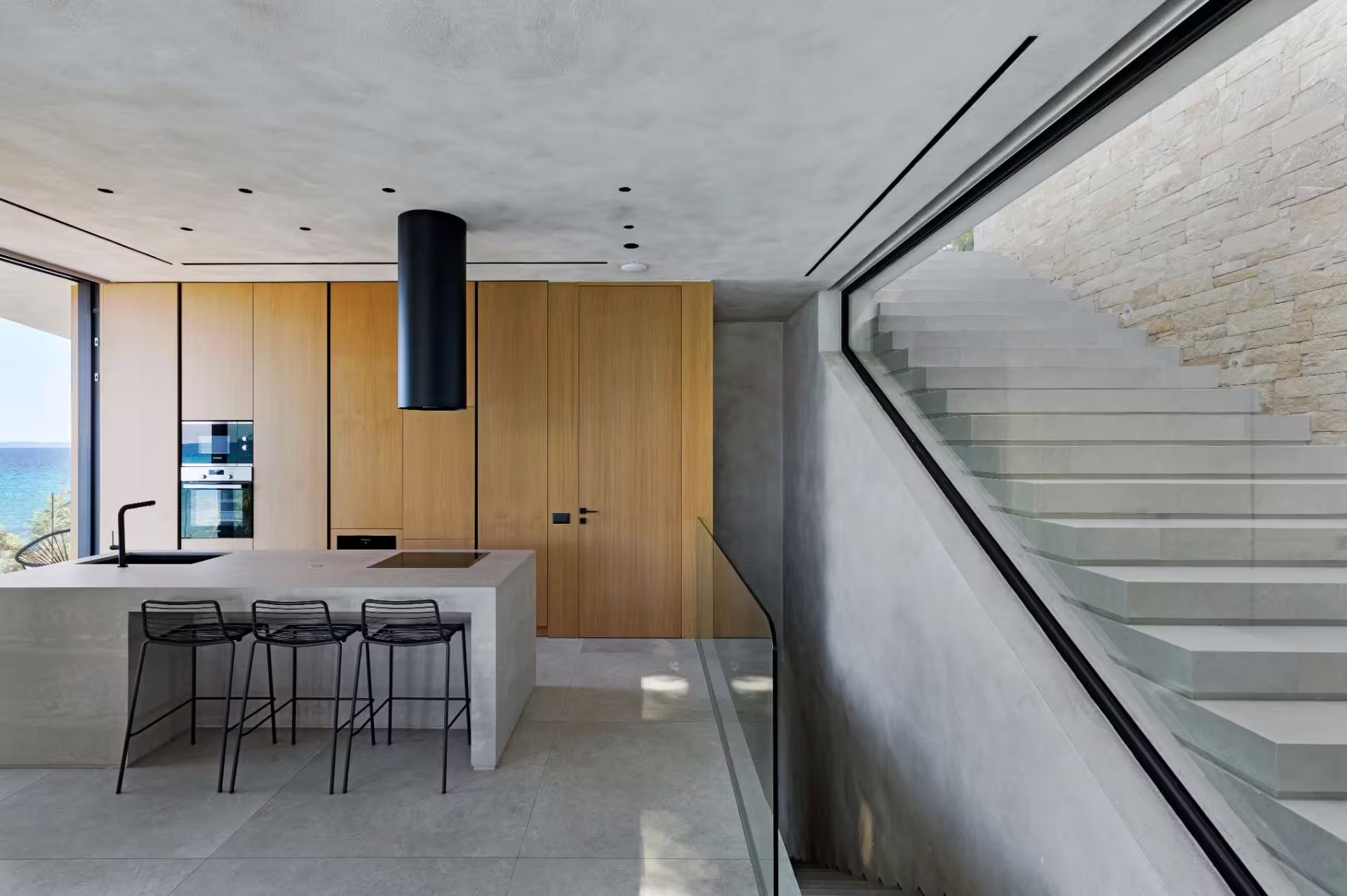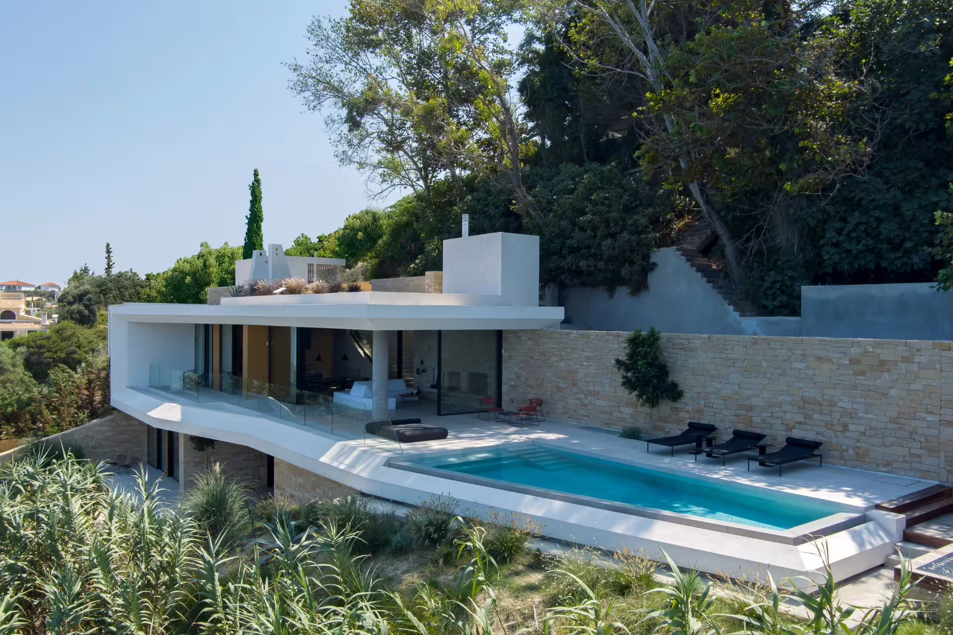 Villa Waterline II is a 210 m² waterfront retreat blending natural beauty with contemporary elegance. Designed for up to eight guests, it features four en-suite bedrooms and five bathrooms. The bright open-plan living area and fully equipped kitchen open onto sea-view terraces, creating seamless indoor-outdoor living. Three bedrooms on the ground level lead directly to the garden and private beach, while the master suite includes a jacuzzi. A fourth bedroom with balcony and sea view sits upstairs. Outside, a private pool, shaded dining area, and built-in BBQ offer the perfect setting for alfresco moments overlooking the endless Aegean horizon.