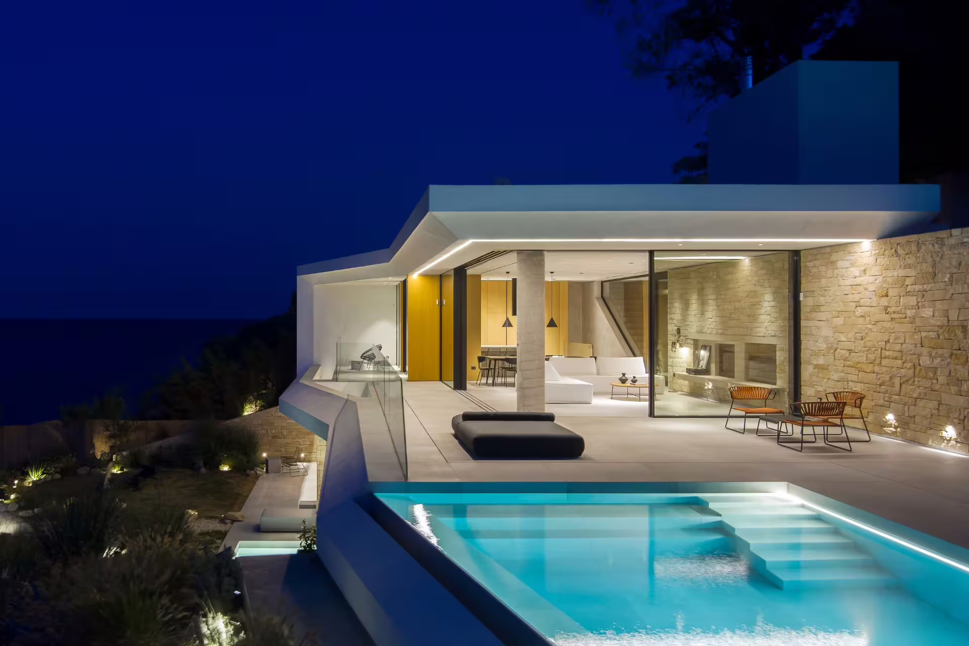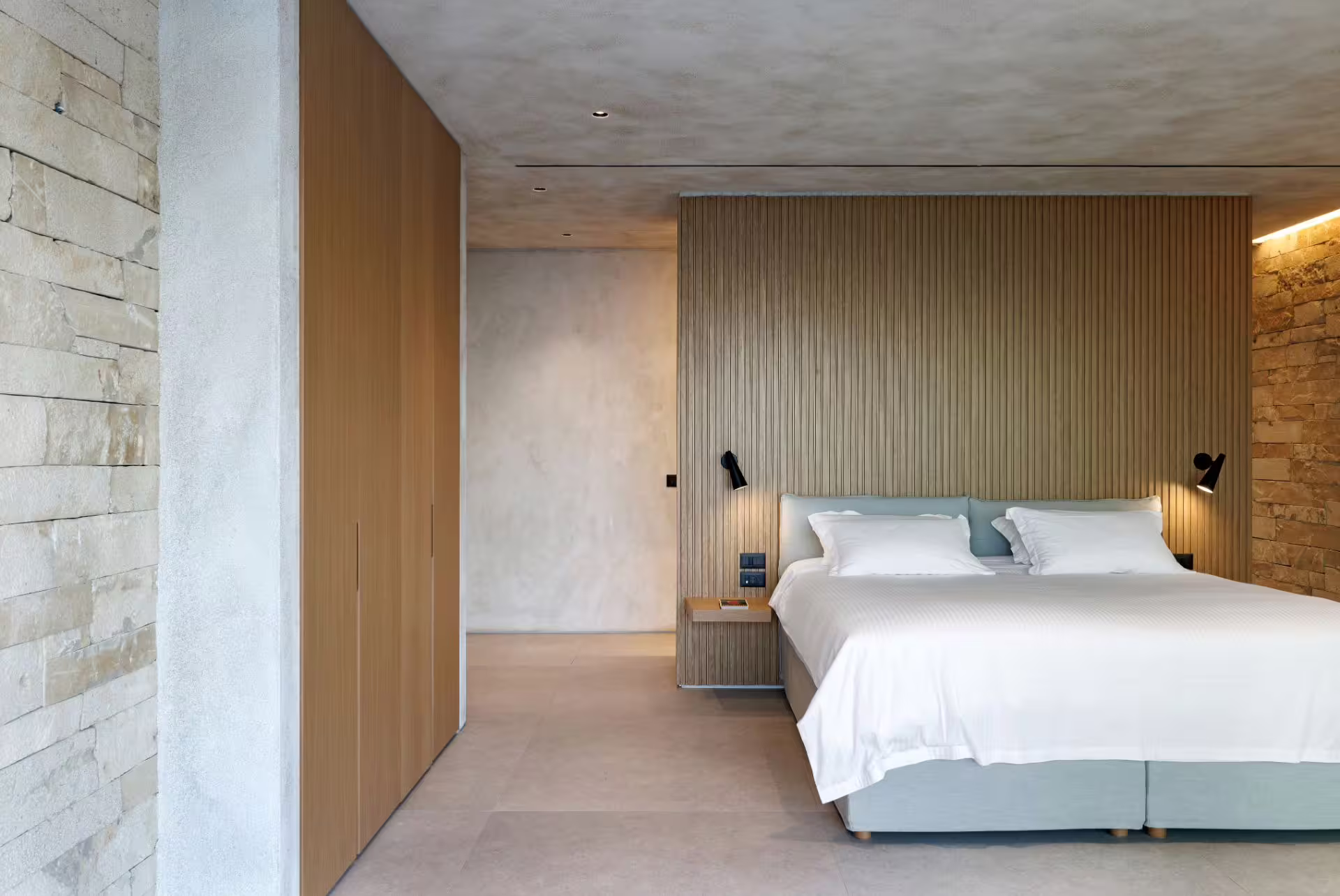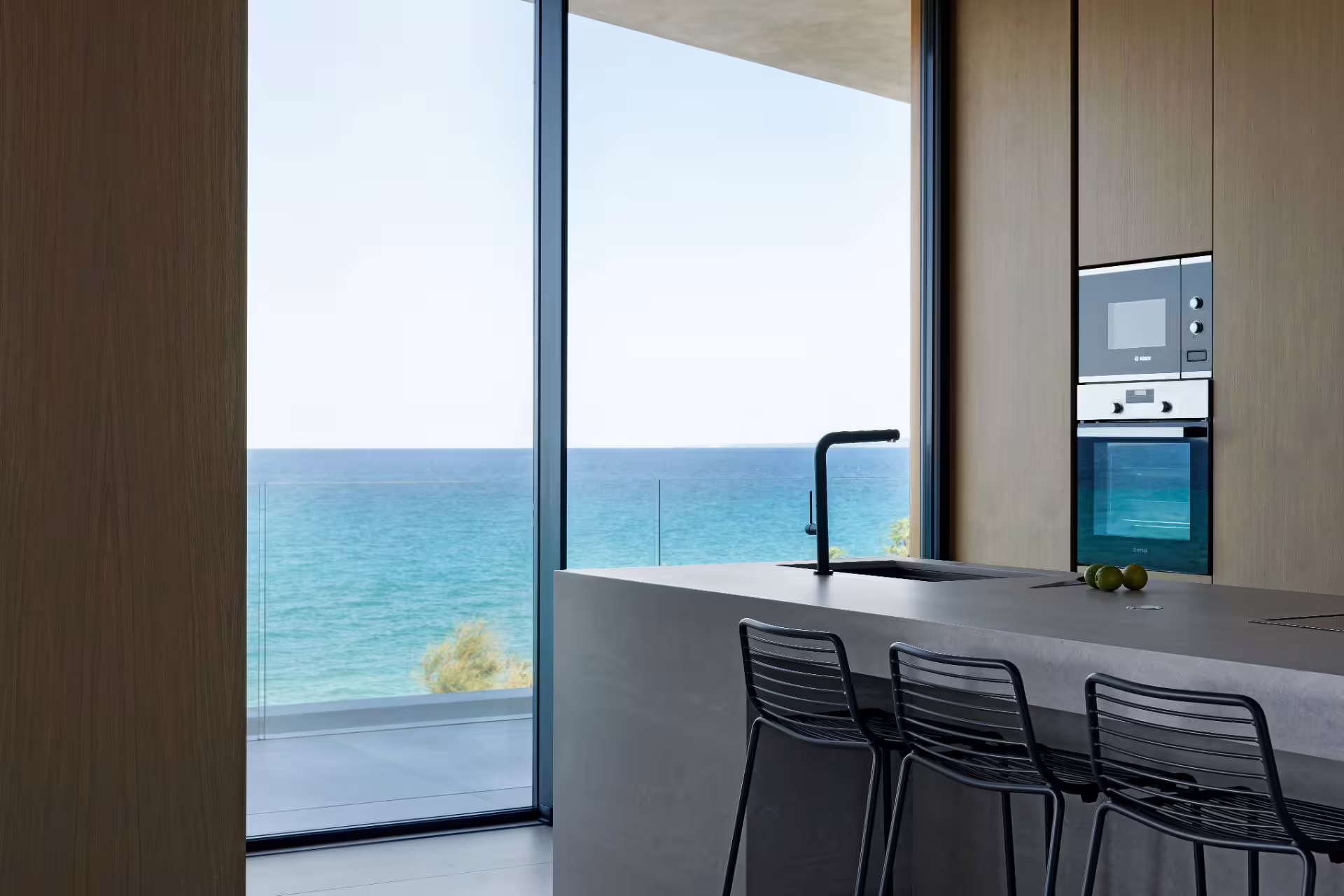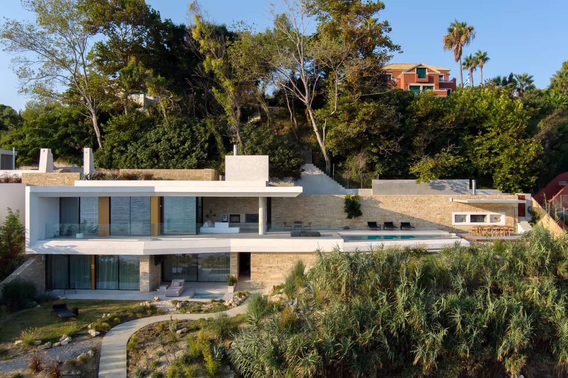 Villa Waterline II is a 210 m² waterfront retreat blending natural beauty with contemporary elegance. Designed for up to eight guests, it features four en-suite bedrooms and five bathrooms. The bright open-plan living area and fully equipped kitchen open onto sea-view terraces, creating seamless indoor-outdoor living. Three bedrooms on the ground level lead directly to the garden and private beach, while the master suite includes a jacuzzi. A fourth bedroom with balcony and sea view sits upstairs. Outside, a private pool, shaded dining area, and built-in BBQ offer the perfect setting for alfresco moments overlooking the endless Aegean horizon.