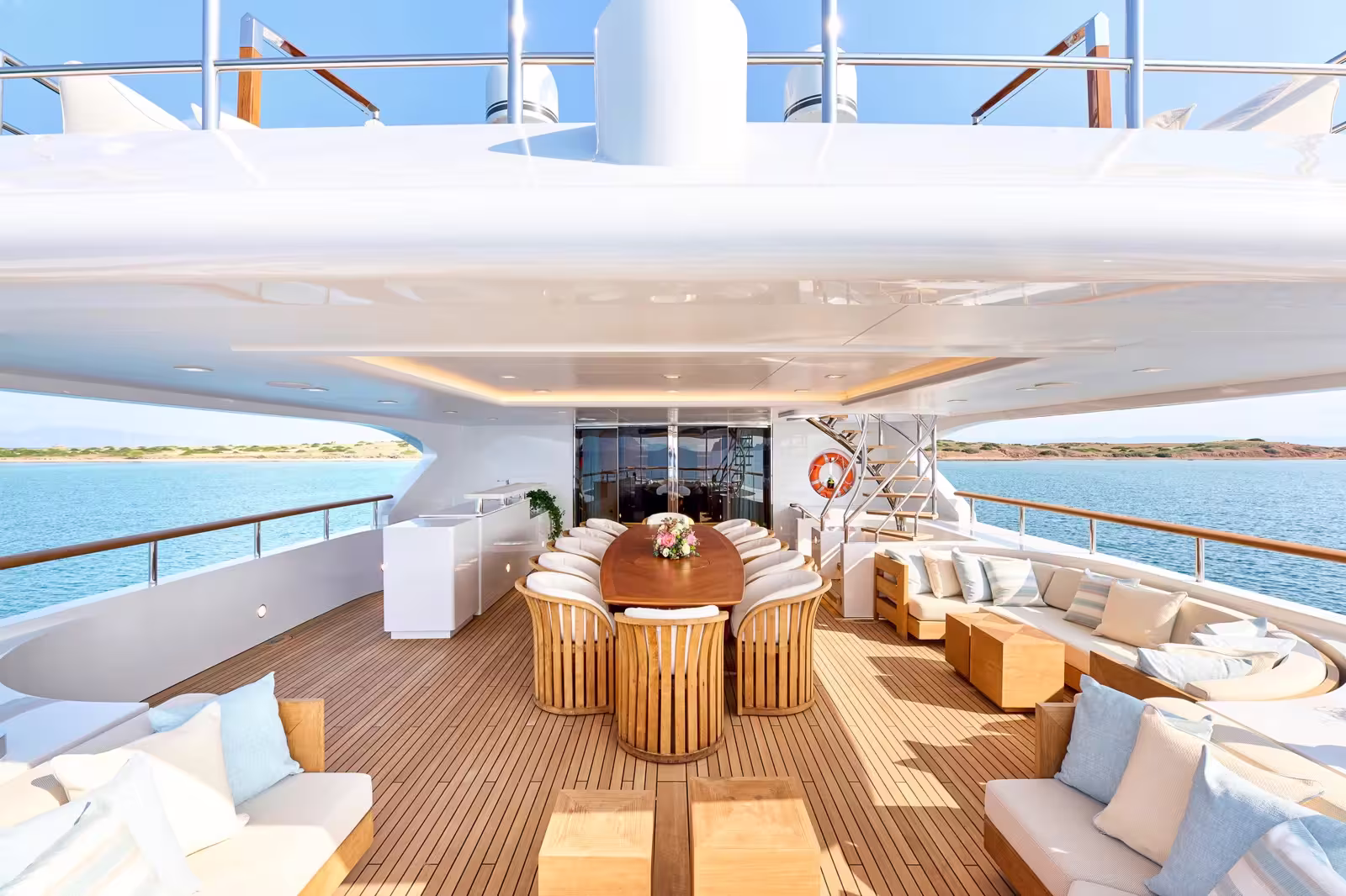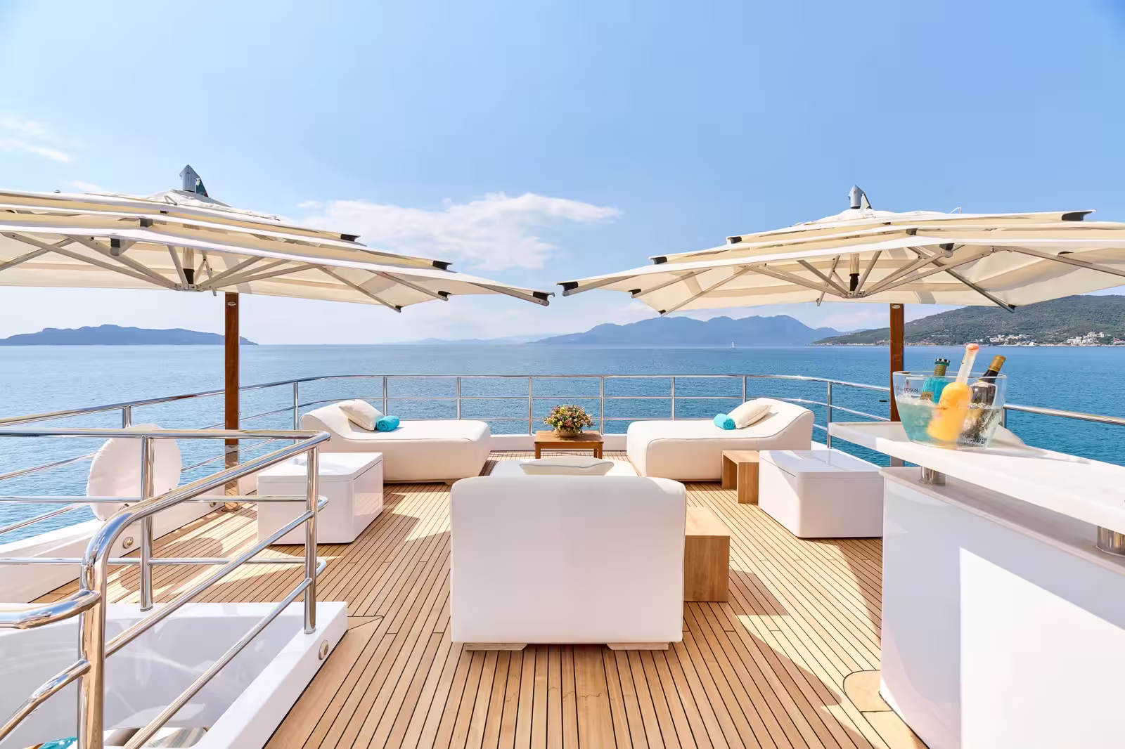 - Main Deck Aft: Relaxed lounge seating connecting directly to the main salon, offering both casual lounging and convenient access to the water via the transom.