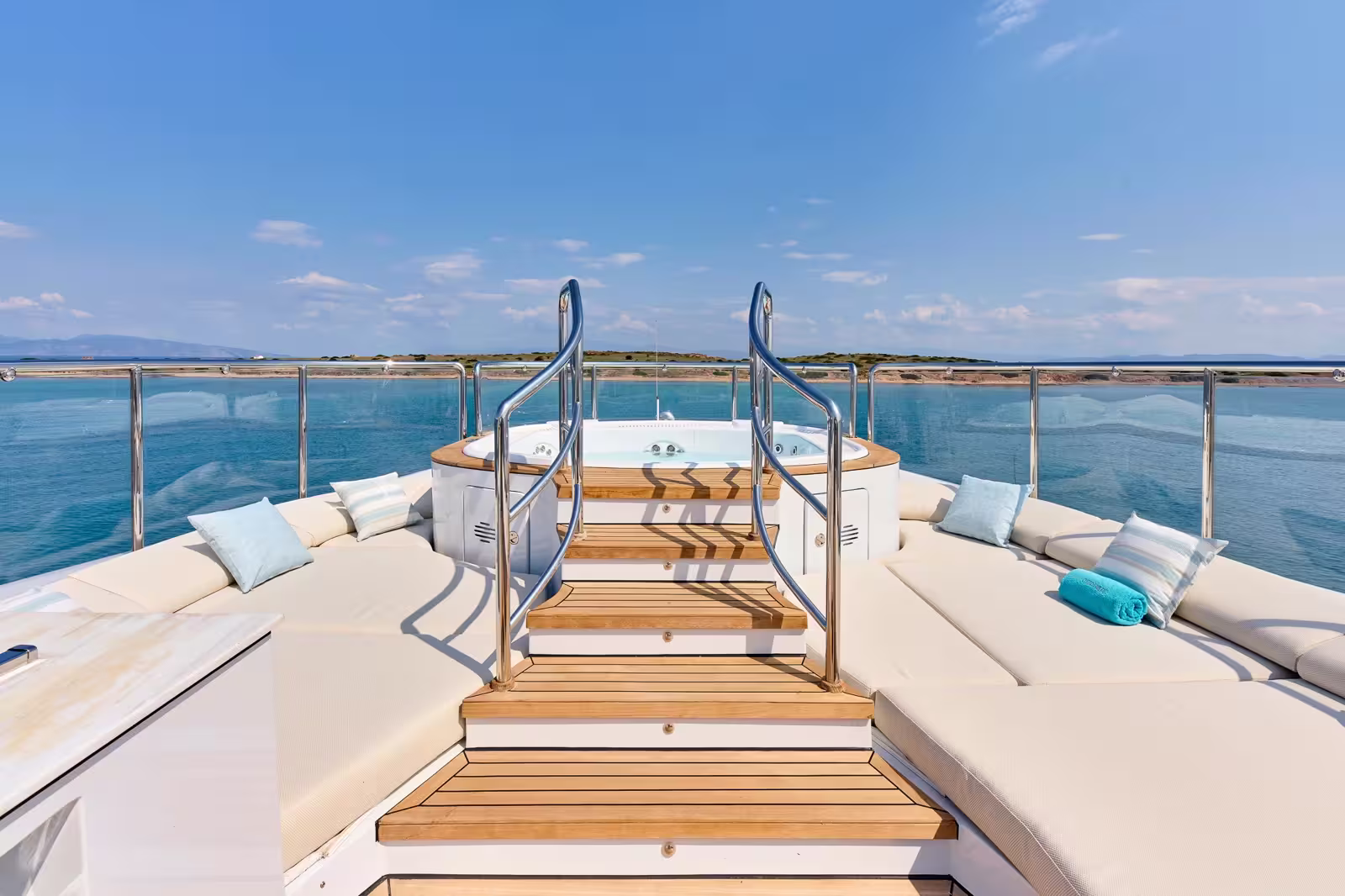 - Sun Deck: Expansive area featuring a Jacuzzi/spa pool, sun loungers and sun‑pads, a bar and shaded seating
