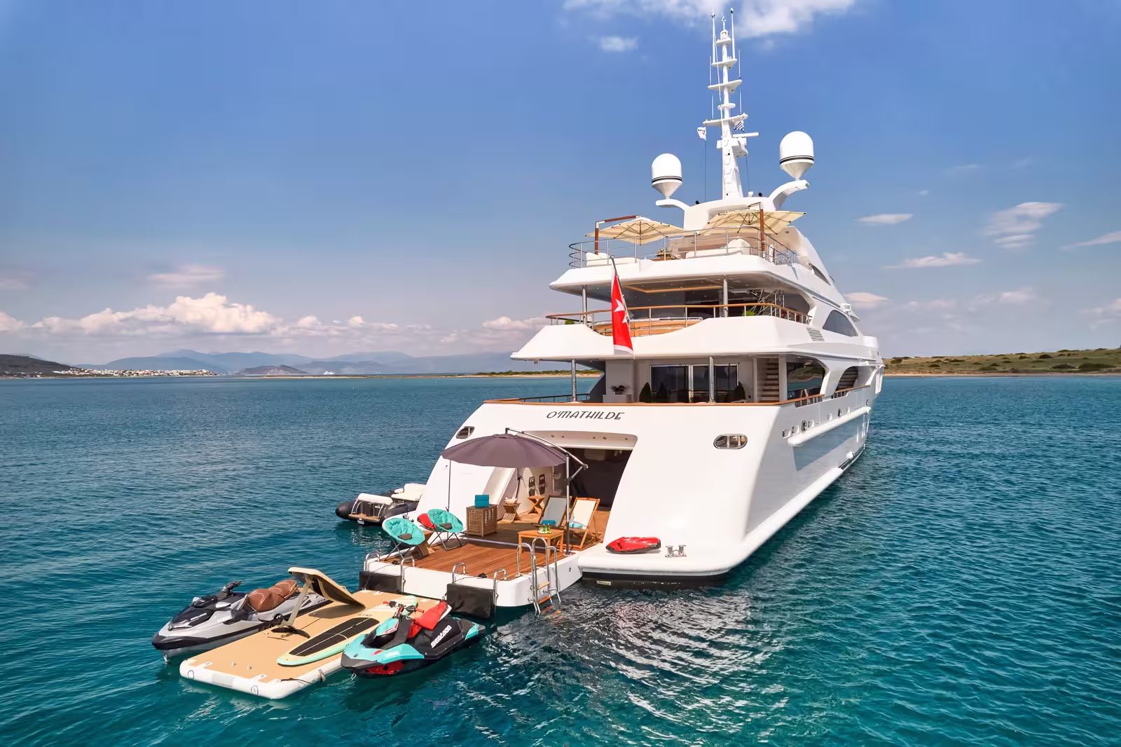 Built by Golden Yachts in 2018 and freshly repainted in 2023, O’Mathilde is a 56m tri-deck yacht offering spacious design, refined comfort, and modern elegance. She accommodates up to 12 guests in seven luxurious staterooms, including a panoramic Master Suite, a VIP on the upper deck, three doubles, and two twins – all with ensuite facilities. Her interiors feature floor-to-ceiling windows in the main salon and cutting-edge AV systems throughout. Outside, guests enjoy expansive deck spaces, a sundeck Jacuzzi, and a fully equipped open-air gym overlooking the sea. With zero-speed stabilizers, a broad selection of water toys, and a highly experienced crew of 13 led by a seasoned captain, O’Mathilde offers a seamless and elevated charter experience across the Mediterranean.